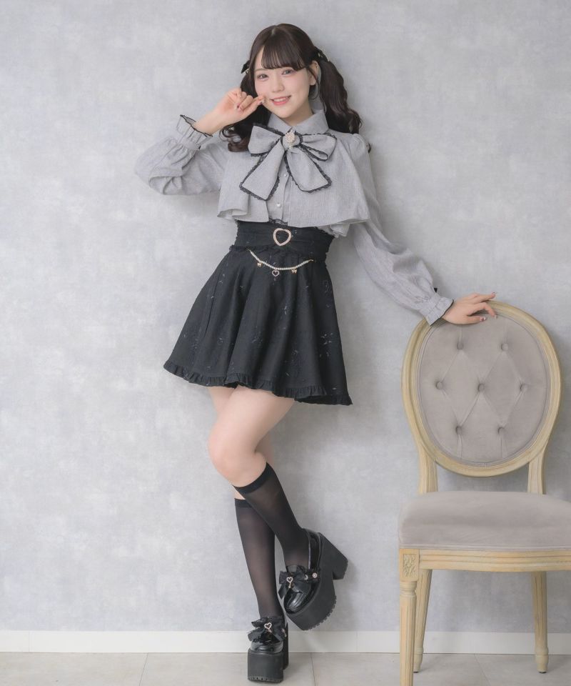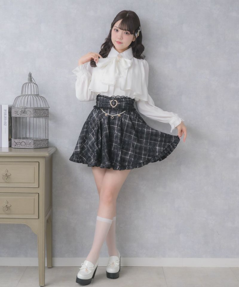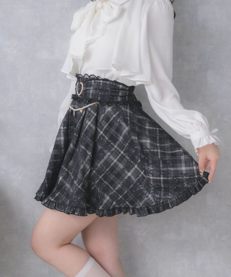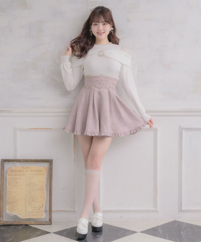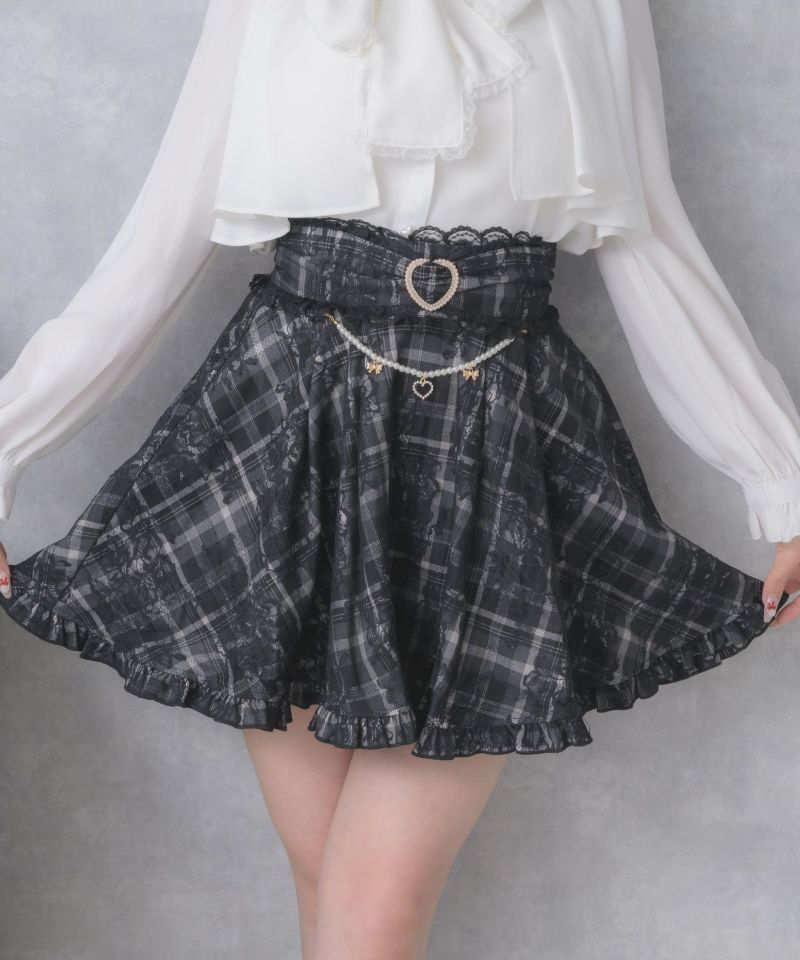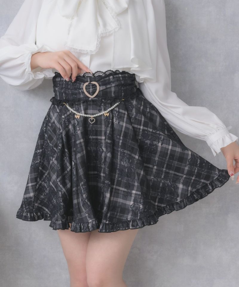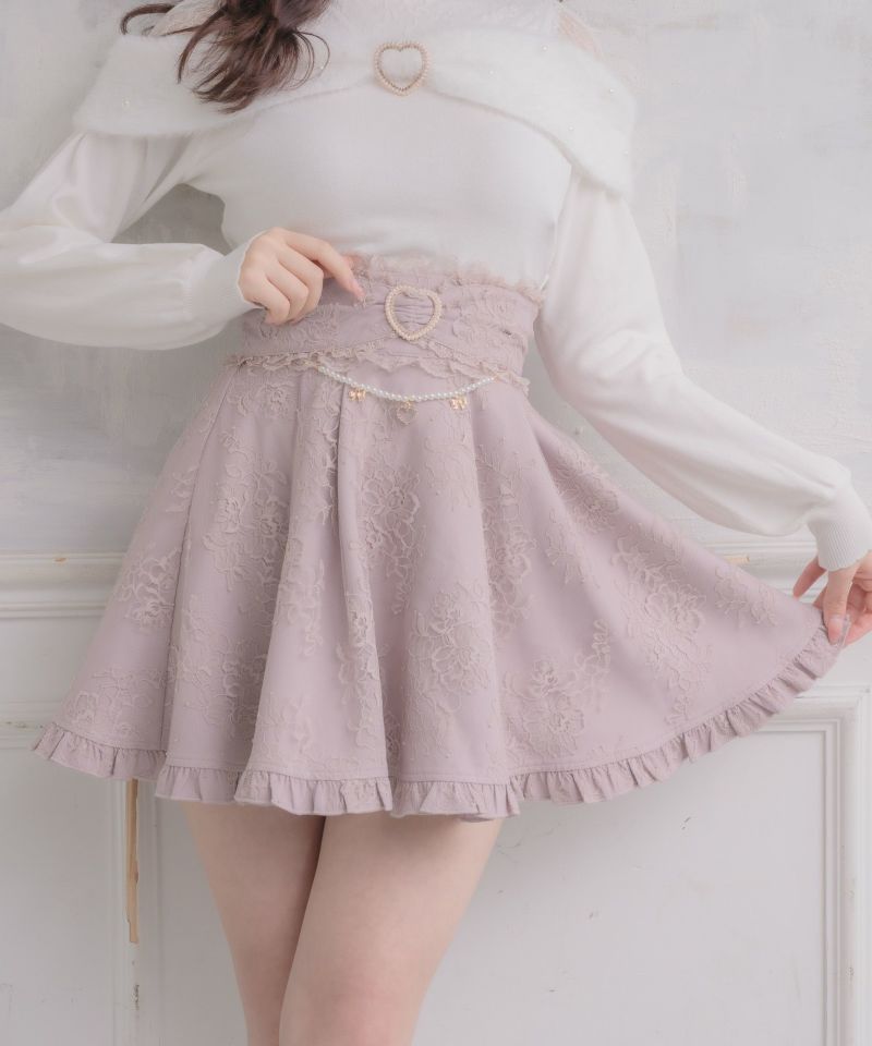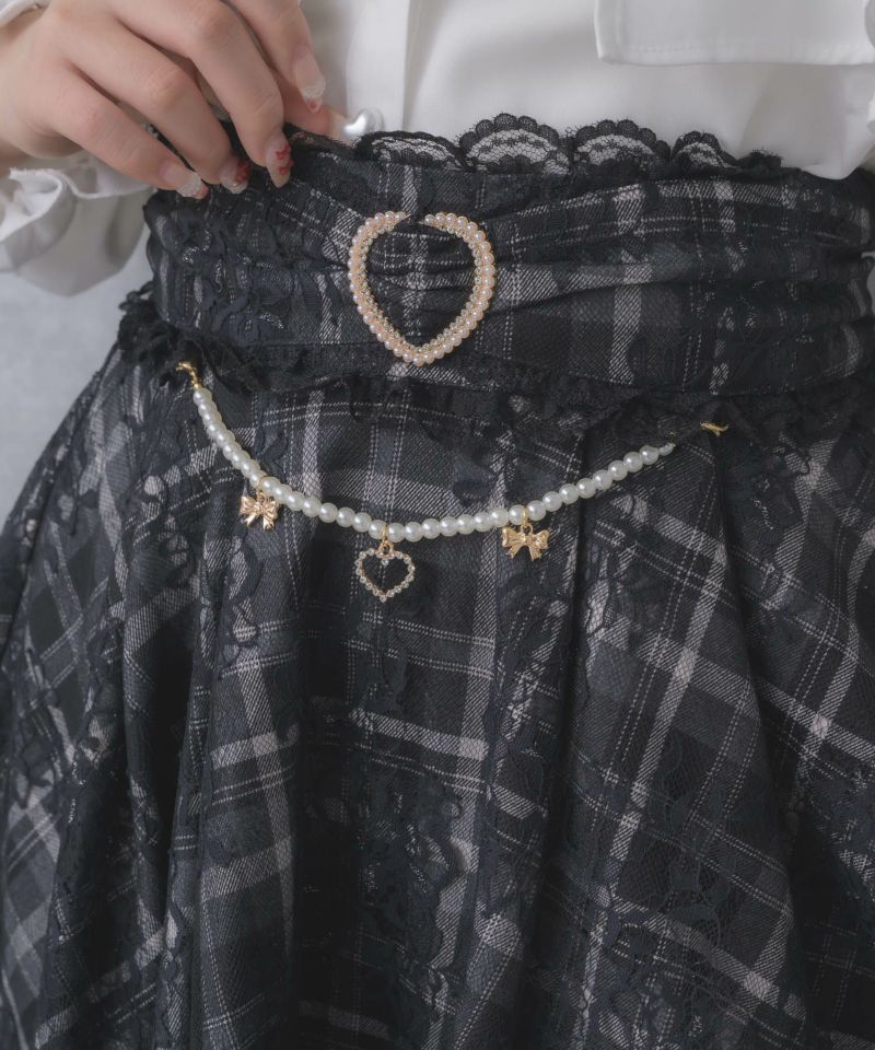 リボン見えするウエストベルトが主役のスカート。上品な総レースとハートバックルが、甘さと華やかさをプラス♡揺れるパールチェーンが、エレガントさをさらに引き立てます。フレア感たっぷりのシルエットが、レッグラインをすっきりと◎