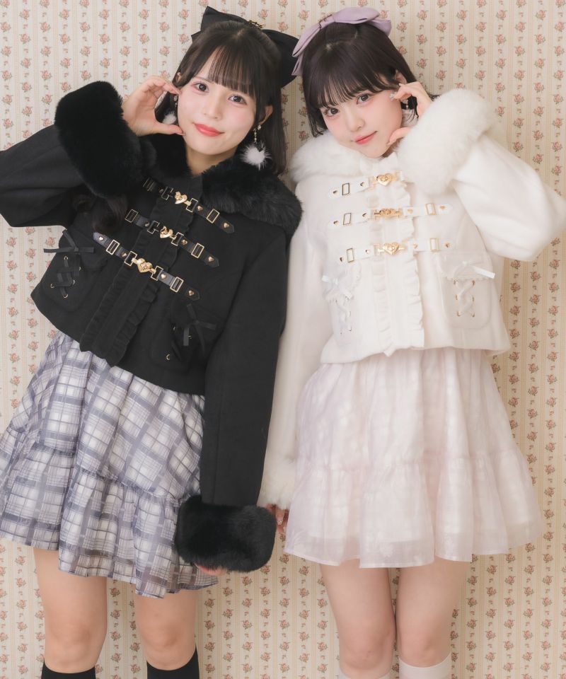 ハートのゴールドビットが煌めく、ハーネスがアクセントのダッフルコート。フラップポケットにはリボンディテールが施され、フリルトラムが更にロマンティックな要素をプラスします♡お袖のファーは取り外し可能◎フードにも付けたエコファーはボリューム満点でシーズンらしい可愛さを添えてくれます。 ※照明の関係で実際のお色味と若干異なる場合がございます。 ※表示のサイズ感と実物は若干異なる場合がございますので、予めご了承ください。 モデル身長:159cm(双子:右163cm/左162cm)