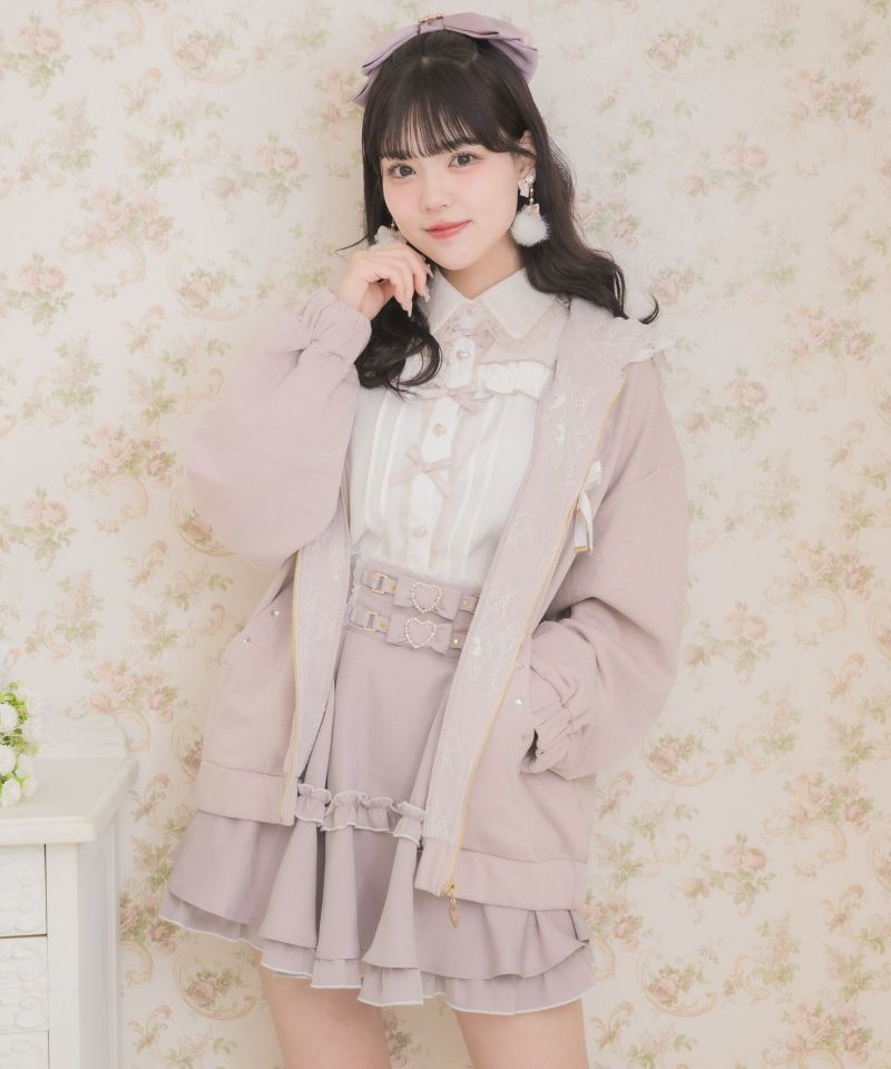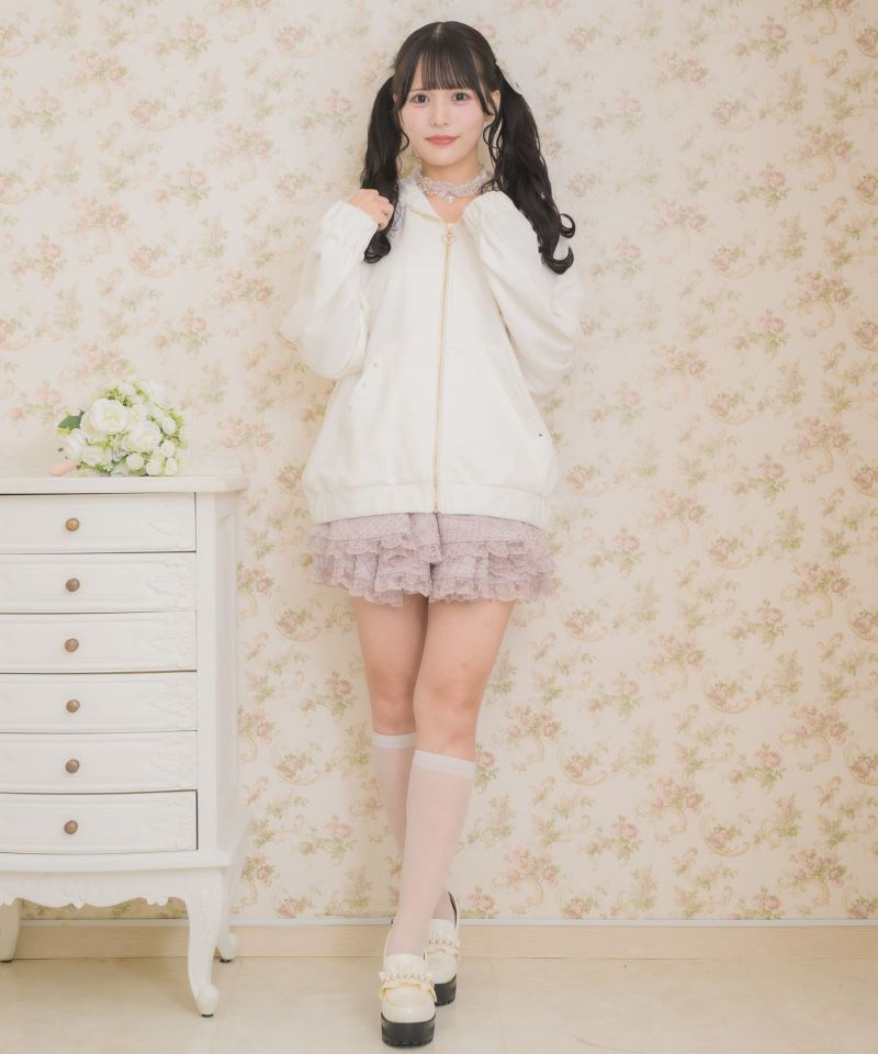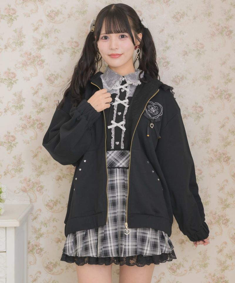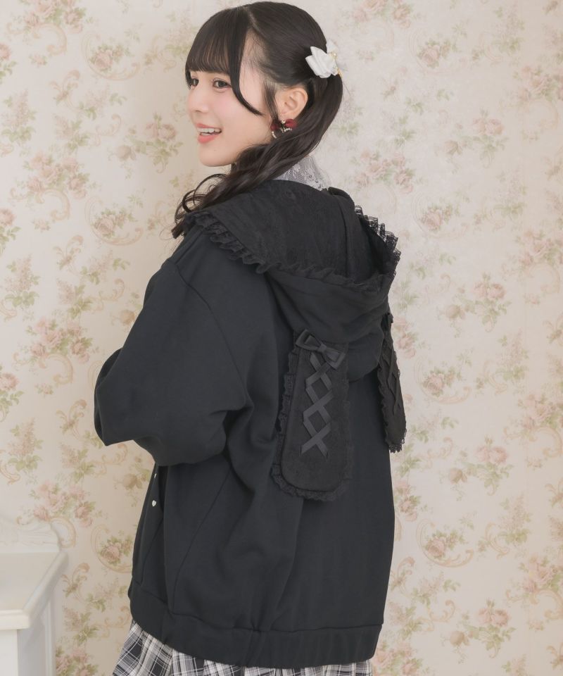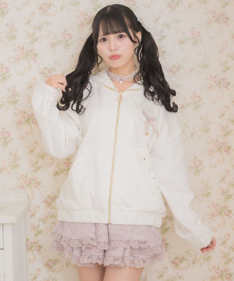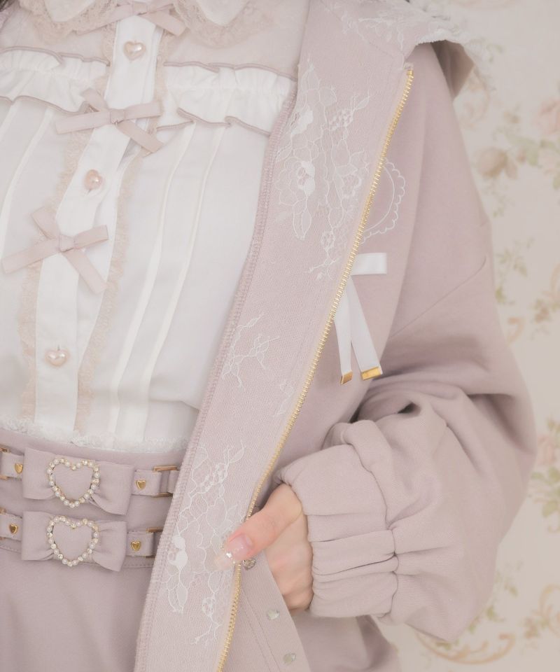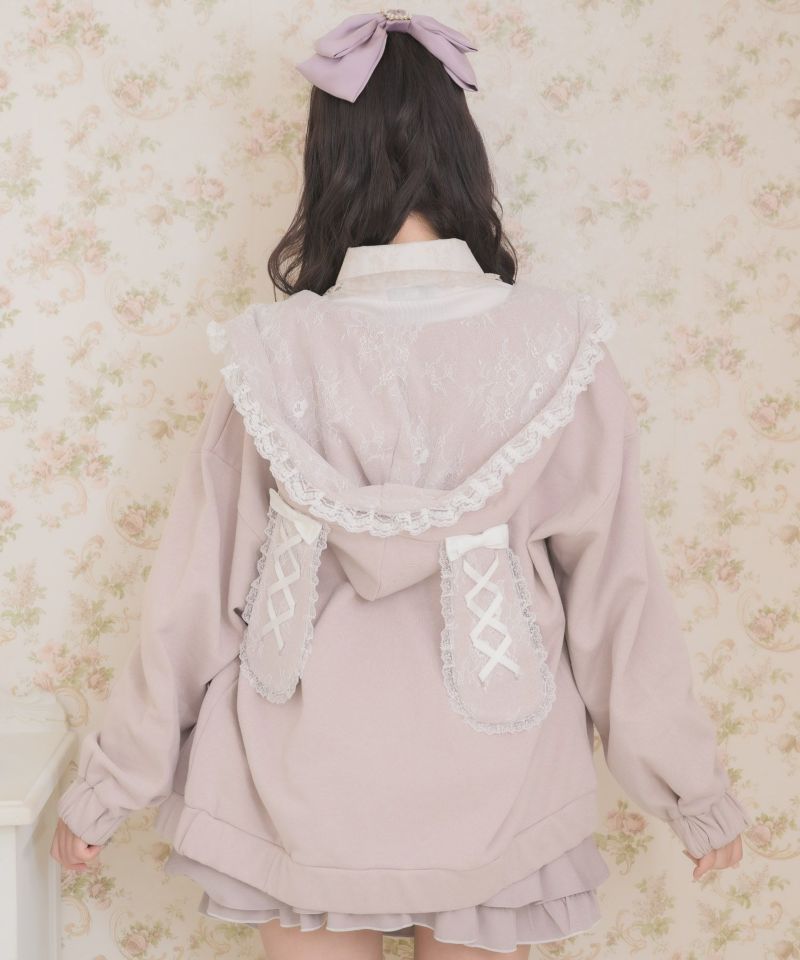 フードと見返しにレースを重ね、リボンを施したうさ耳がcute♡ちょっと大きめでヒップラインまでダボっと着られ、シルエットも愛らしさたっぷり。ポケット口にはハートのラインストーンを装飾、ロゴ刺繍が特別感を添えます。重宝すること間違いなしのアイテム◎