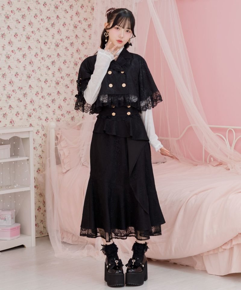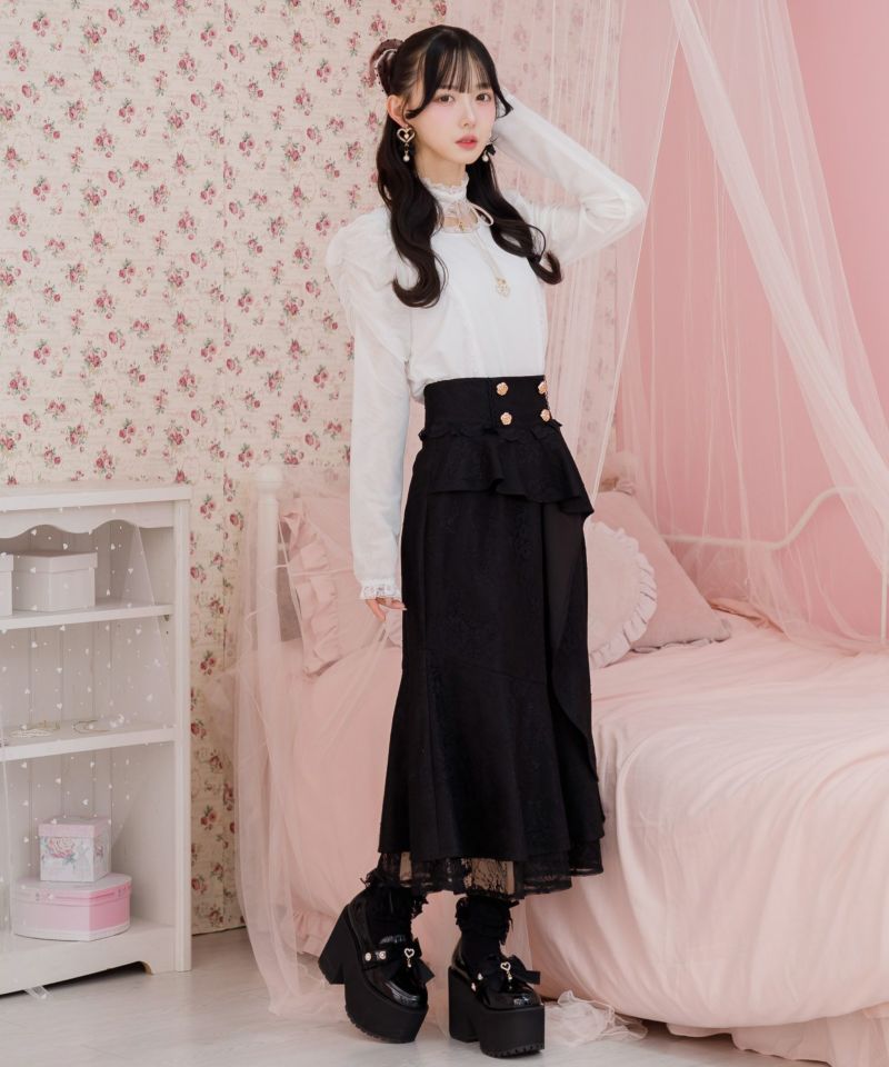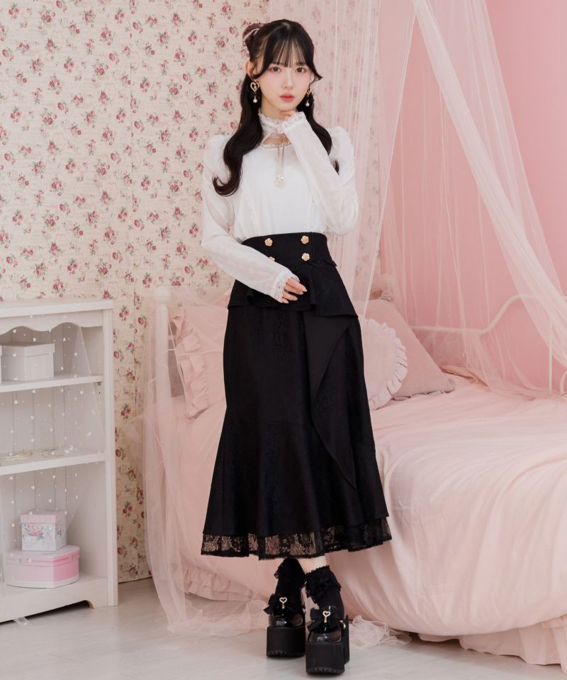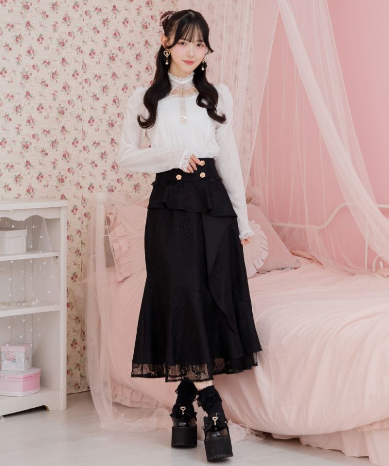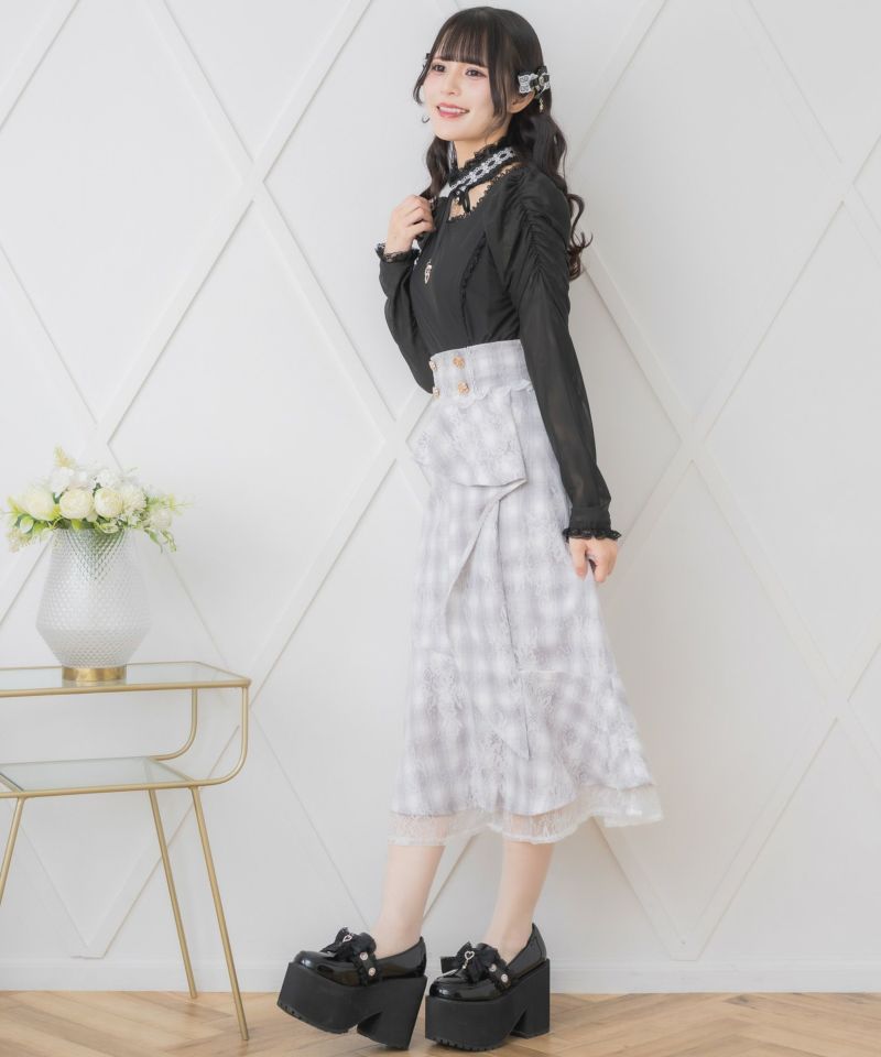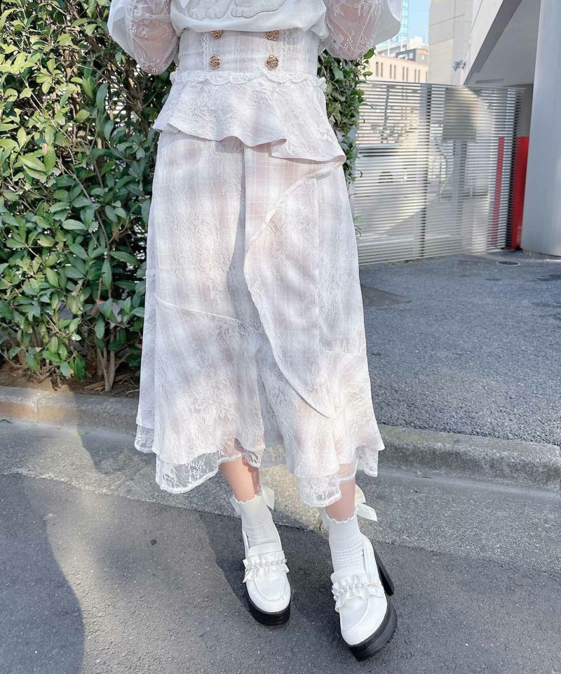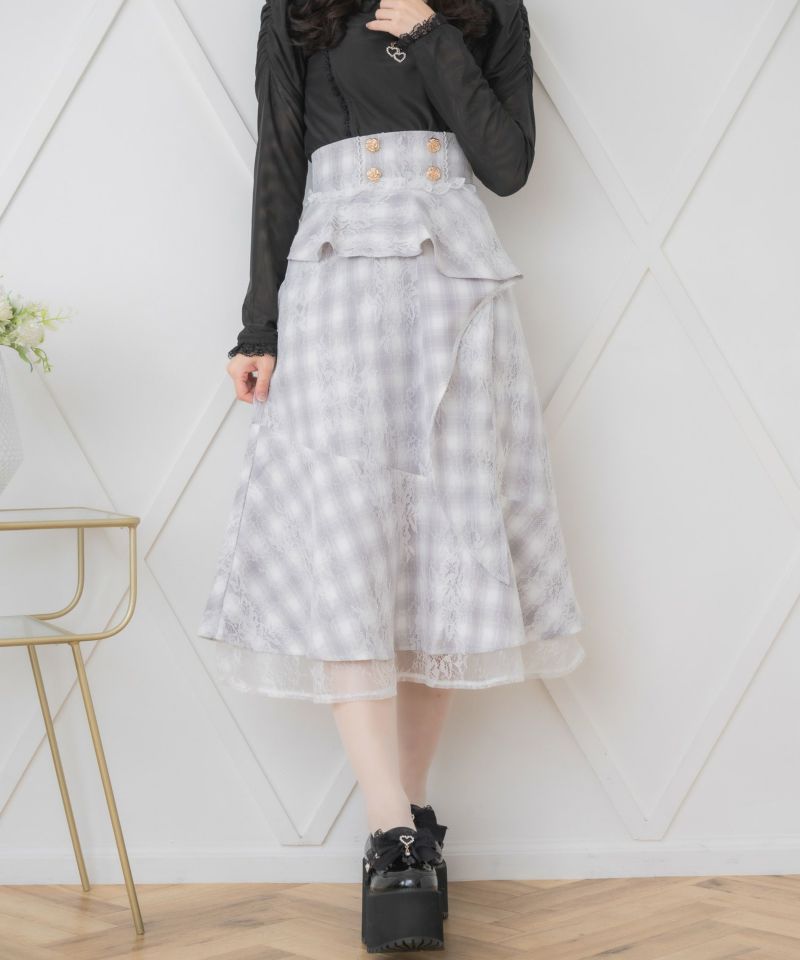 マストカラーなブラックはシンプルに、グレーとピンクはチェック柄の上にレースを重ねた一癖あるロングスカート。カラーごとで印象が異なり、ふんわりペプラムフレアが華やかに仕立て上げます。ガーリなブラウスや、Tシャツと合わせてカジュアルダウンさせても◎