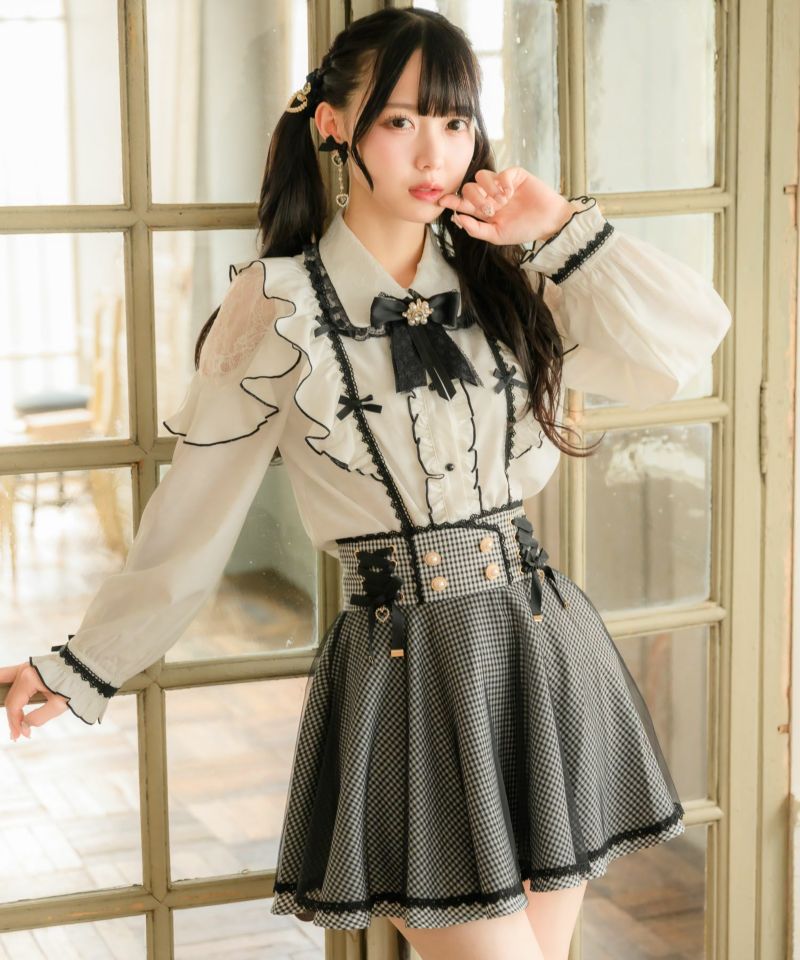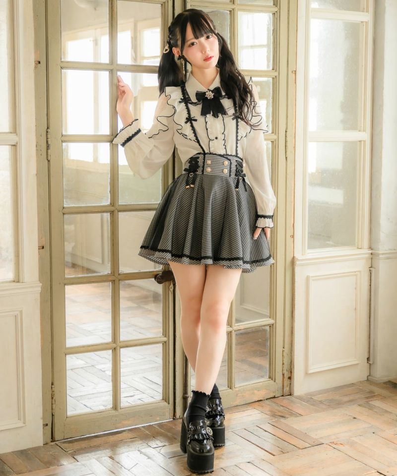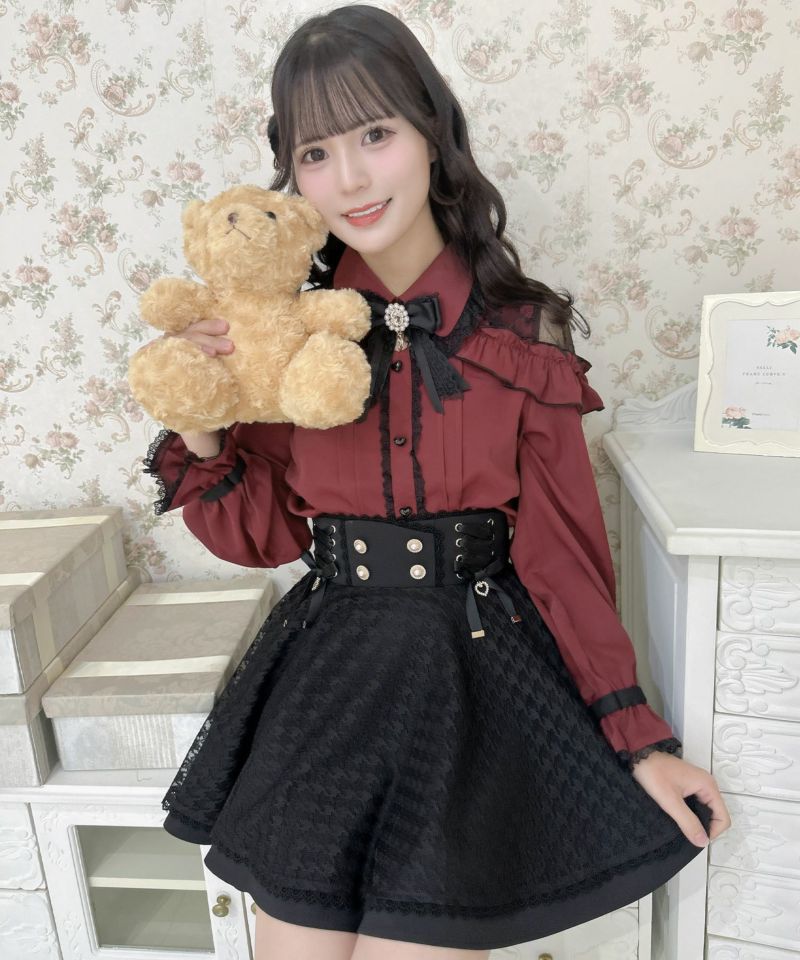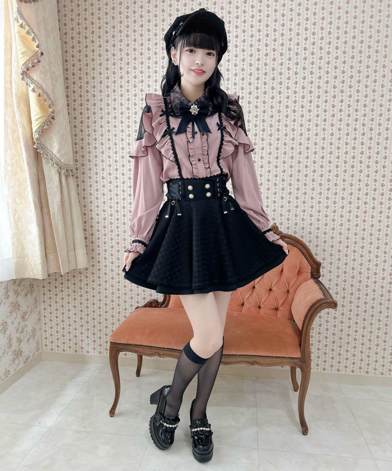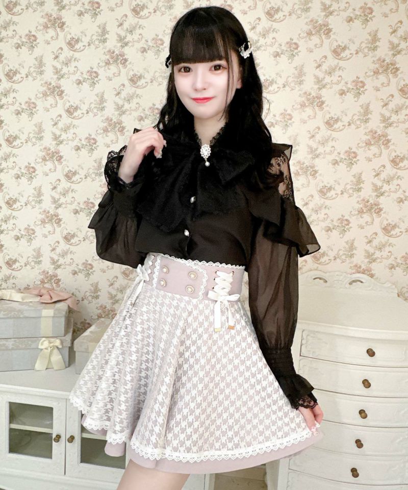 ハイウエストでスタイルアップ効果抜群、レースアップリボンが目を惹くスカート♪スカートの上に透け感のあるチュールを重ね一癖のあるデザイン。チュールがふわっと歩くたびに表情を作り、広がりのあるフレア感で王道ガーリーコーデの完成です◎