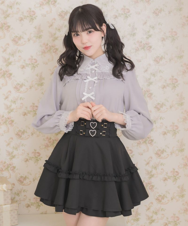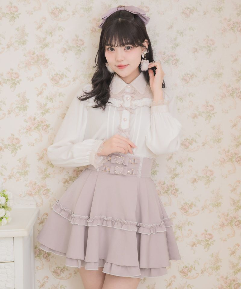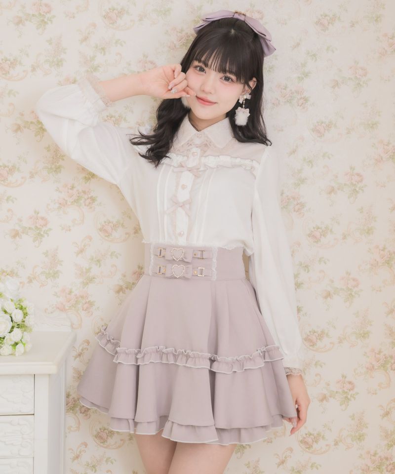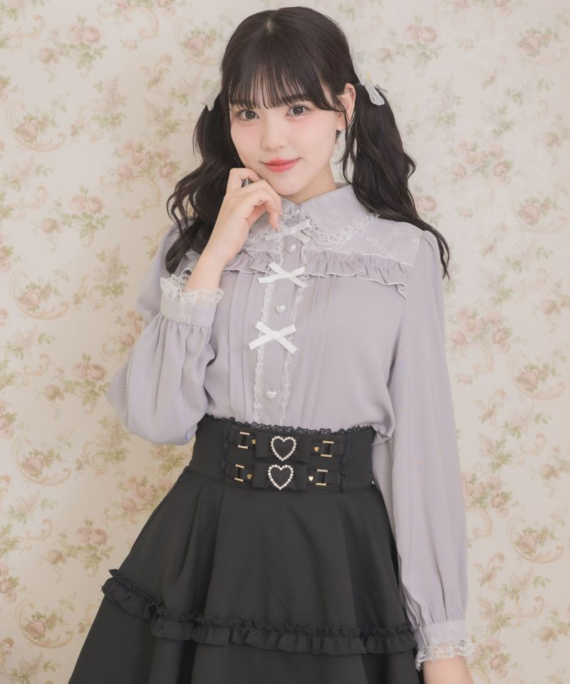 衿とヨークのレース使いが華やかに着飾るブラウスのお目見えです。ロマンティックなハート釦との間にリボンを並べ、ピンタックが縦のラインを強調しスタイルアップを促します♪レースとディテールの色味を揃えたことでスタイリングしやすく設計♡淡い色味のバランスが好印象なアイテムです。 ※照明の関係で実際のお色味と若干異なる場合がございます。 ※表示のサイズ感と実物は若干異なる場合がございますので、予めご了承ください。 モデル身長ブラック162cm/パープル・ホワイト163cm