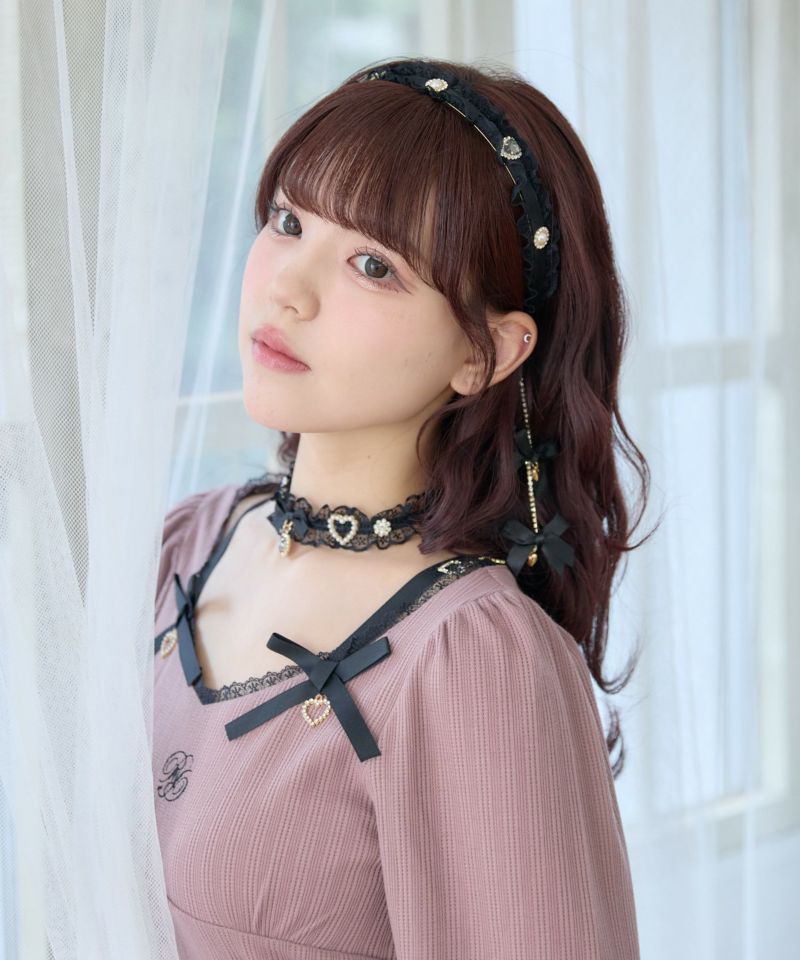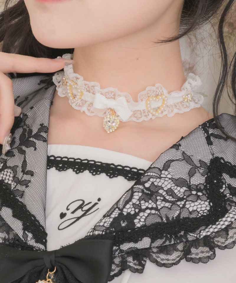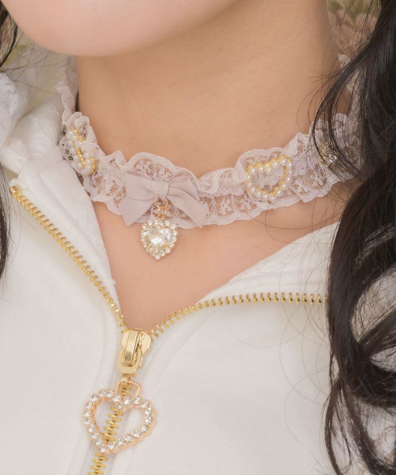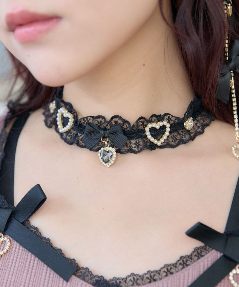 顔周りを華やかに演出してくれるレースチョーカー。透け感のあるレースで抜け感も♪メインのリボンにはキラッと可愛いハートのビジューが付いており、サイドの装飾もゴージャス感UPして煌びやかに◎デコルテがざっくり開いたトップスやミニスカートとの相性抜群!