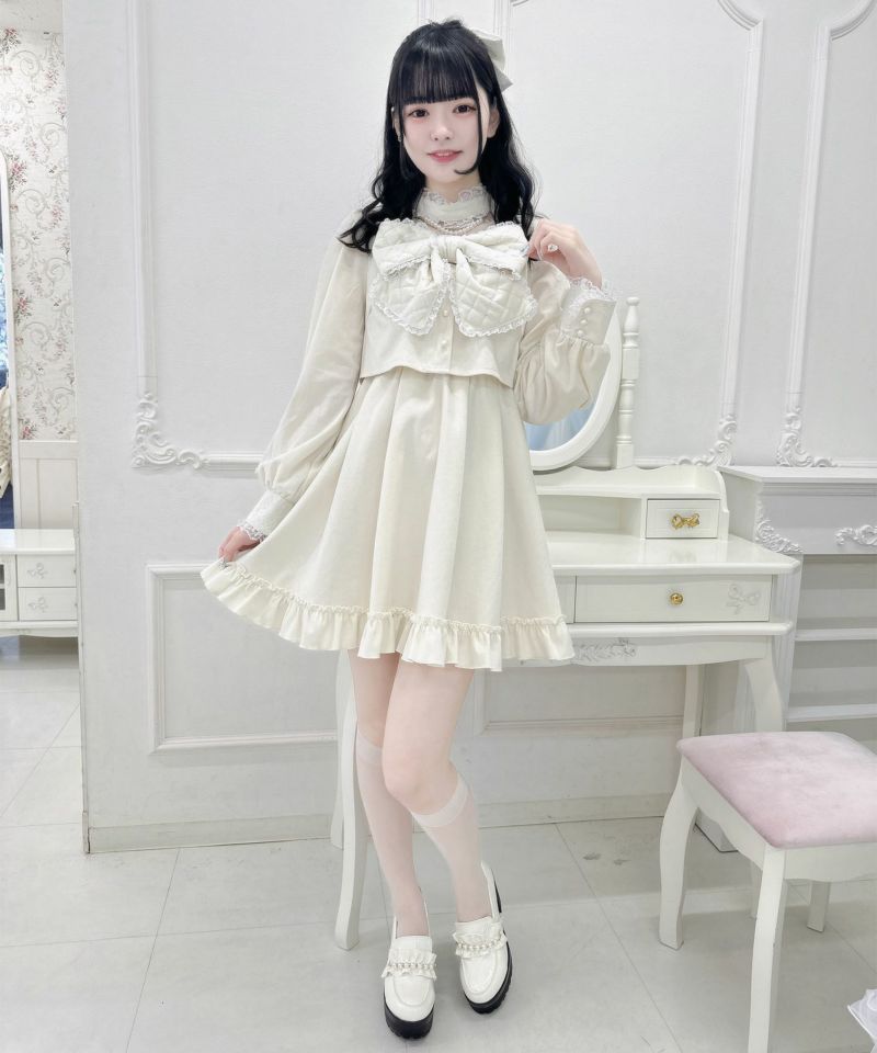 スパンコールを散りばめたキルティングのリボンが可愛い♡上品で高見えのできるウィンターワンピースのお目見えです。BIGリボンとレースで抜け感をプラスするデコルテにはパールのチェーンの装飾をON、お顔周りを華やかにメイクアップしてくれます。お呼ばれシーンにも活躍してくれそう♪