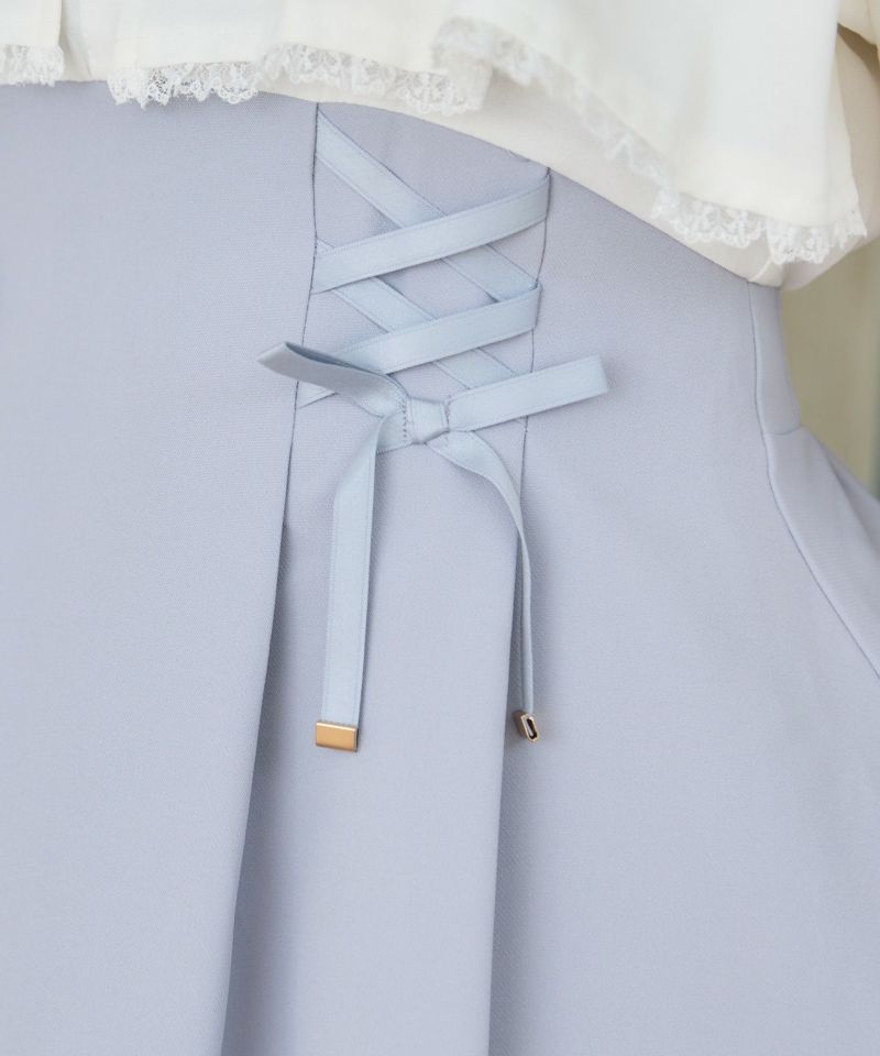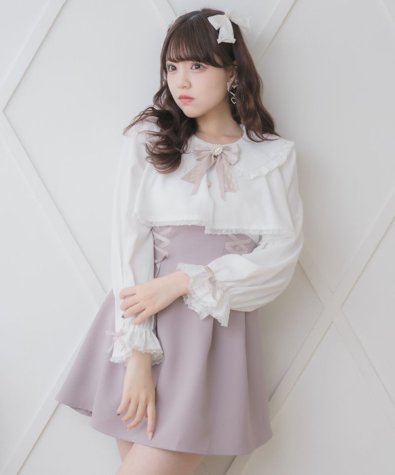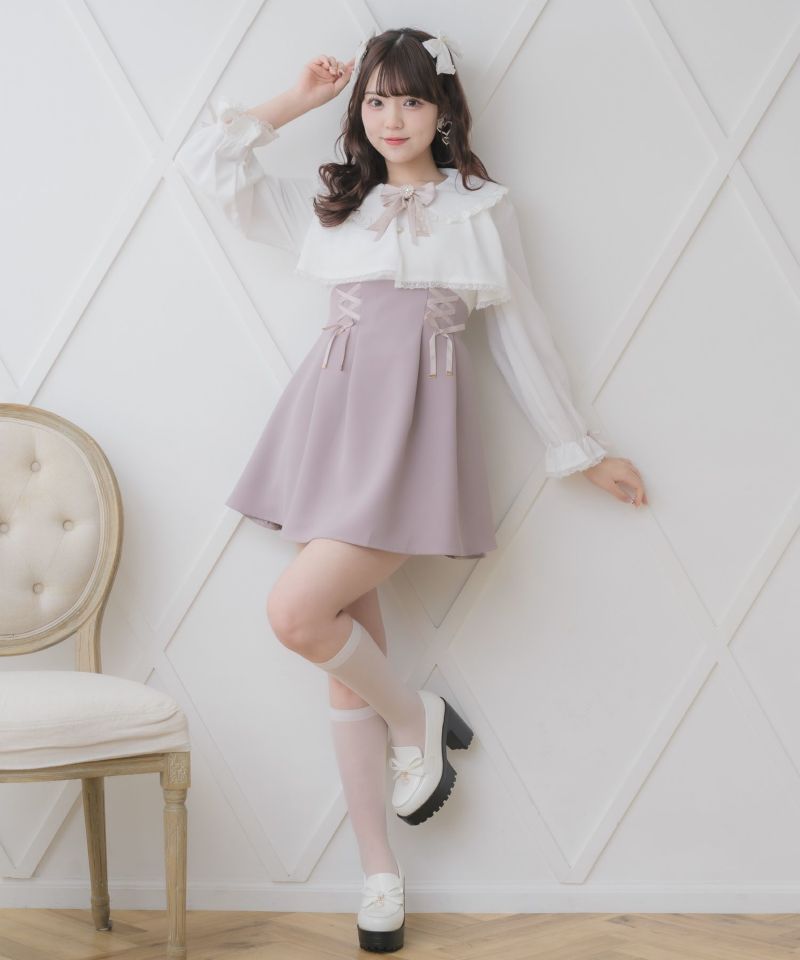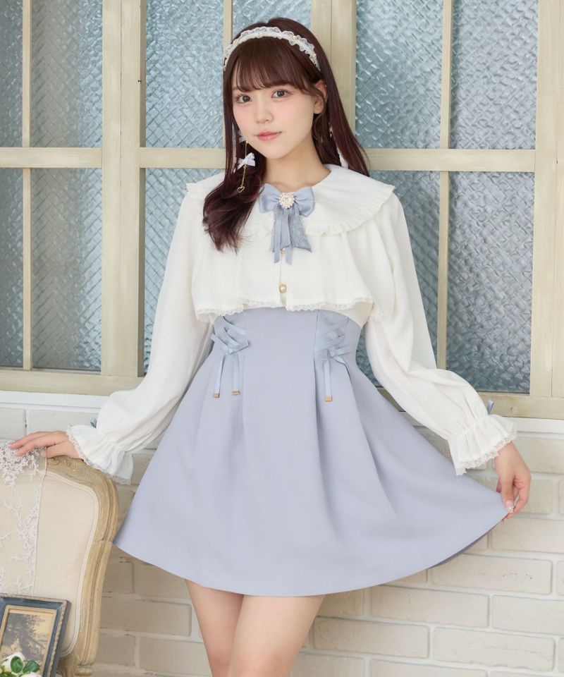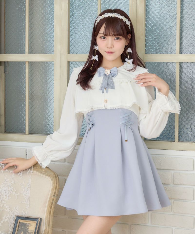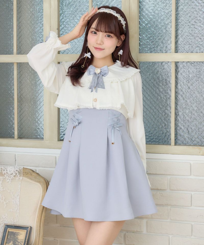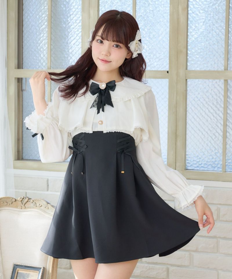 特徴的なヨークフレアが目を惹くデザイン♡新鮮なムードのなかで、レースアップが女の子らしい甘い雰囲気をプラスします。ウエストを細見えしてくれる設計で好バランス◎丸襟とハートのビジュ付きリボンがガーリーニュアンスを加速します。