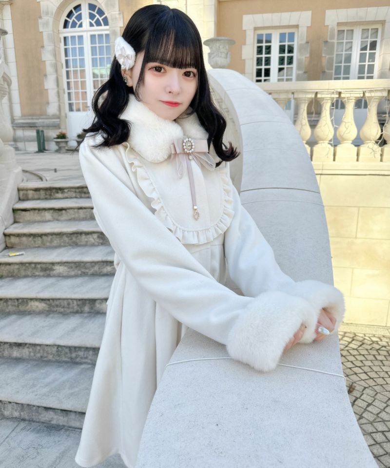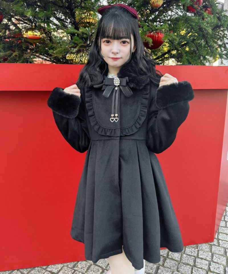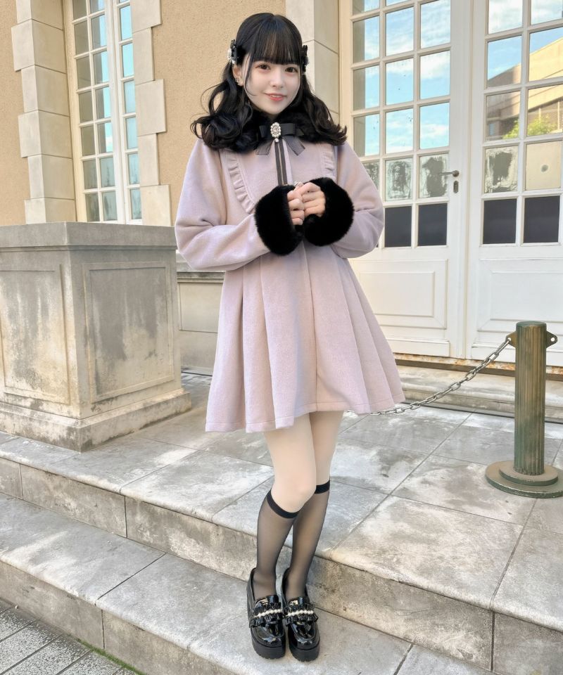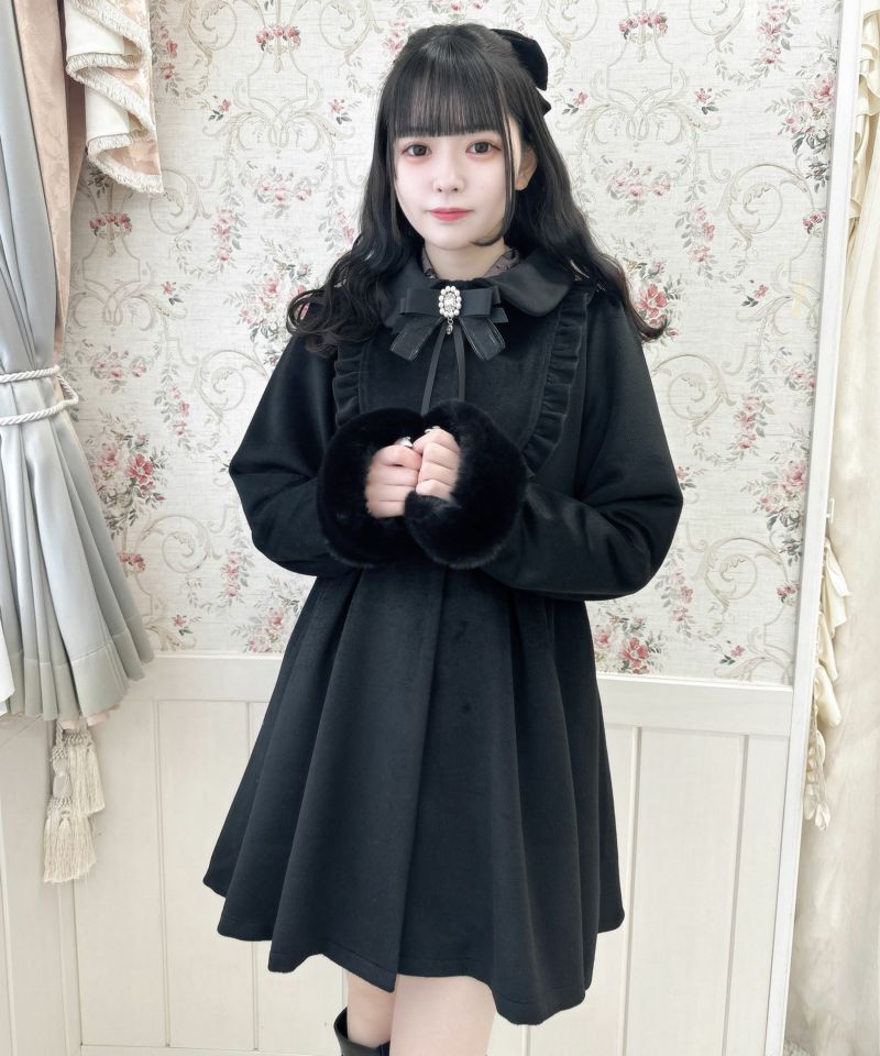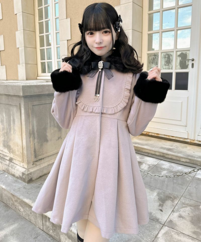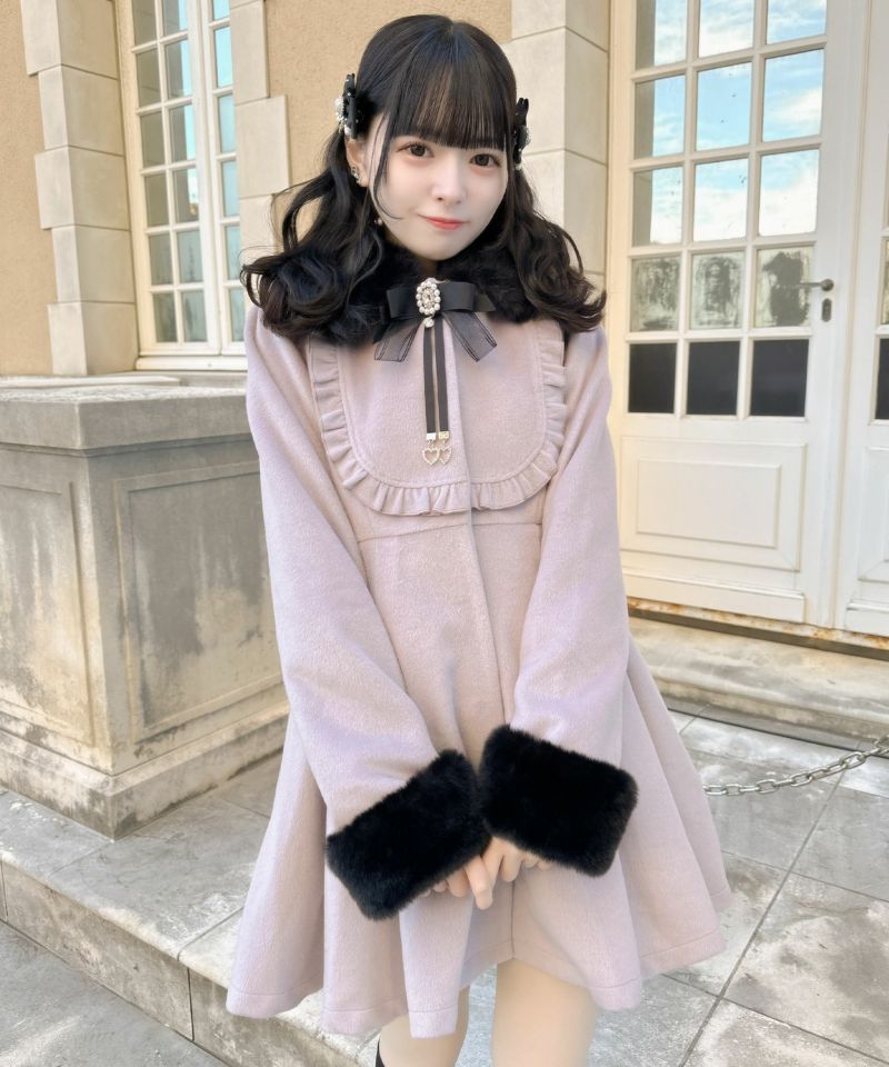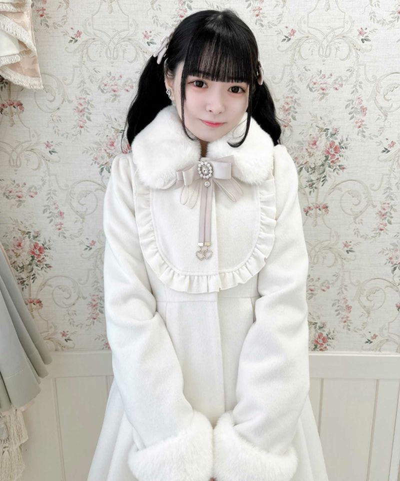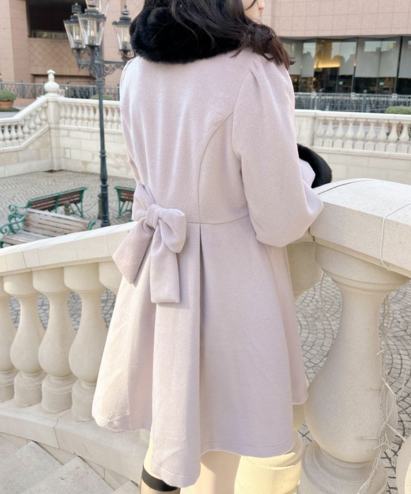 ドーリーなヨークフリルと、バックリボンが可愛いウィンターコート。ブローチにはきらきらと光るハートのビジューがON、揺れるチャームがさらに品良く映えてくれます♪衿のファーは取り外し可能◎定番カラーのブラック・ホワイト、コントラストが目立つバイカラーのピンクの3色展開です。