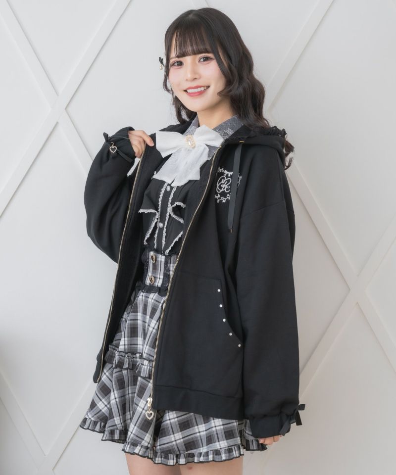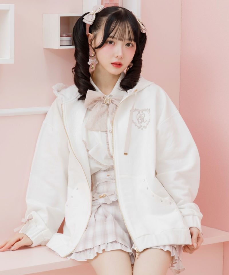 お耳についたリボンがcute♡羽織に便利なパーカーのお目見えです。フードと見返しにレースを重ね鮮度UP♡ちょっと大きめでヒップラインまでダボっと着られるのも嬉しいポイントです。ポケット口にはラインストーンを装飾、ロゴ刺繍も可愛い一押しアイテム。 ※照明の関係で実際のお色味と若干異なる場合がございます。 ※表示のサイズ感と実物は若干異なる場合がございますので、予めご了承ください。 モデル身長ホワイト159cm
