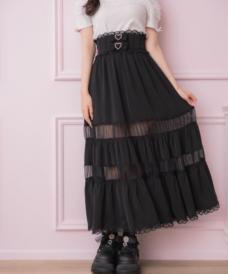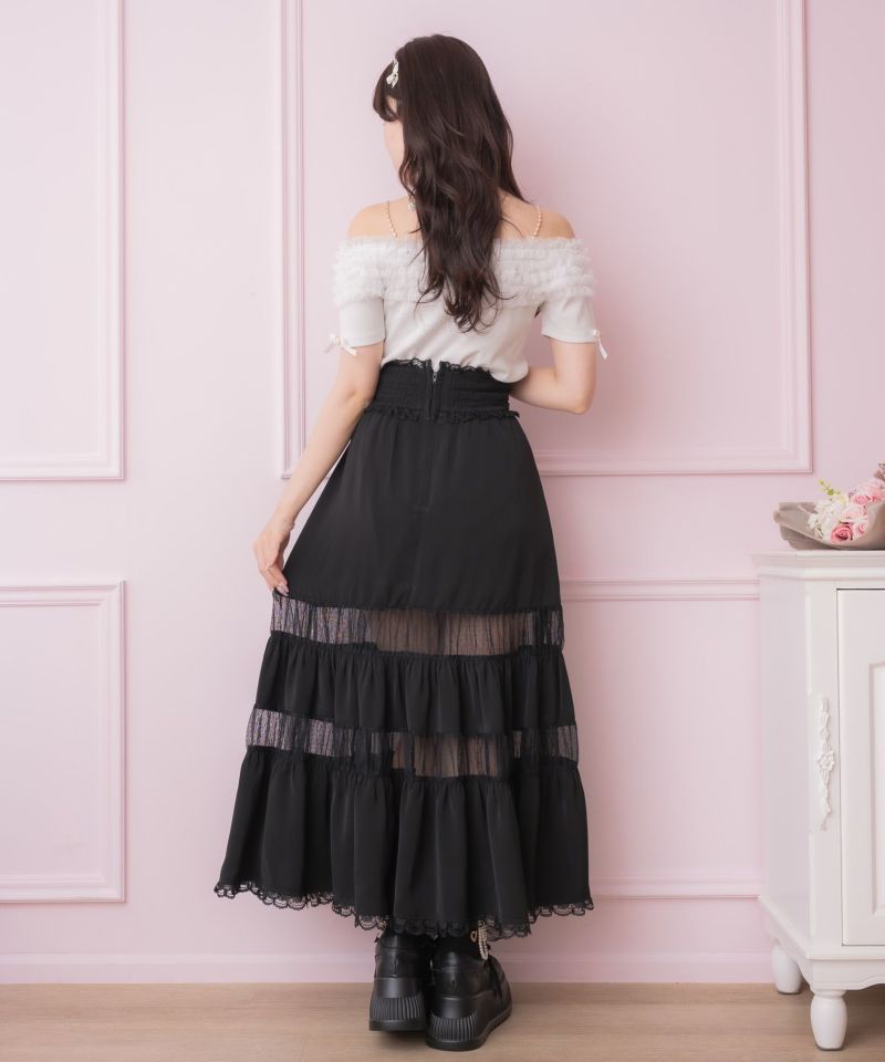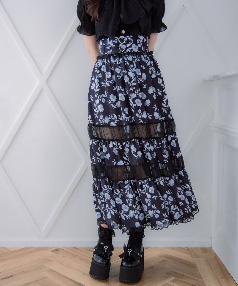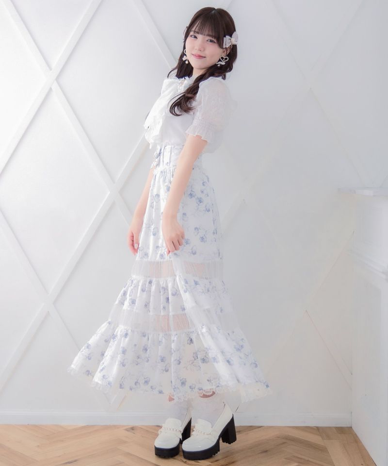 華美な花柄がコーデの主役に♡ドットと花柄をMIXさせたロングスカートのお目見えです。フレアシルエットで表情豊か、シアーから程よくレッグラインが透けて軽やかな印象を与えます。ウエストベルトのリボンがROJITAらしいディテールポイント♪