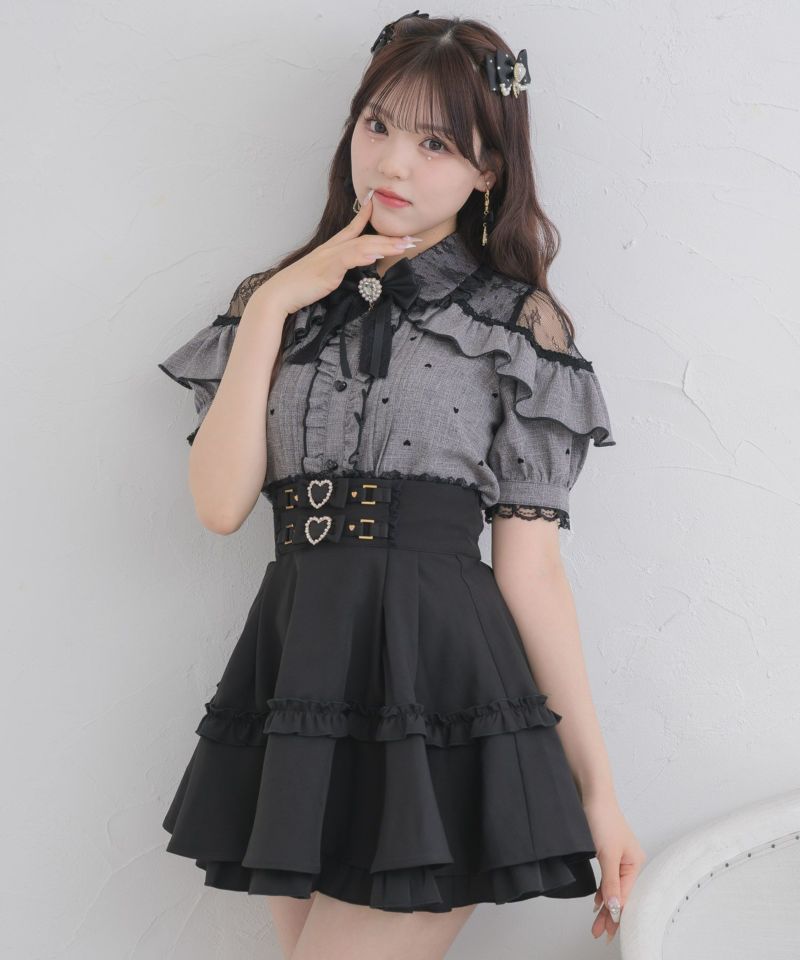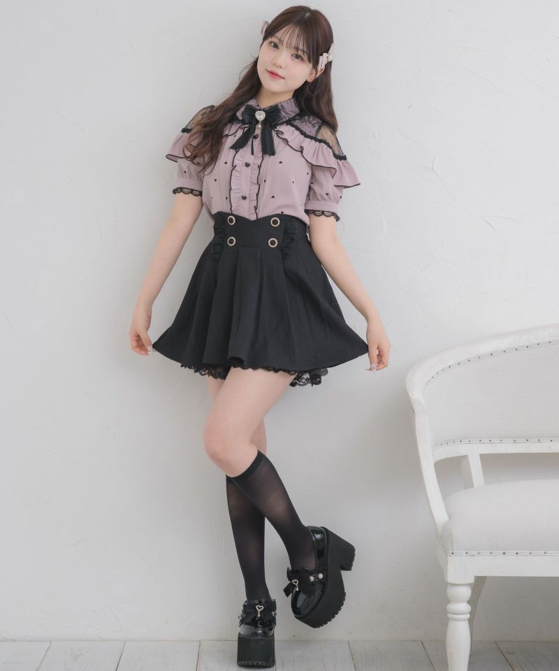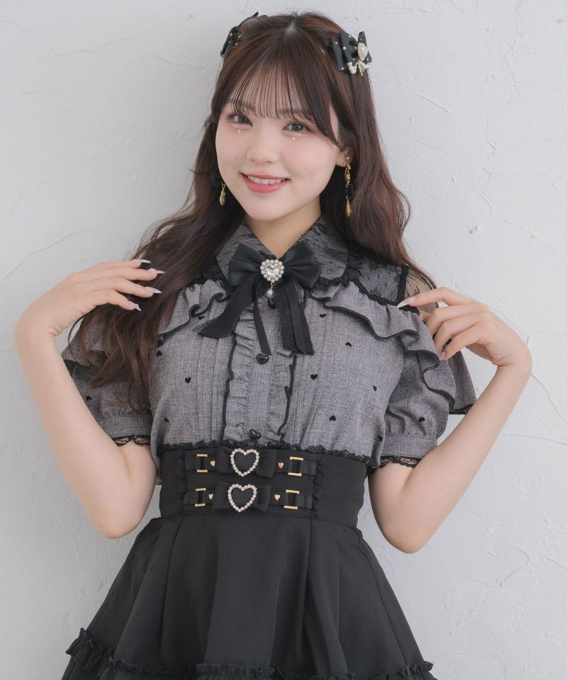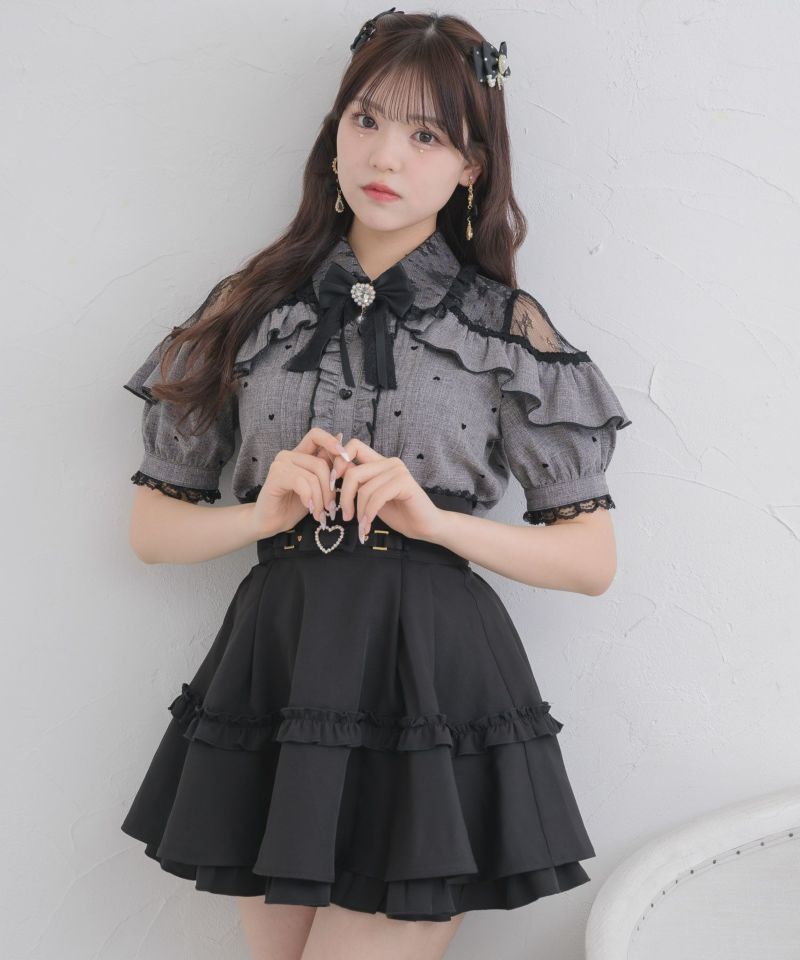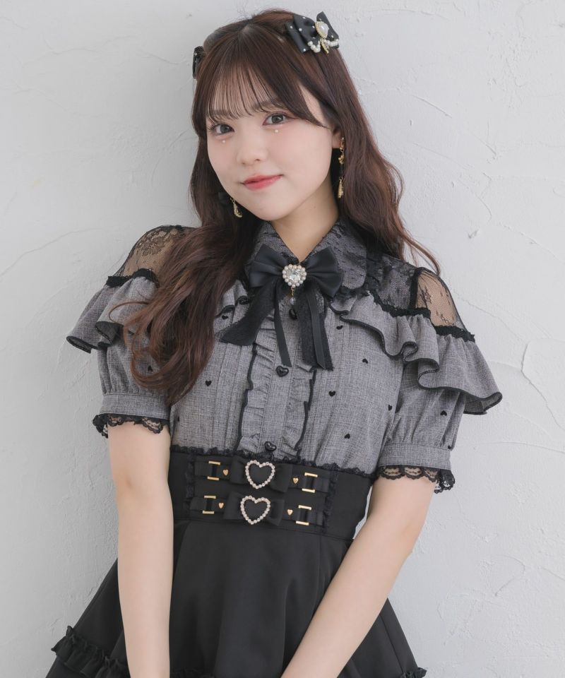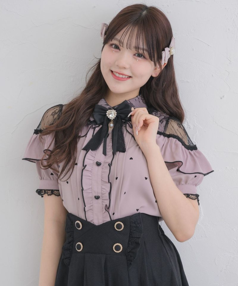 ハートフロッキーが可愛いブラウスの半袖バーションがお目見えです♡コーデの主役になるマテリアルがロマンティックな雰囲気をON。程よくレーシーなショルダーデザインがヘルシーな肌見せを叶えます。コロンとしたハートの釦が更にガーリー要素をプラス♪