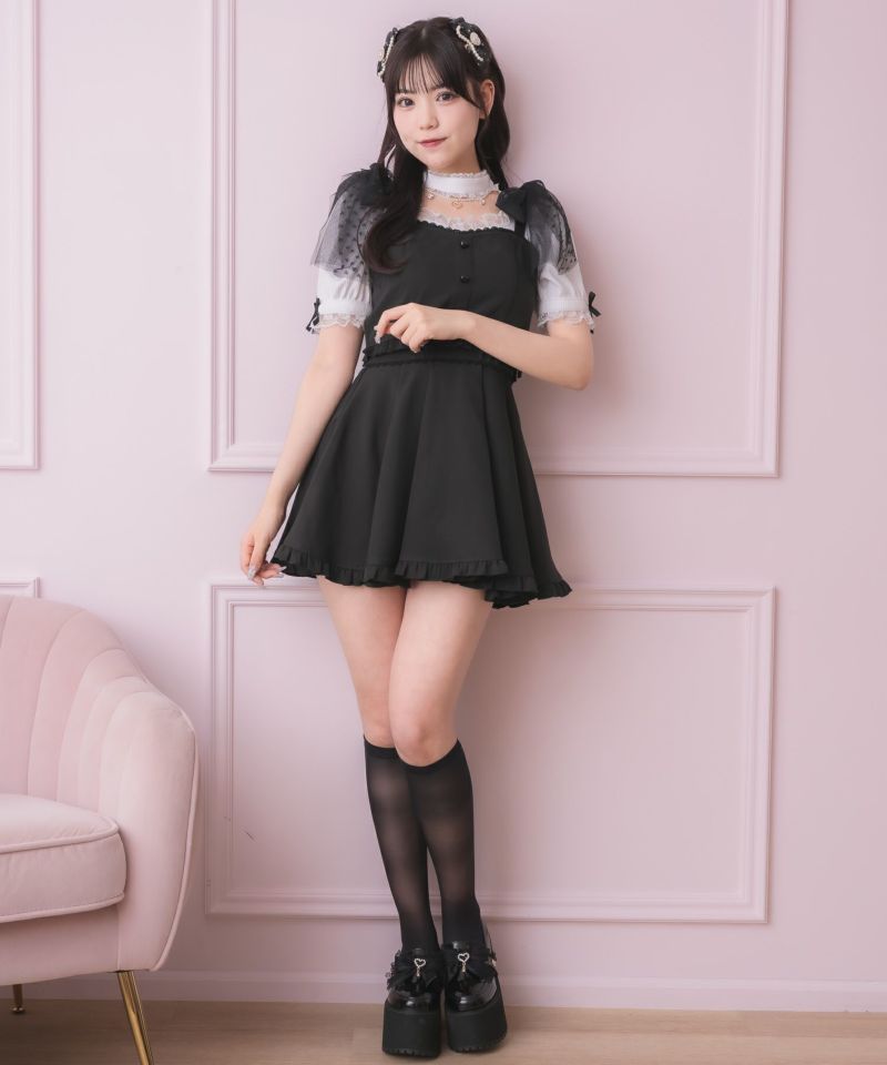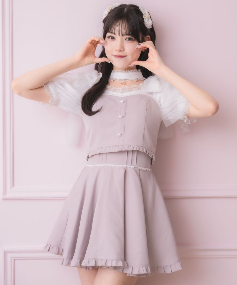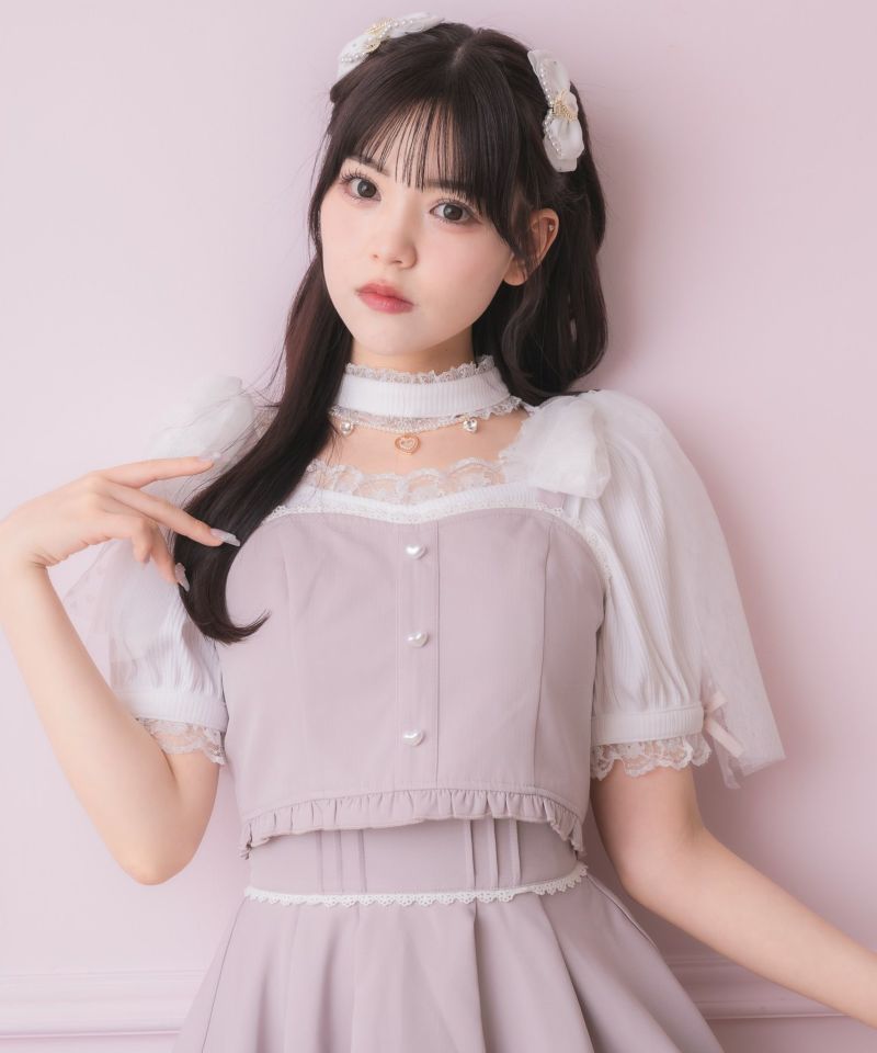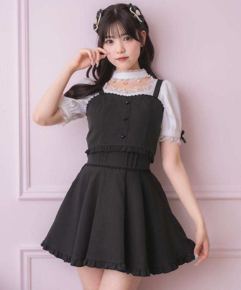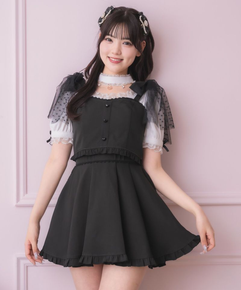 ビスチェとテレコトップスのセットアイテム♡セパレートなので単品使いも可能です。トップスにはネックレス風チェーンがついており、アクセも不必要◎ビスチェの肩リボンにはハートドットチュールを使い、存在感のある可愛いディテールポイントでコーデのアクセントになってくれます。 ※照明の関係で実際のお色味と若干異なる場合がございます。 ※表示のサイズ感と実物は若干異なる場合がございますので、予めご了承ください。 モデル身長ブルー159cm/ブラック・ピンク163cm