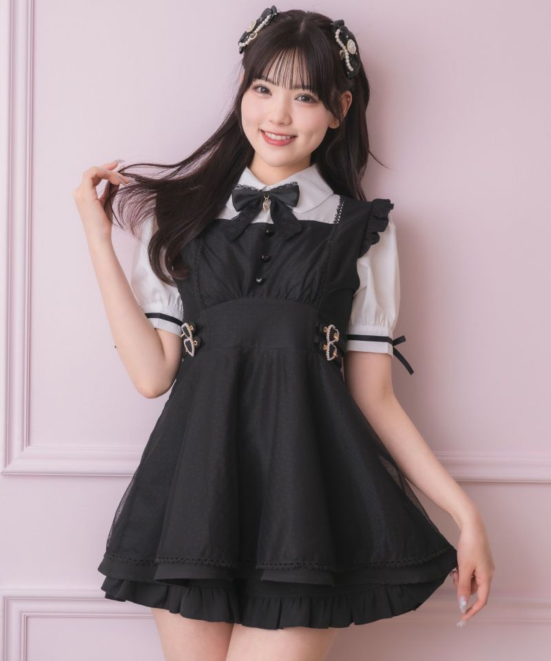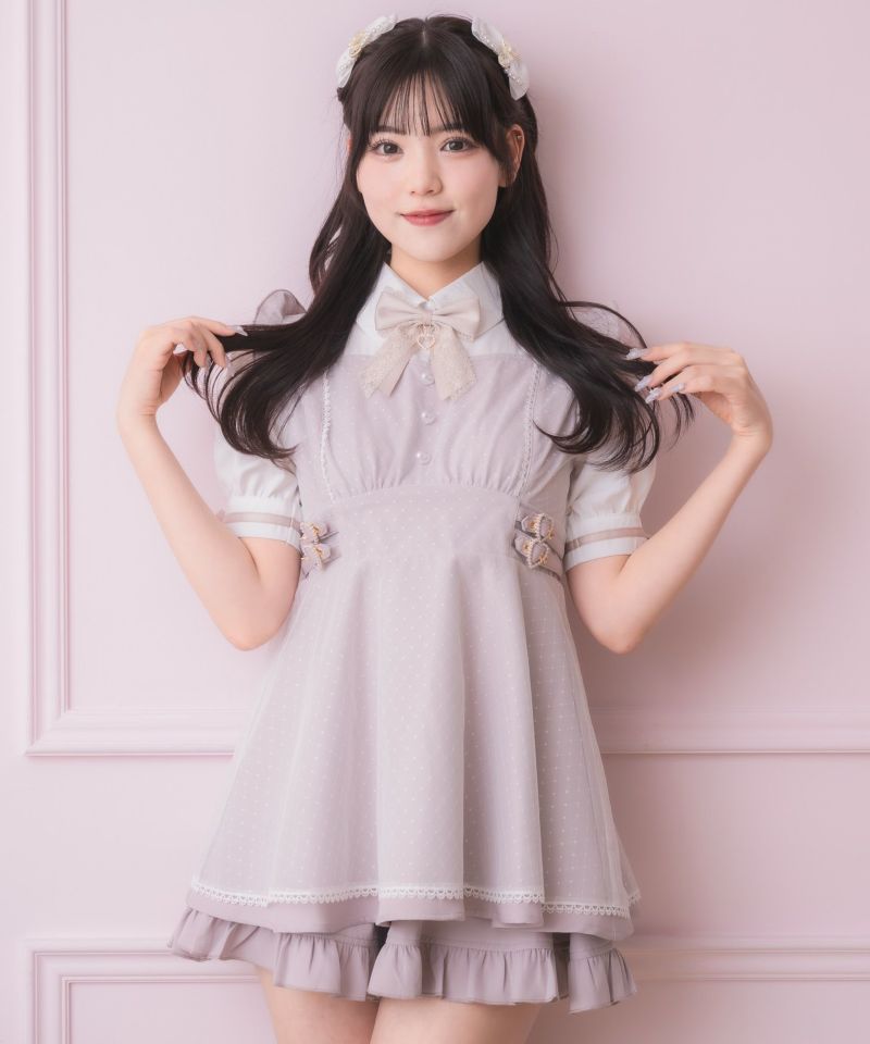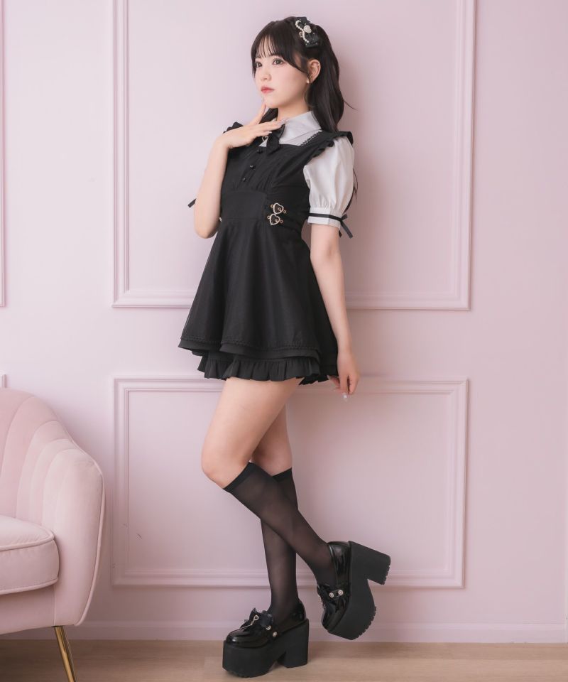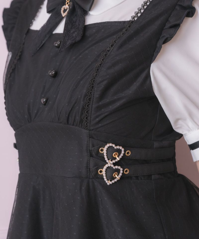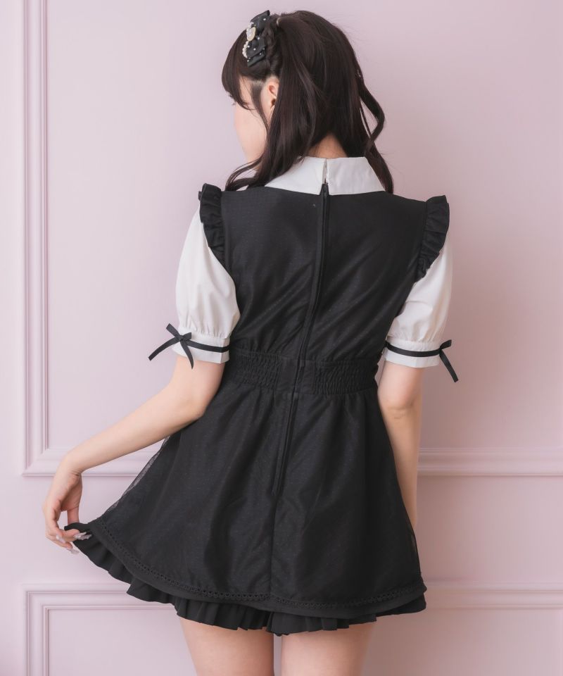 メイドライクなフリルデザインでガーリーな印象♡ドッキングデザインのチュニックにはチュールがレイヤードされ抜け感をプラスしてくれます。所々施したハートのディテールが上品可愛い♪こなれた雰囲気でおしゃれ度をぐっと高めてくれるセットアップです。