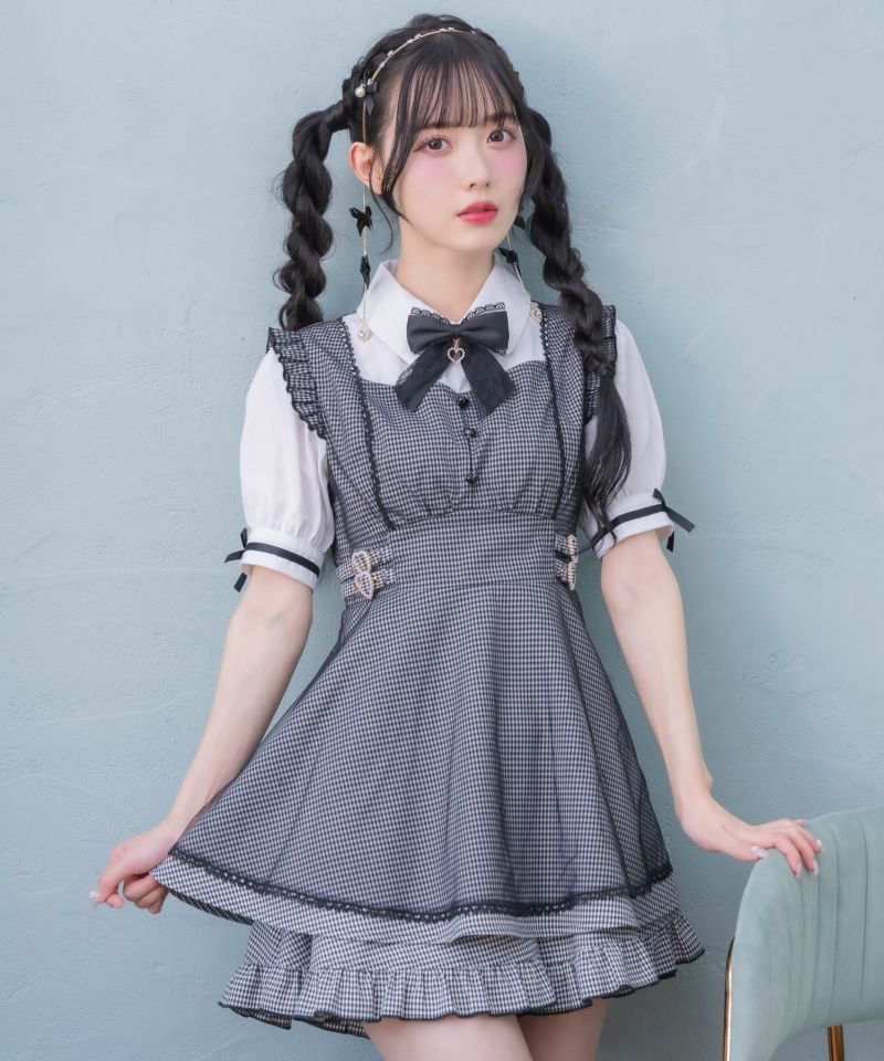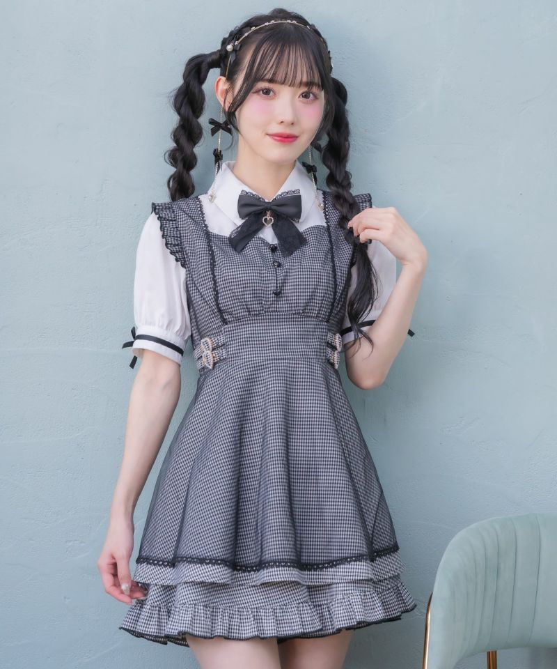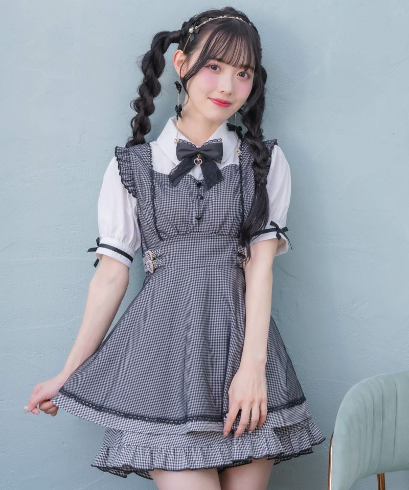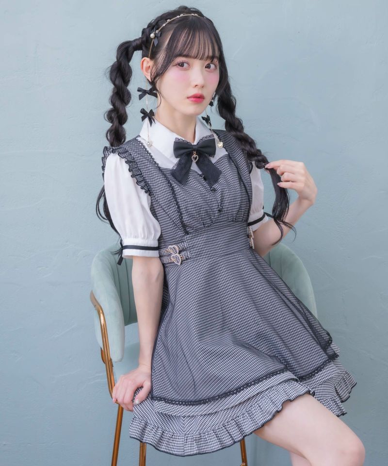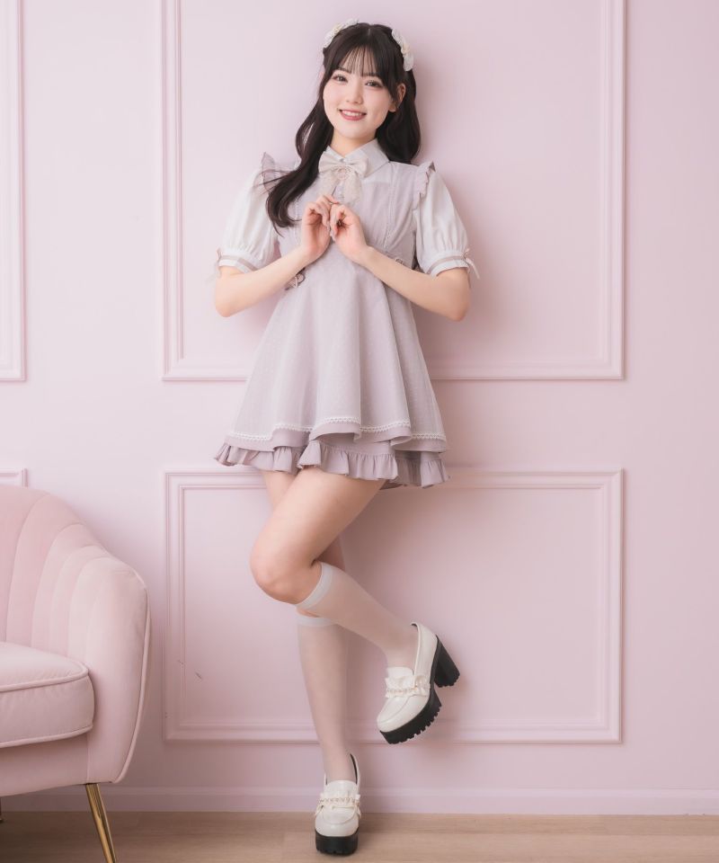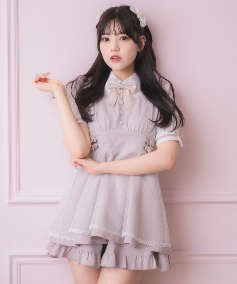 メイドライクなフリルデザインでガーリーな印象♡ドッキングデザインのチュニックにはチュールがレイヤードされ抜け感をプラスしてくれます。所々施したハートのディテールが上品可愛い♪こなれた雰囲気でおしゃれ度をぐっと高めてくれるセットアップです。