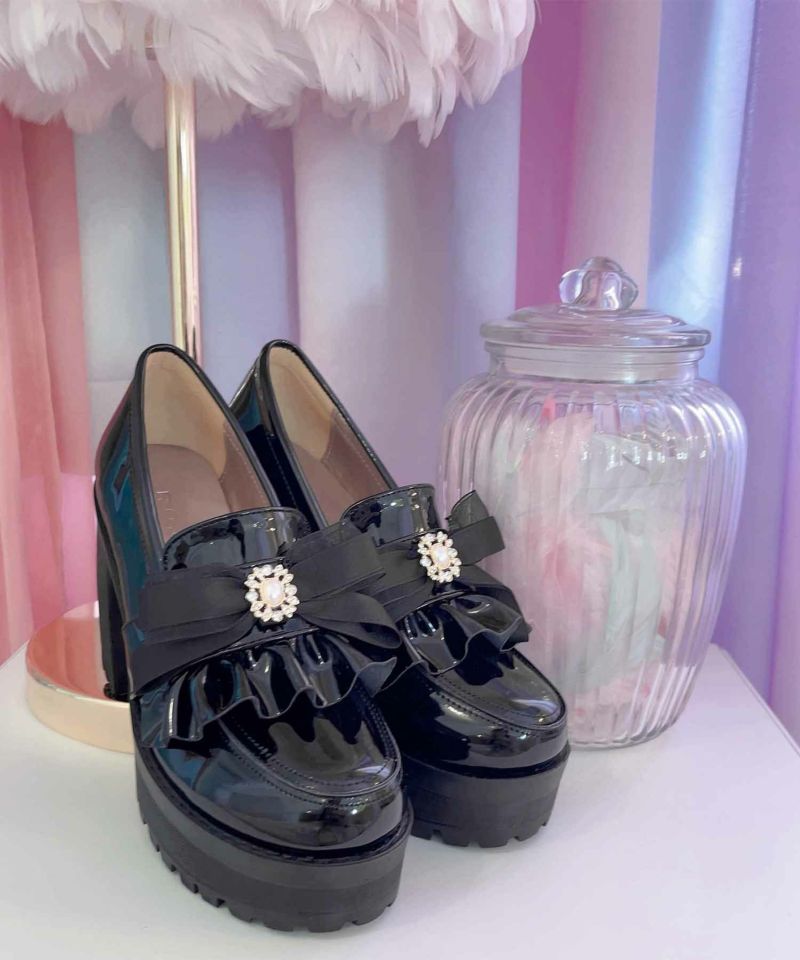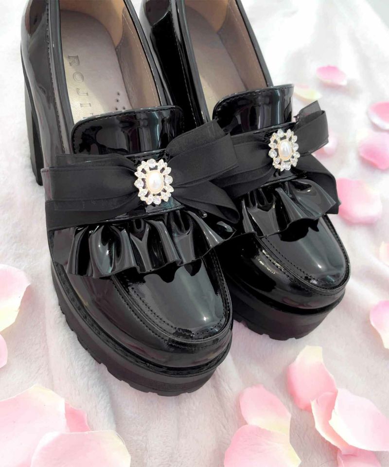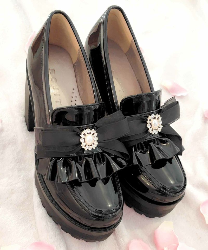 リボンのパールビジューが目を惹くローファー。リボンにはシアーを重ねてお淑やかな印象♡ストームも高さがあるので、見た目以上にヒールとの高低差が少なく歩きやすいです。高めヒールがお好きな方や低身長さんにオススメのアイテム。