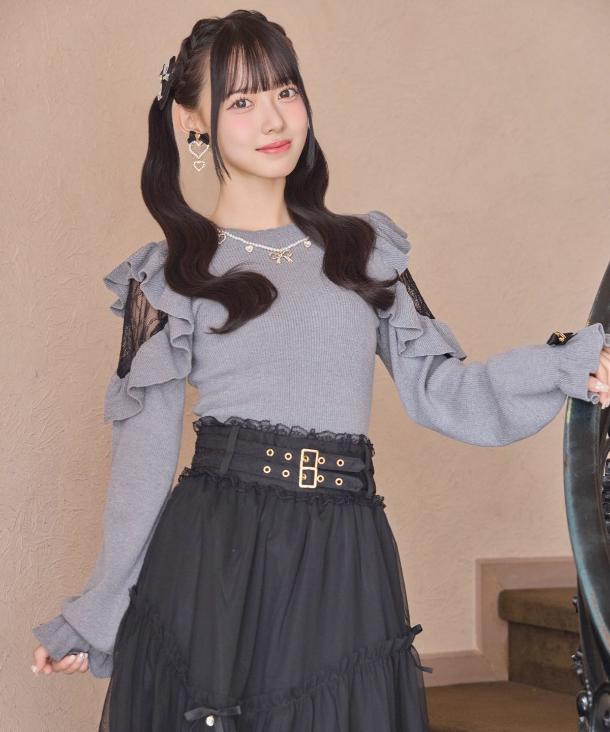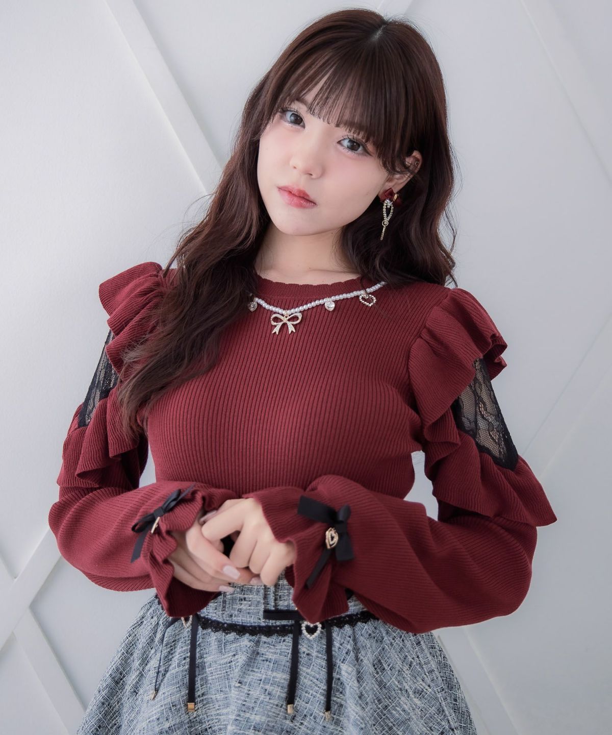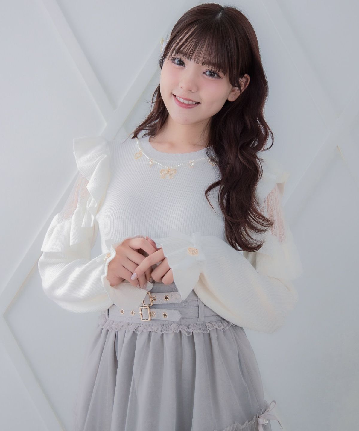 ネックレス付肩ボリュームフリルニットトップス