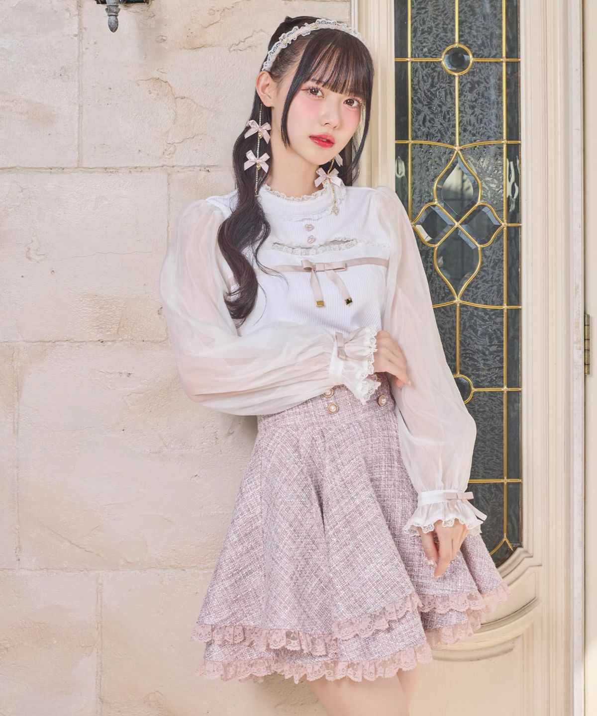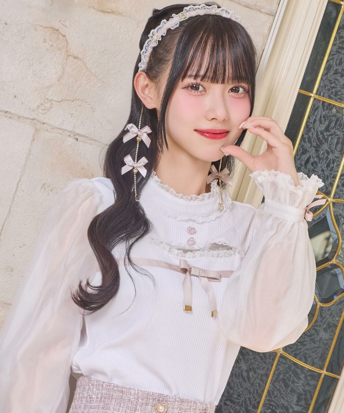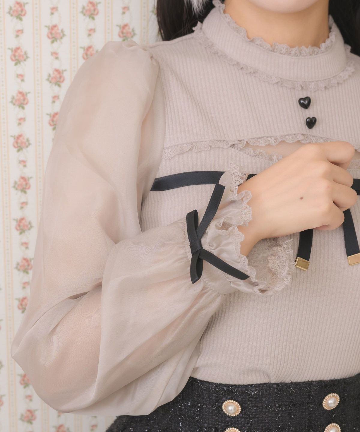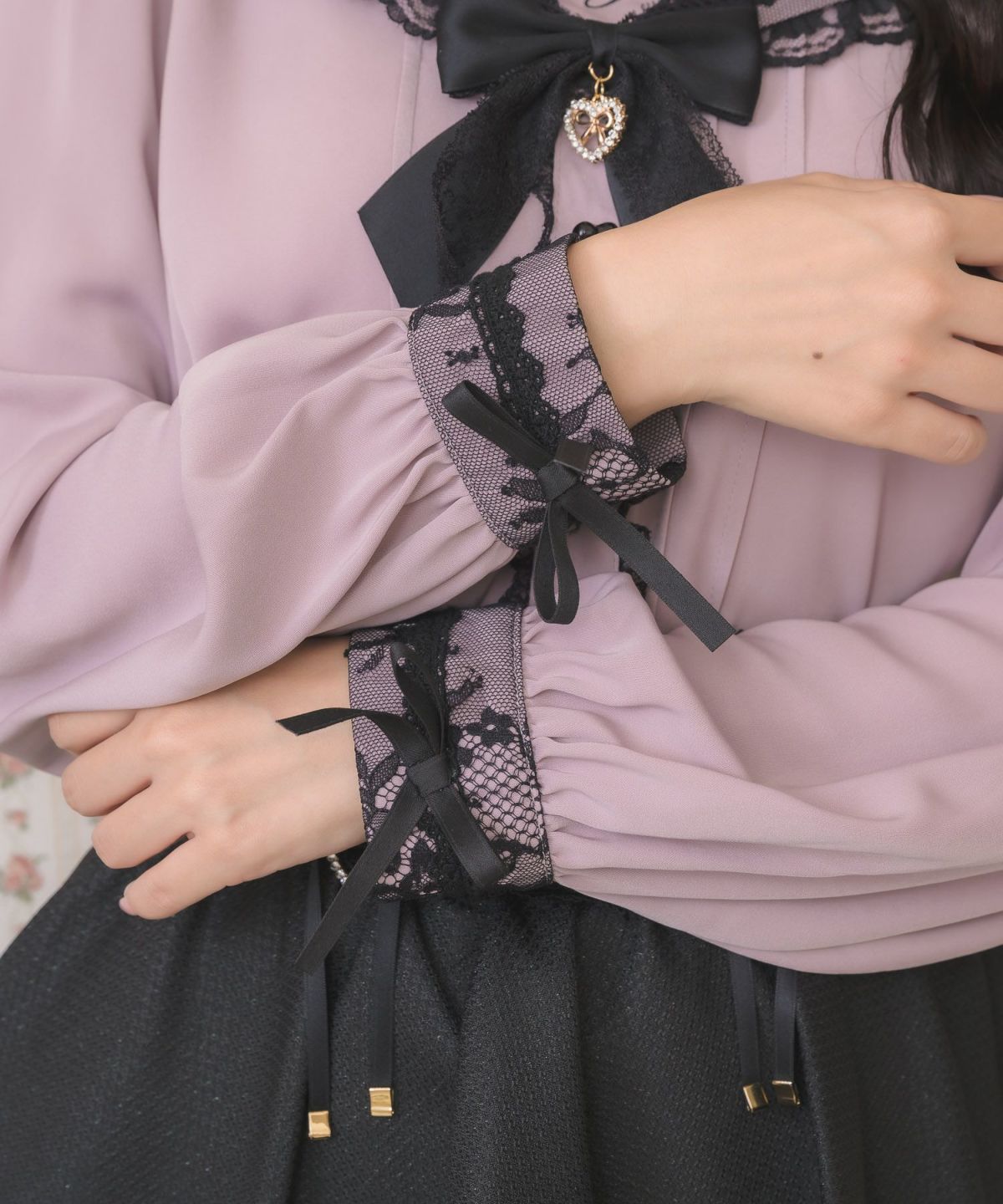 レース袖ボータイブラウス