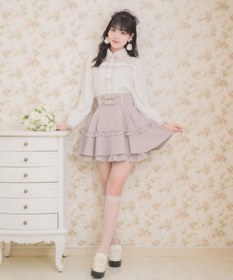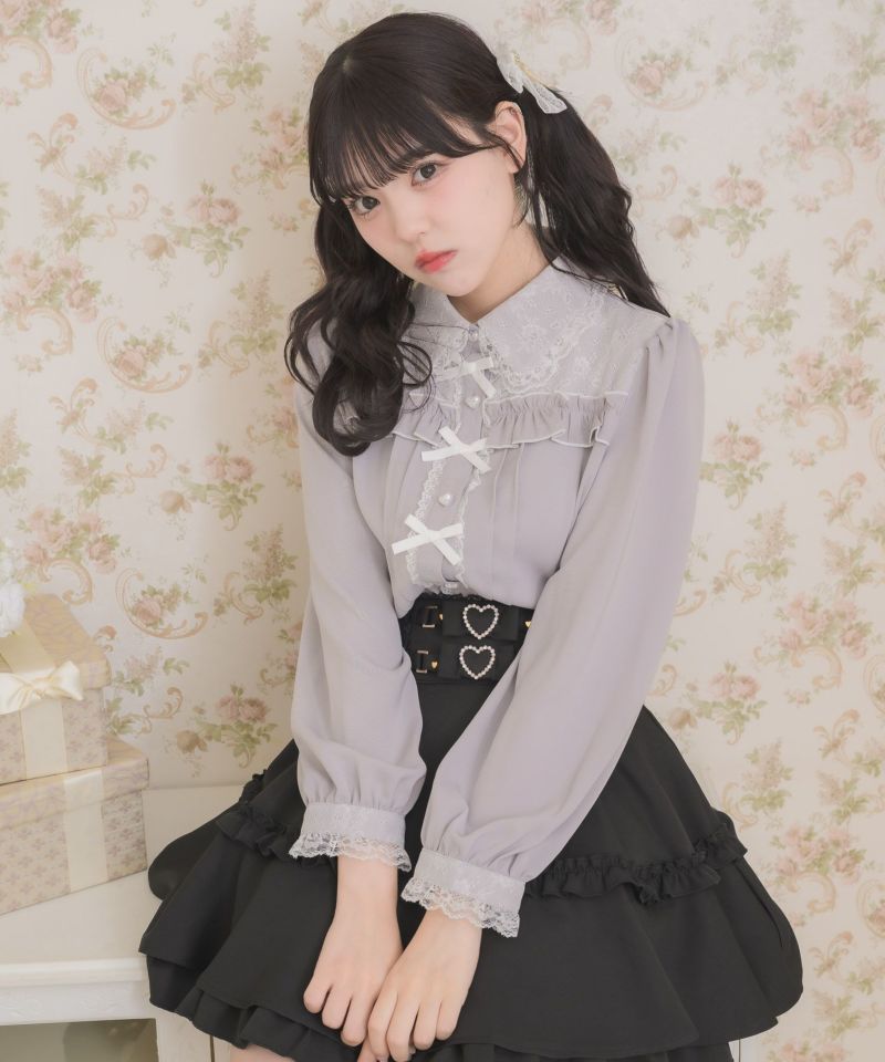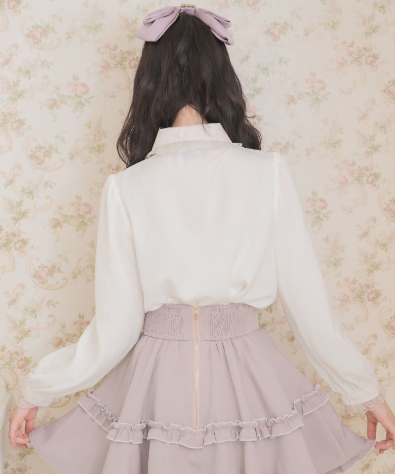 衿とヨークのレース使いが華やかに着飾るブラウスのお目見えです。ロマンティックなハート釦との間にリボンを並べ、ピンタックが縦のラインを強調しスタイルアップを促します♪レースとディテールの色味を揃えたことでスタイリングしやすく設計♡淡い色味のバランスが好印象なアイテムです。 ※照明の関係で実際のお色味と若干異なる場合がございます。 ※表示のサイズ感と実物は若干異なる場合がございますので、予めご了承ください。 モデル身長ブラック162cm/パープル・ホワイト163cm