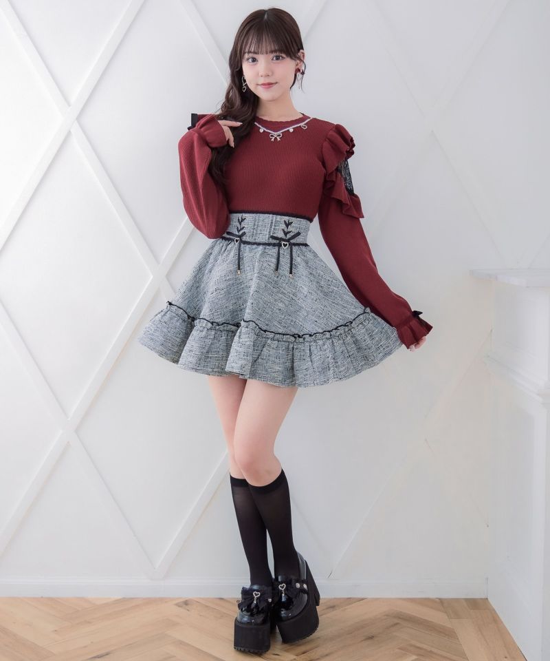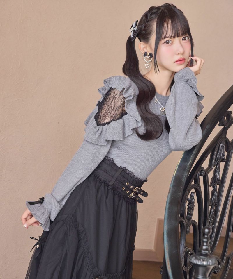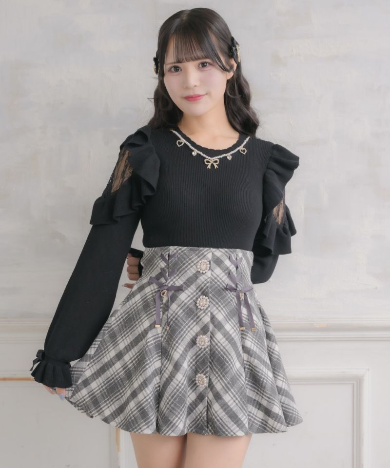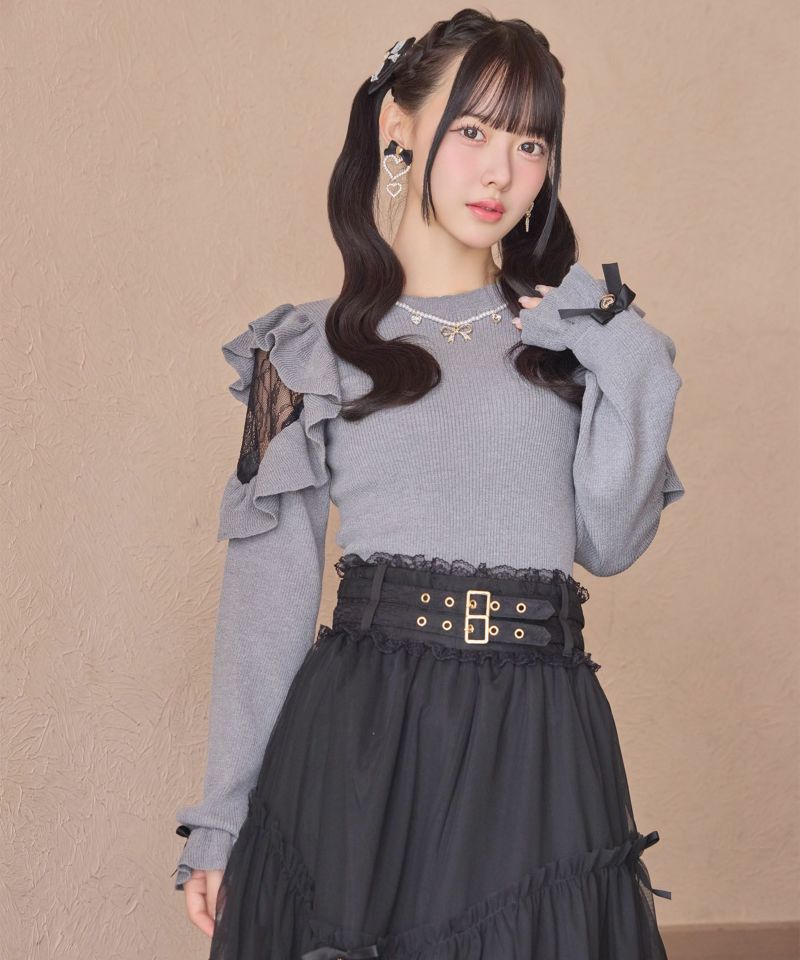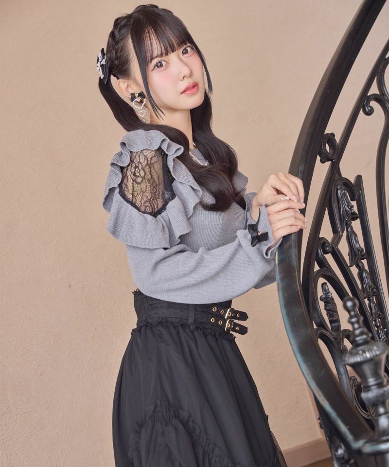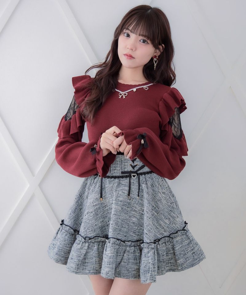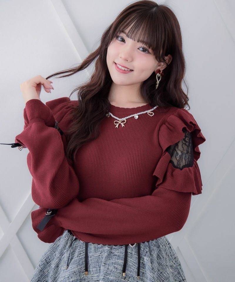 中央にリボンをつけた可愛いネックレスがオシャレ上級者に導く♡優しいフィット感のあるニットトップスがお目見えです。ボリュームフリルが身頃を華奢魅せしてくれ、レース開きが程よく抜け感をプラス♪シルエットが華奢なのでフレアスカートなど、ボリュームのあるボトムとの相性抜群です。