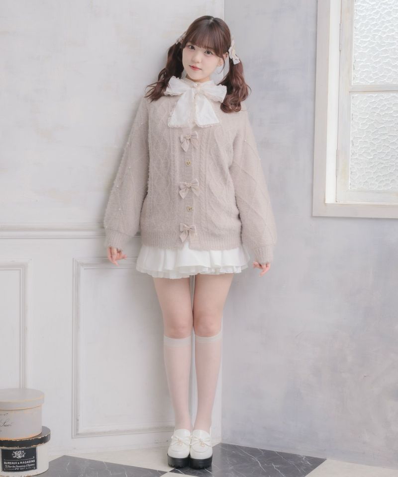 ふわもこ素材でロマンティックに包まれて♡女の子らしさ満点のリボンのディテール、パールの装飾がどこから見ても"お姫様気分"を叶えてくれる1枚。ケーブル編みの立体感がほんのりクラシカルな雰囲気をプラス。