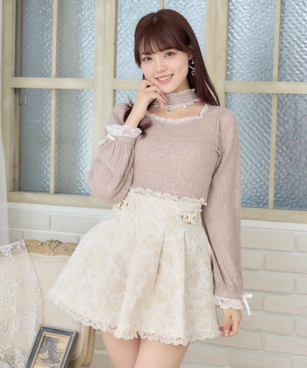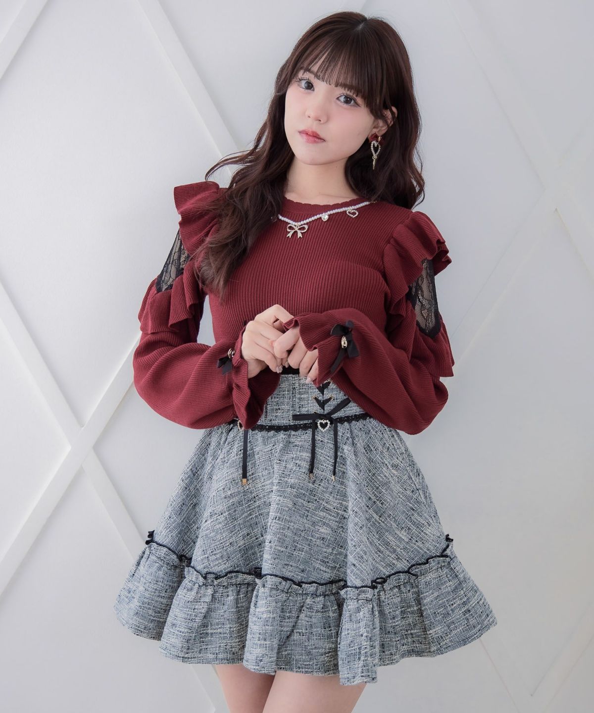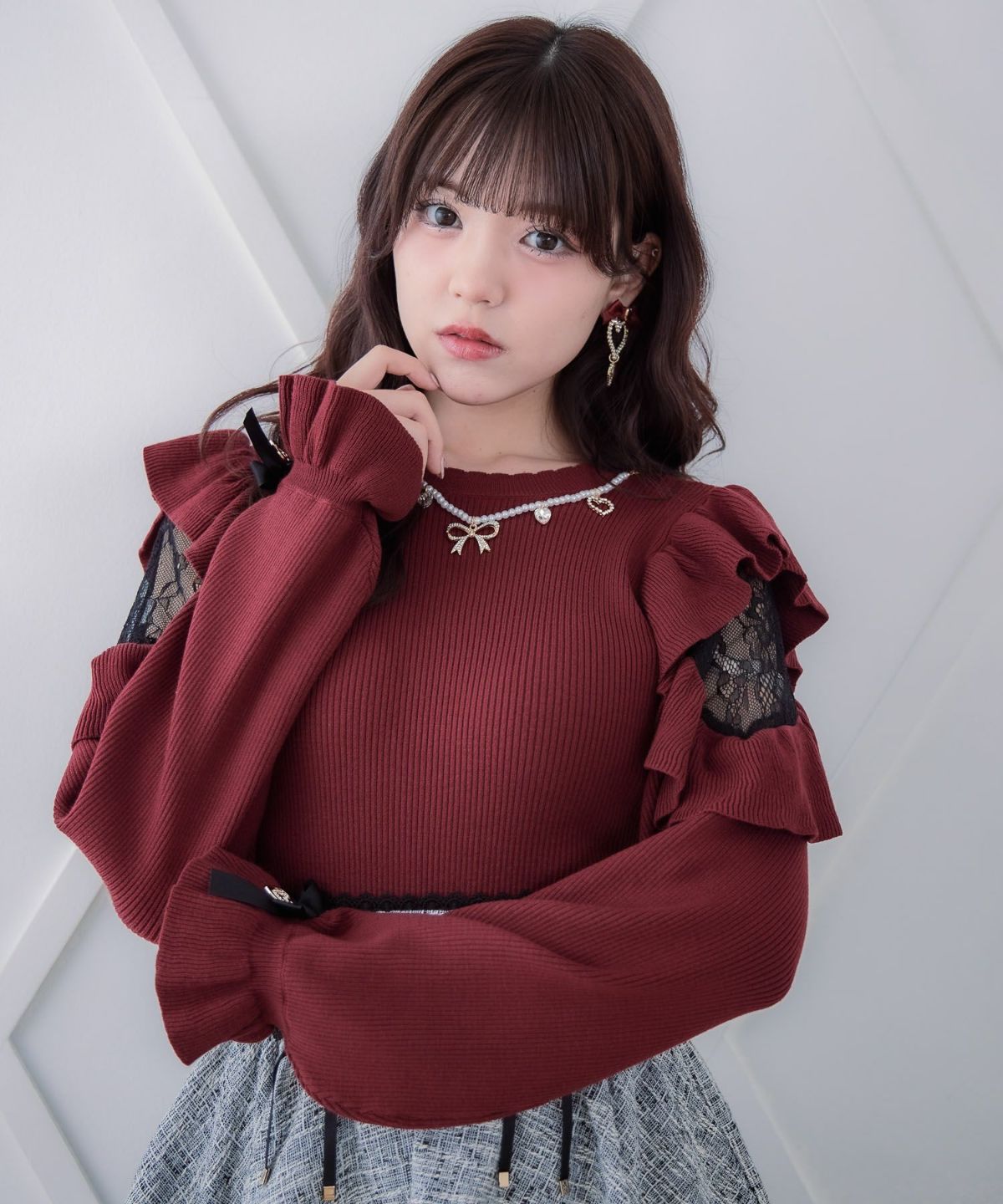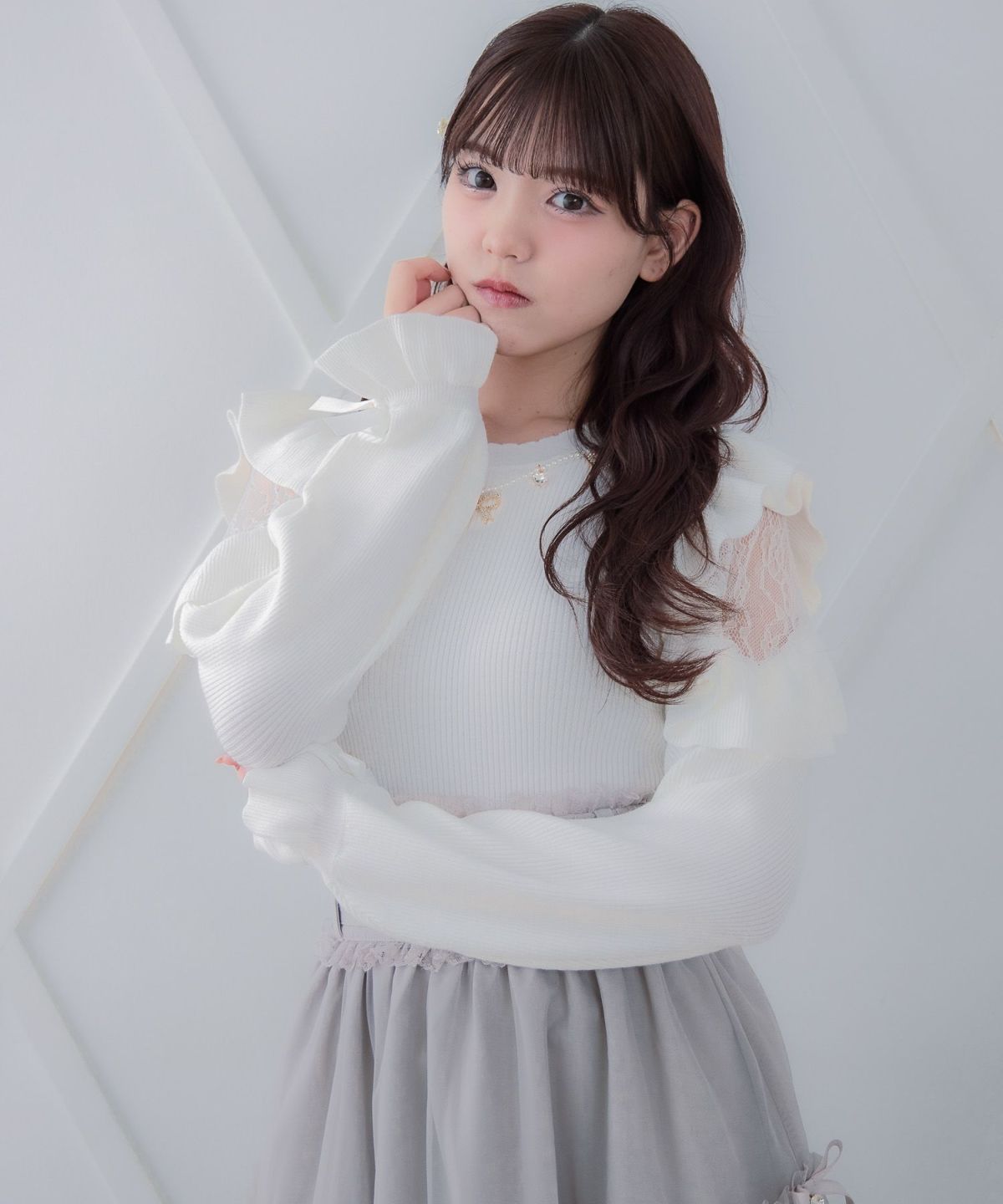 ネックレス付肩ボリュームフリルニットトップス