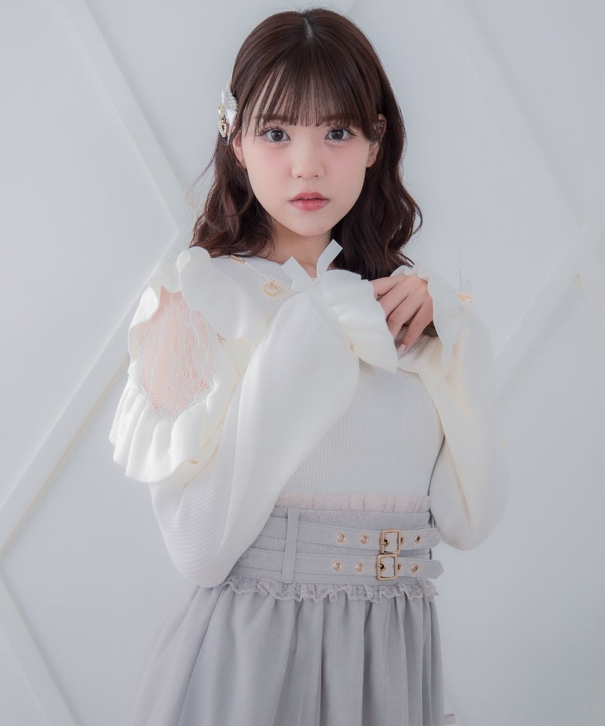 肩レーシーフリル切替ブラウス