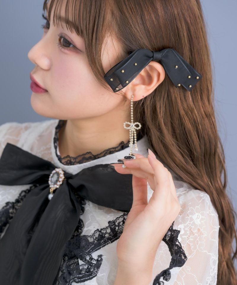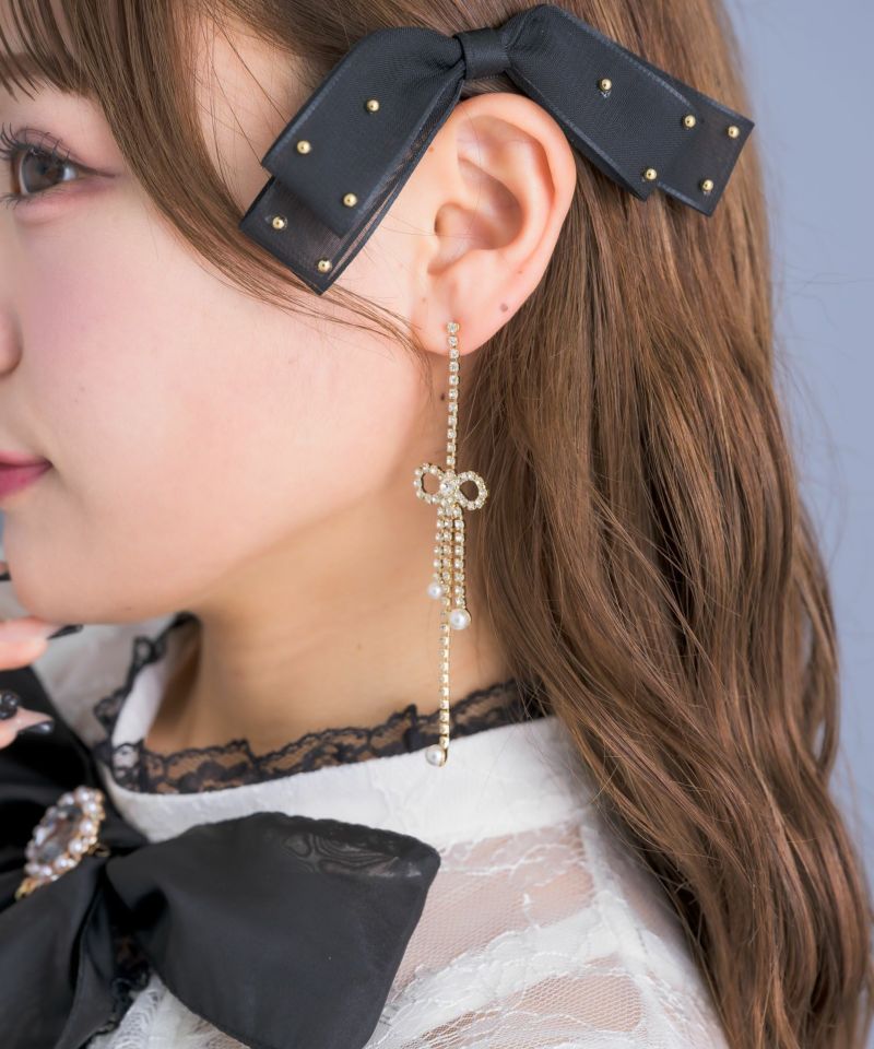 ゴージャスなビジュをふんだんに使ったピアス。リボンの先にに小さなパールをちょこんと付け、繊細なディテールが上品さに磨きをかけます。髪を下ろしていてもまとめていても目立つロングタイプ♡