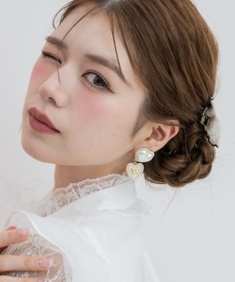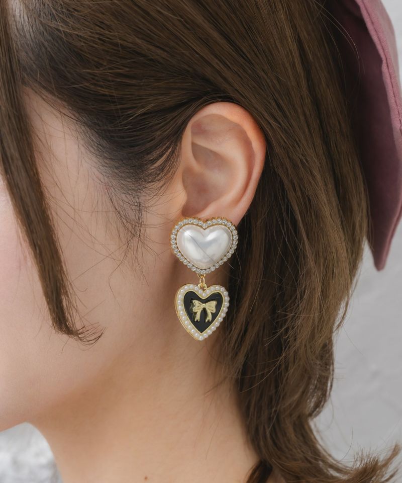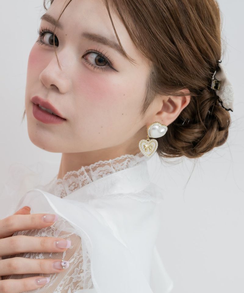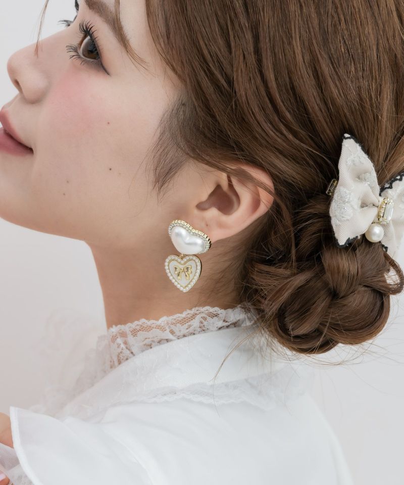 ぷっくりパールとリボンを埋め込んだハートのコラボレーションが女の子らしいデザイン♪光沢感&艶感のあるビジュアルが上品可愛く着飾ります。普段使いはもちろん華やかなお呼ばれシーンにも◎ ※照明の関係で実際のお色味と若干異なる場合がございます。 ※表示のサイズ感と実物は若干異なる場合がございますので、予めご了承ください。
