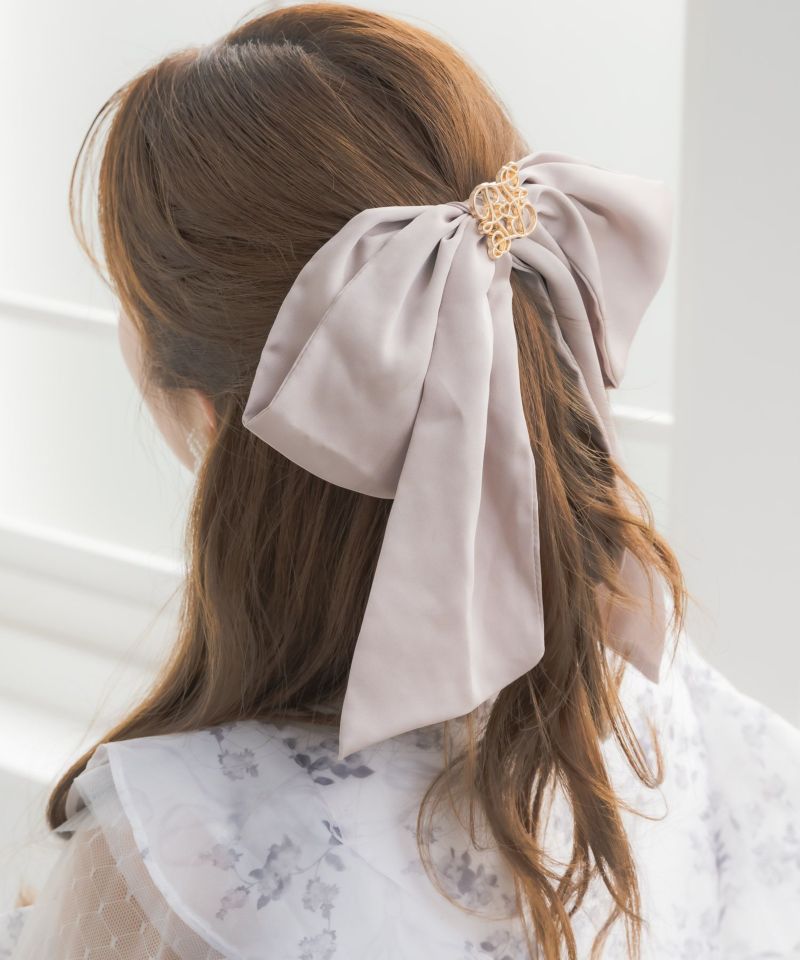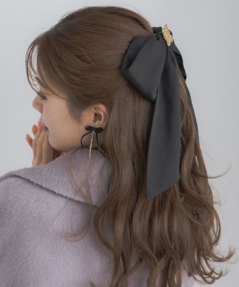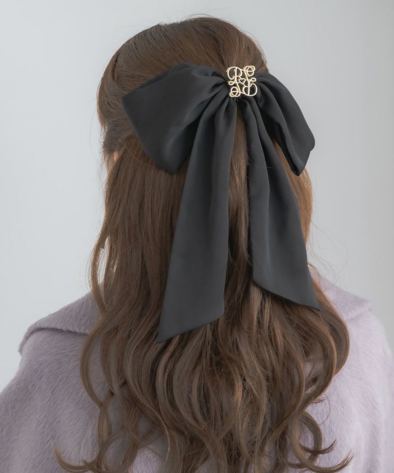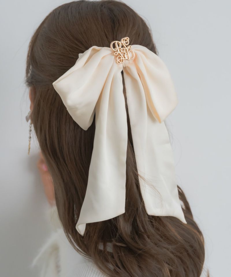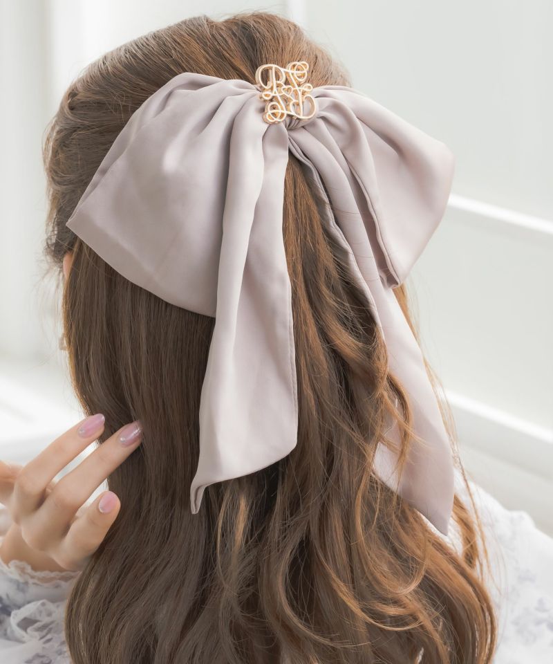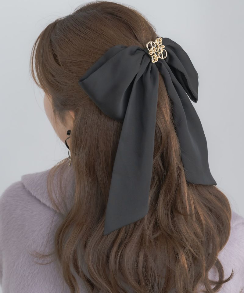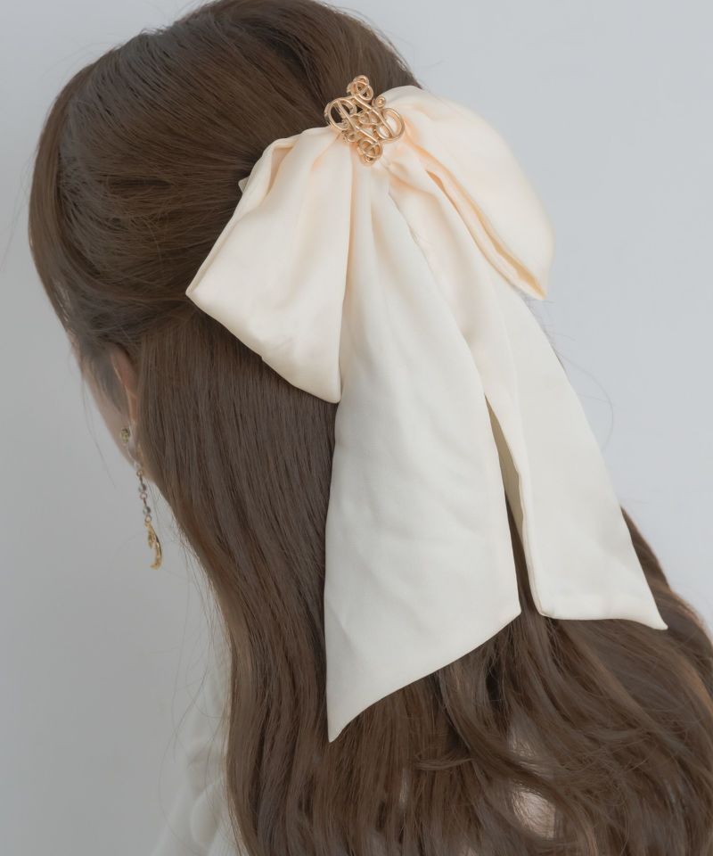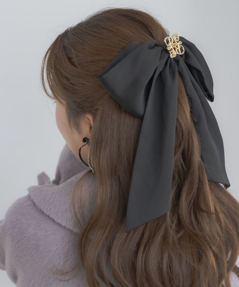 モノグラムのブローチ付き♡取り外し可能なのでシンプルにそのままでも使用いただけます。大きめリボンで存在感がありつつ、落ち着いた色合いと飾りすぎない存在感がデイリーにマッチしやすい◎1つ持っておくと重宝するアイテムです。