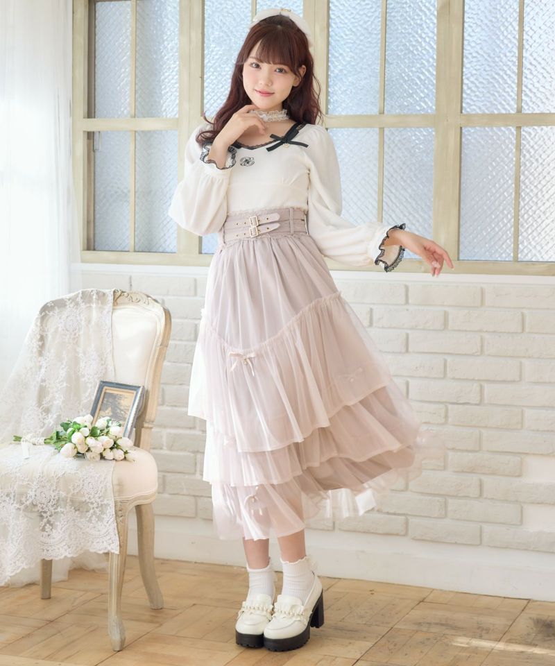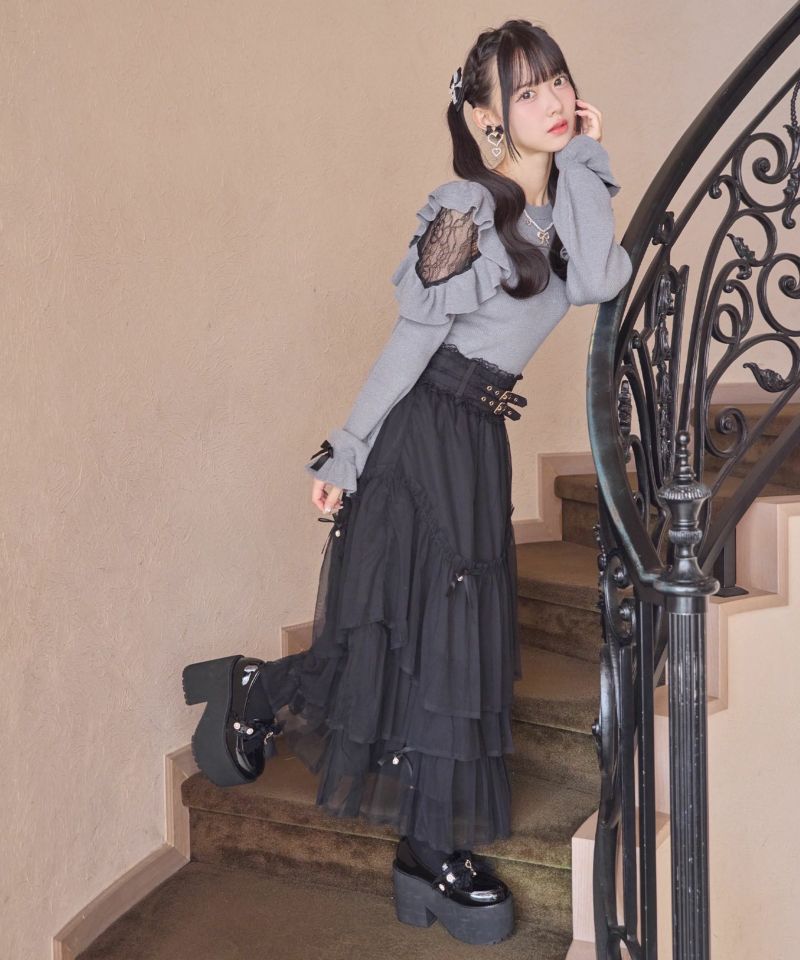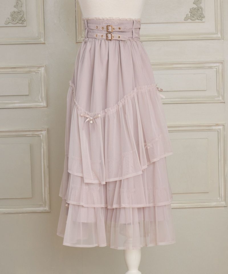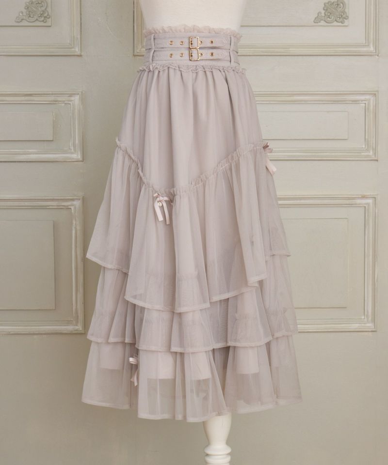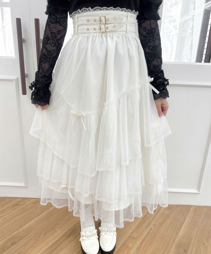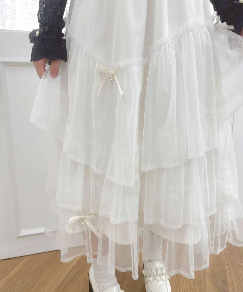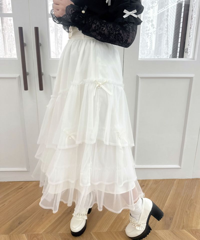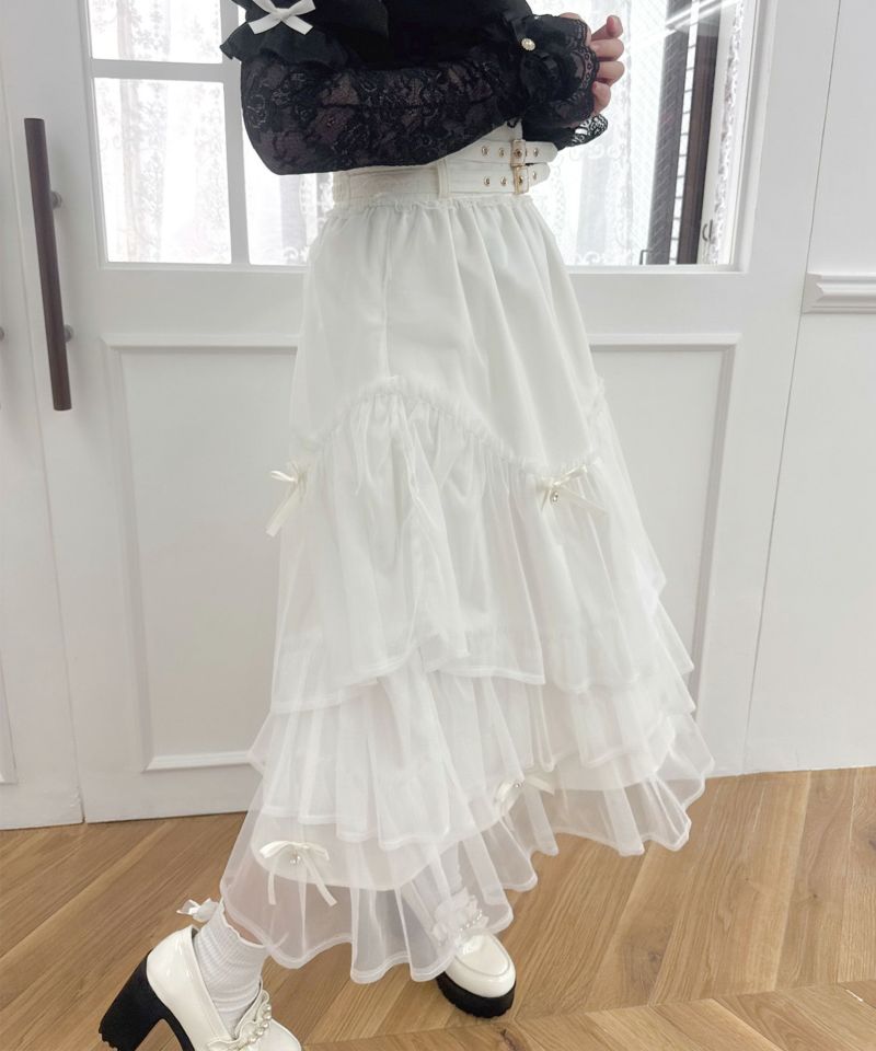 ボリュームたっぷりのフリルをあしらい、ドラマチックなルックスを叶えるロングスカート♪ふんわりと揺れるティアードの裾ラインでレディライクな要素をプラス、透け感のあるチュール生地でリズムのある足元を演出します。小ぶりなビジュ付きリボンが大人かわいいディテール♡ ※照明の関係で実際のお色味と若干異なる場合がございます。 ※表示のサイズ感と実物は若干異なる場合がございますので、予めご了承ください。 モデル身長ブラック・ピンク159cm/グレー163cm/アイボリー162cm