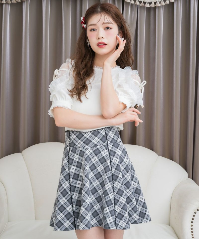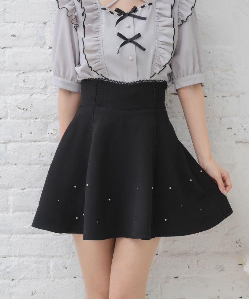 着回し力の高さと、かわいいAラインのフレアシルエットが人気のスカパン。スラッと切り替えがわかりにくい設計でスタイルよく魅せてくれます。パールとビジュをランダムに装飾し、バックレースアップがクラスアップを叶えます。