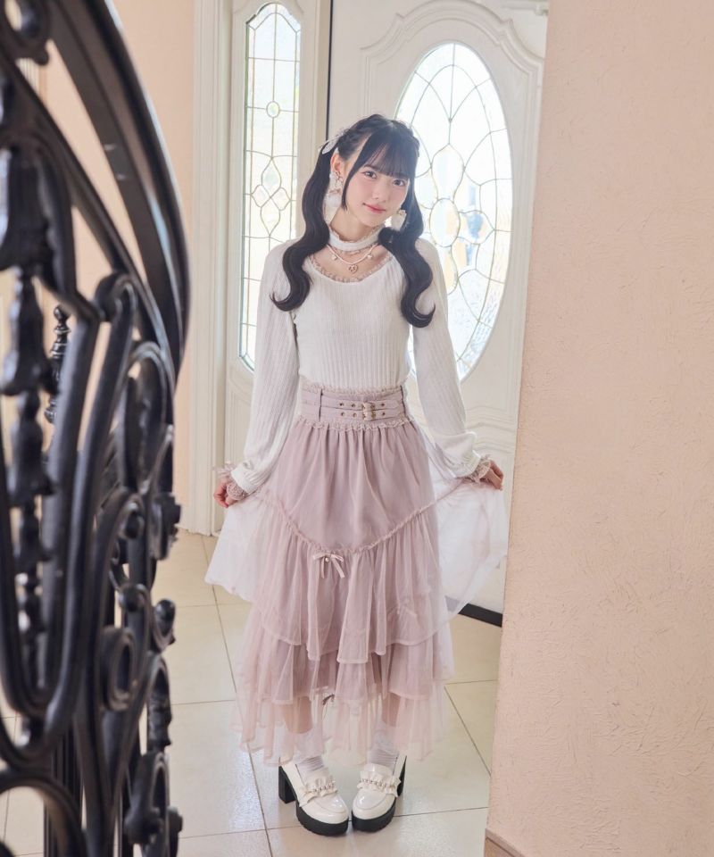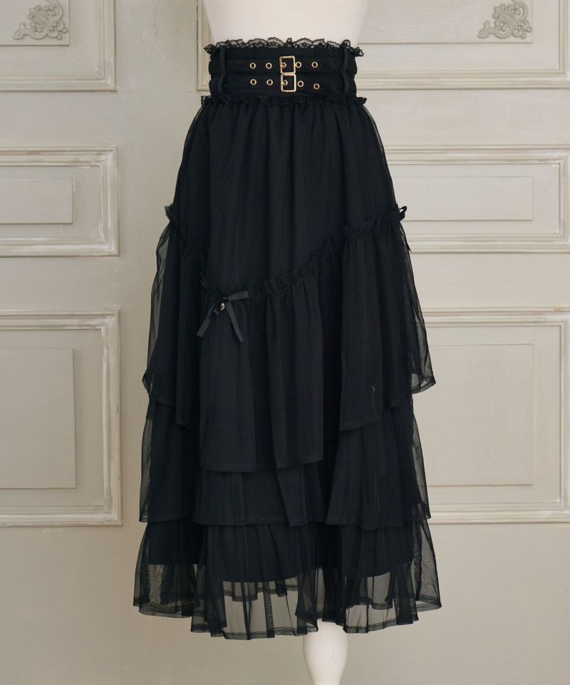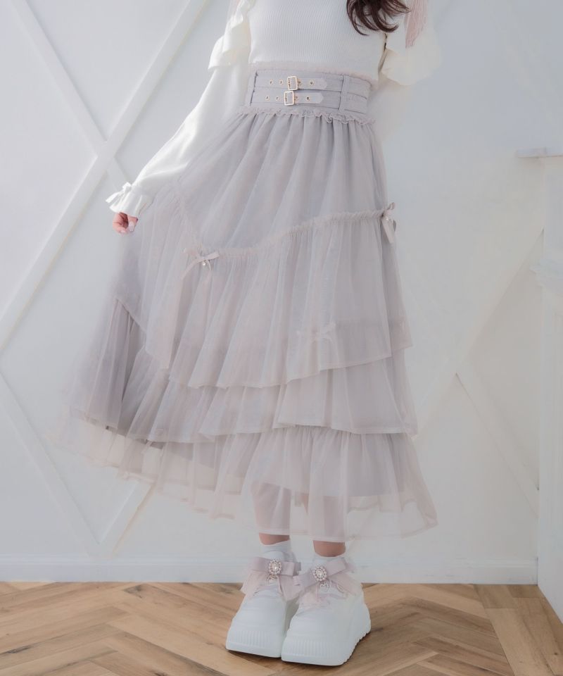 ボリュームたっぷりのフリルをあしらい、ドラマチックなルックスを叶えるロングスカート♪ふんわりと揺れるティアードの裾ラインでレディライクな要素をプラス、透け感のあるチュール生地でリズムのある足元を演出します。小ぶりなビジュ付きリボンが大人かわいいディテール♡ ※照明の関係で実際のお色味と若干異なる場合がございます。 ※表示のサイズ感と実物は若干異なる場合がございますので、予めご了承ください。 モデル身長ブラック・ピンク159cm/グレー163cm/アイボリー162cm