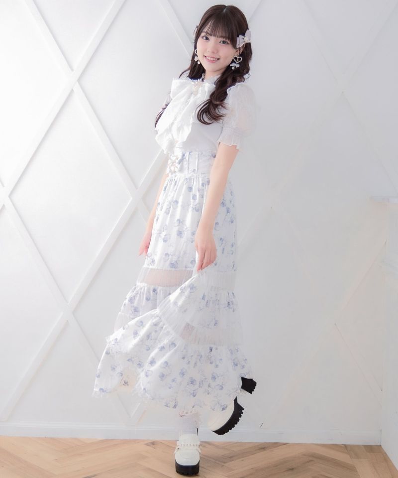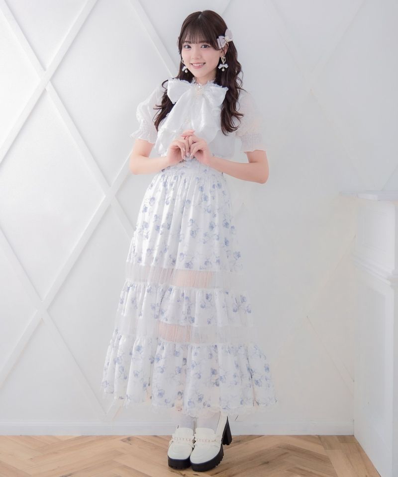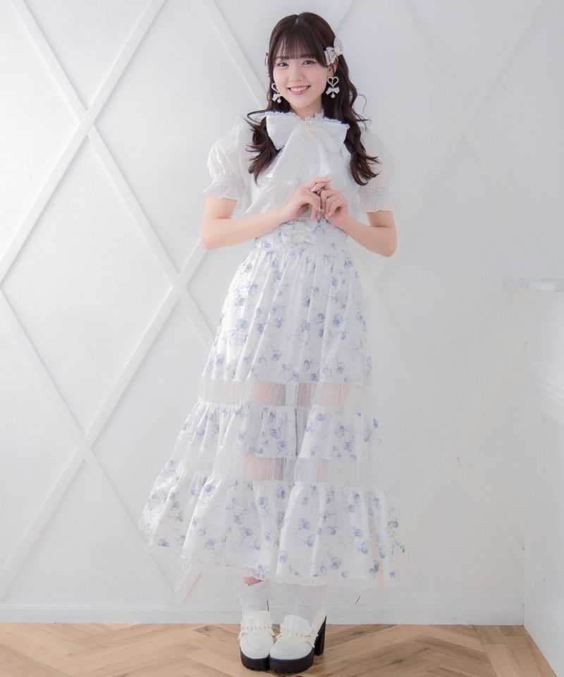 華美な花柄がコーデの主役に♡ドットと花柄をMIXさせたロングスカートのお目見えです。フレアシルエットで表情豊か、シアーから程よくレッグラインが透けて軽やかな印象を与えます。ウエストベルトのリボンがROJITAらしいディテールポイント♪ ※照明の関係で実際のお色味と若干異なる場合がございます。 ※表示のサイズ感と実物は若干異なる場合がございますので、予めご了承ください。 モデル身長:163cm