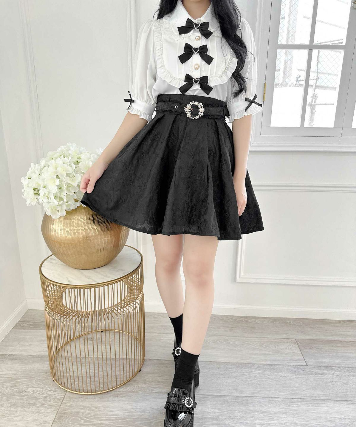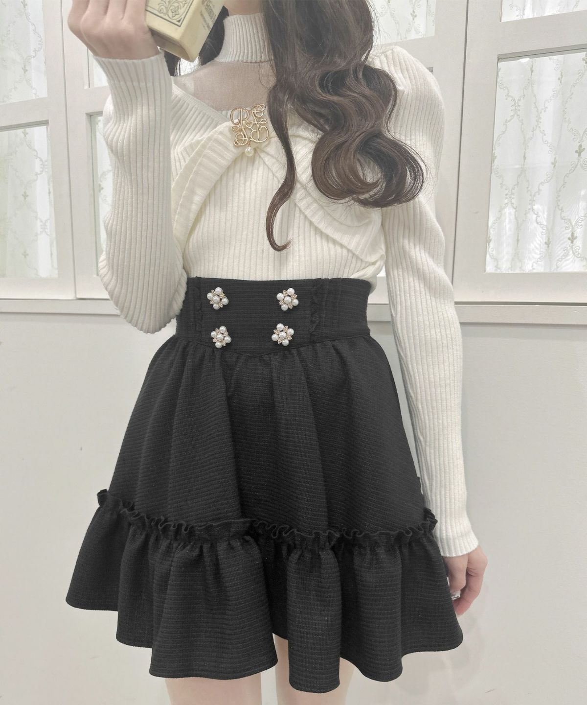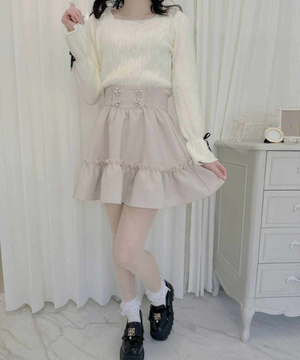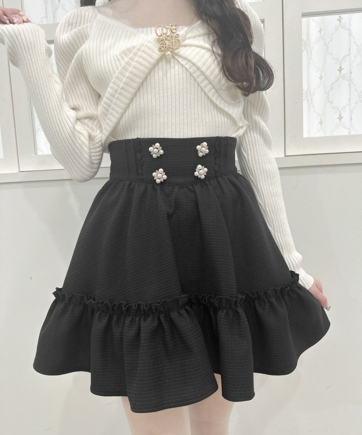 裾ボリュームフラワー釦スカート