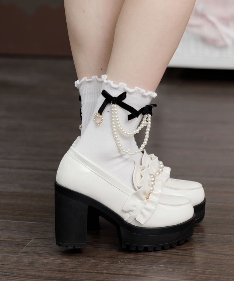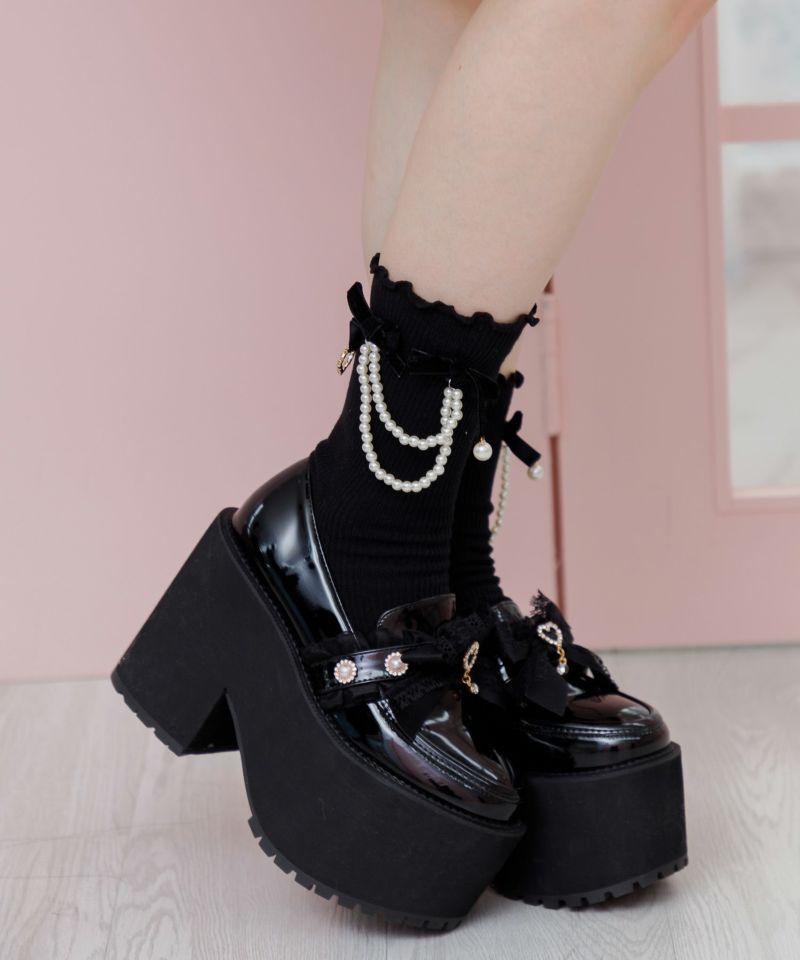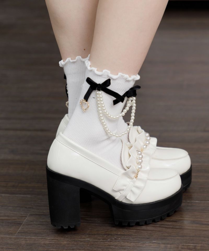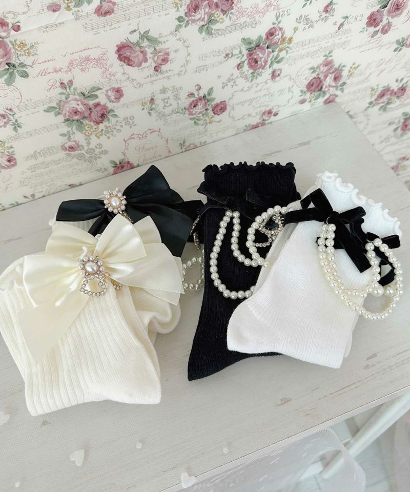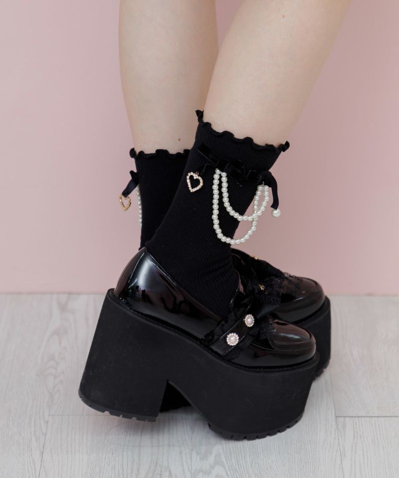 個性的なデザインが目を引くソックス。サイドにパールチェーンのアクセサリーが付いており、足元のおしゃれ役に一役買うアイテムとしておすすめです。リボンはベロア調でシックなニュアンス♡リボンの端にハートのビジュとパールを添えています♪ ※照明の関係で実際のお色味と若干異なる場合がございます。 ※表示のサイズ感と実物は若干異なる場合がございますので、予めご了承ください。