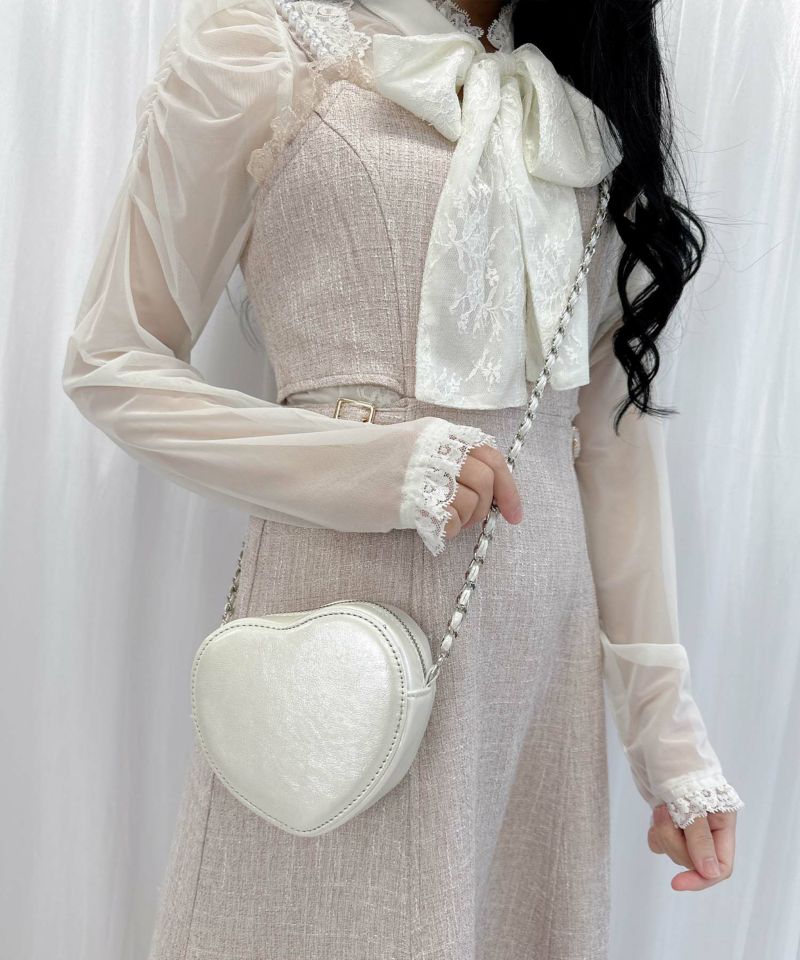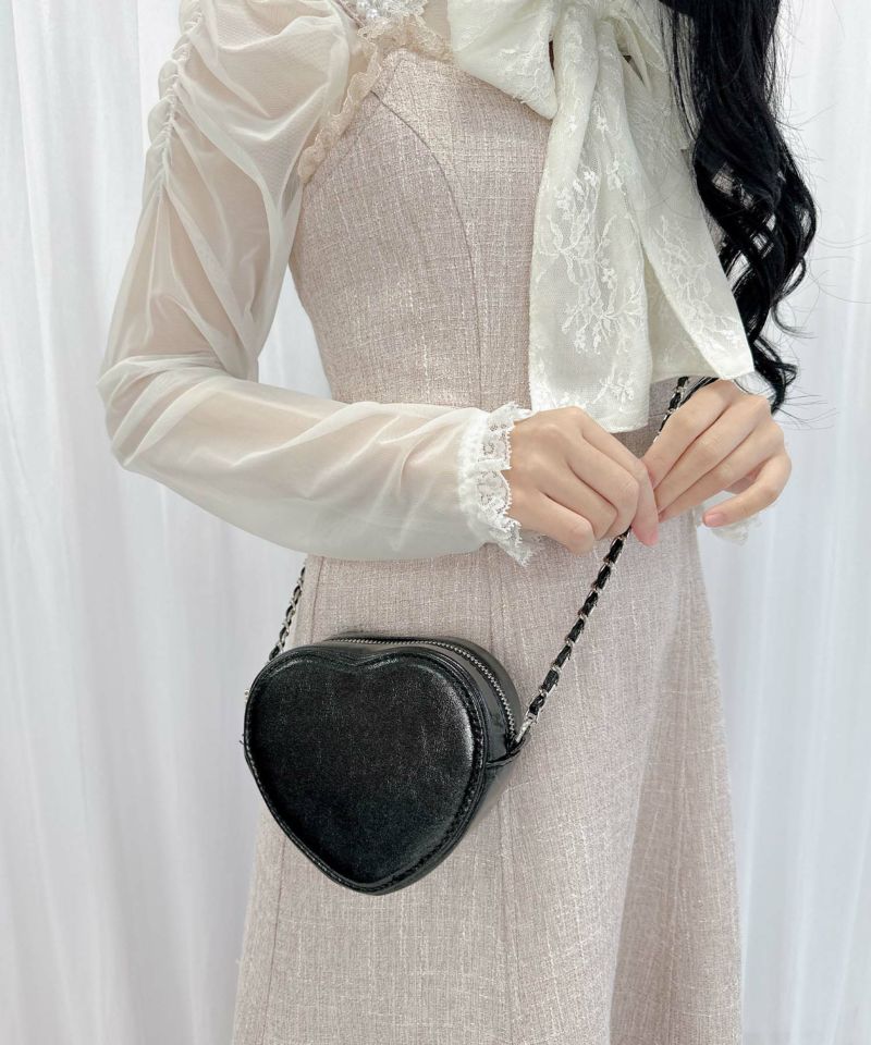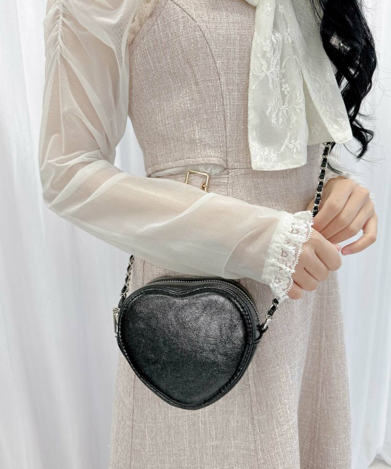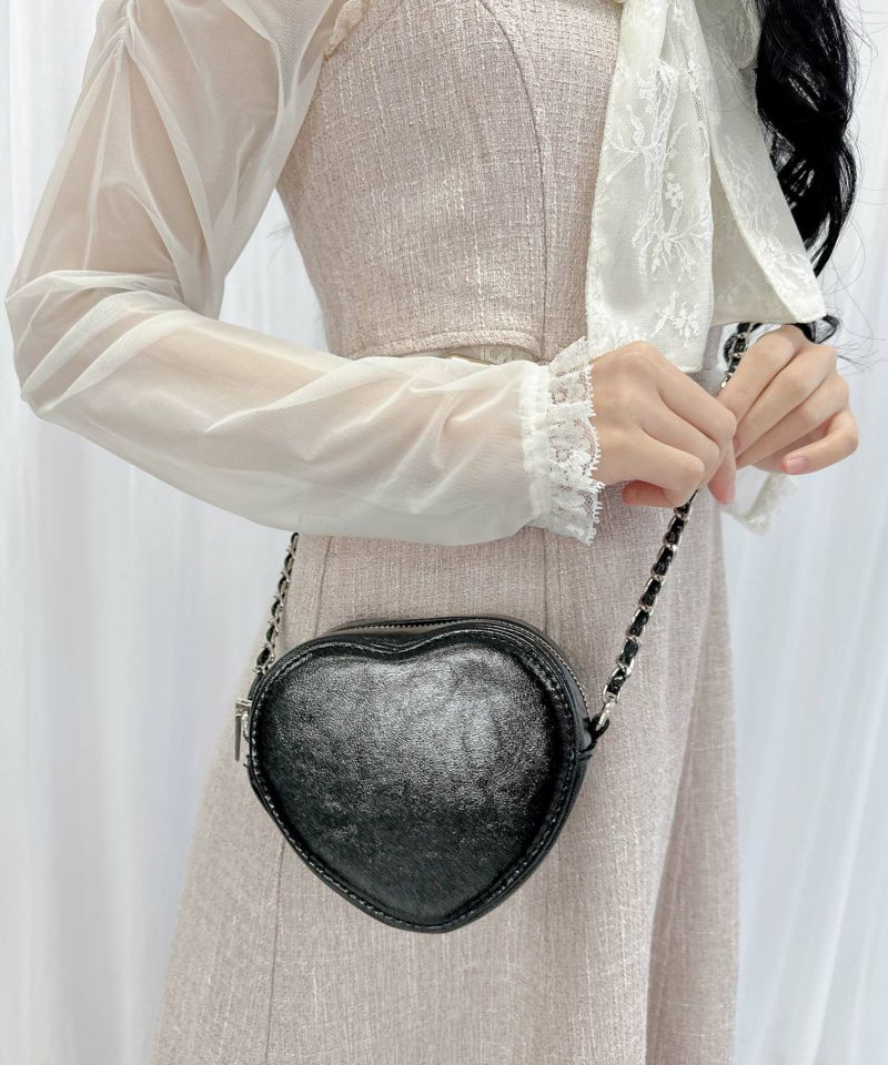 メタリックハートがとびきりキュートなショルダーバッグ♡アクセサリー感覚で使えるコンパクトサイズ、マチがあるので自立してくれます♪リップスティックやミラー等を入れたり、メインバッグにプラスワンで取り入れてもOK。