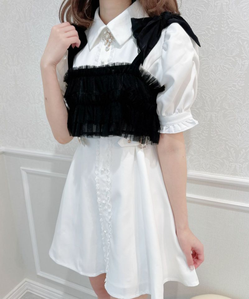 ふんわりとしたチュールビスチェとシャツワンピースのスタイリングセット♡ビスチェのショルダーには自由に結ぶタイプのリボンが付属♪コーデに悩まずアイテムそれぞれに細かいディテールを入れているので、単品使いもおしゃれな一押しアイテムです。