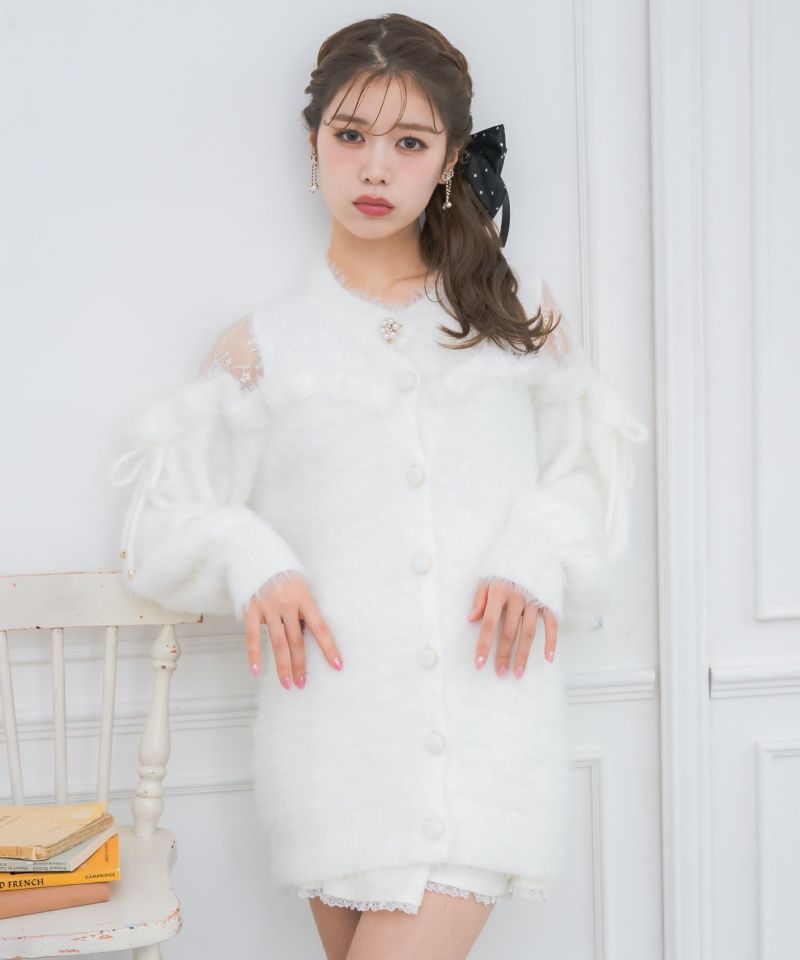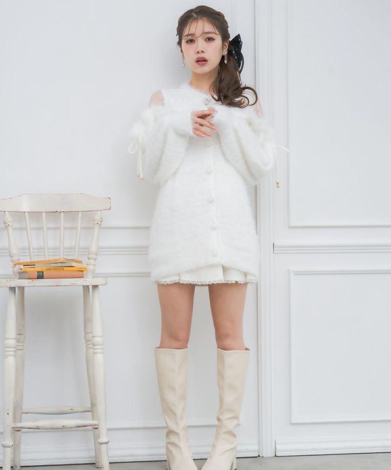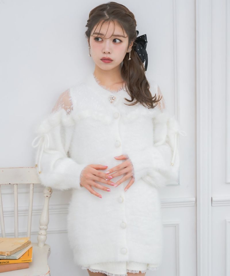 オフショルダーの切り替えには繊細なレースを重ねて女性らしい抜け感をプラス。ふんわりとしたシャギーニットがゆったりとした雰囲気を演出しつつ、フリルが華やかなアクセントに。甘さと上品さ、ほどよいリラックス感がバランス良く溶け合う、洗練されたニットワンピースです。