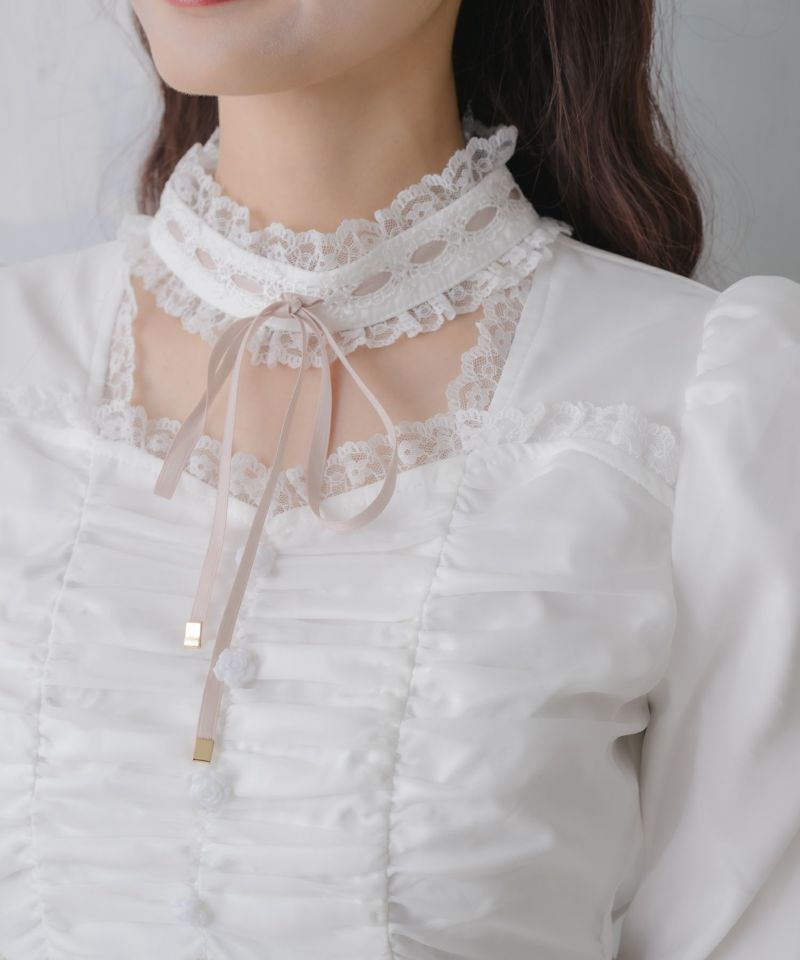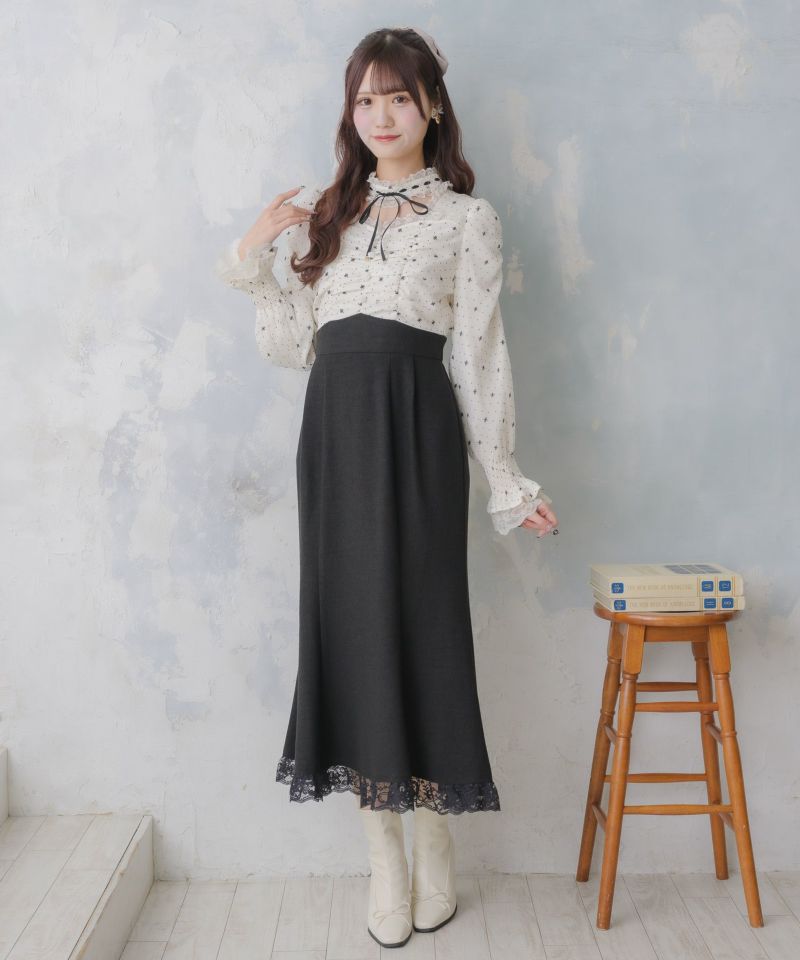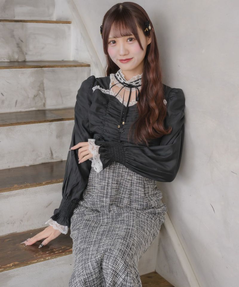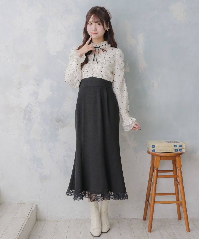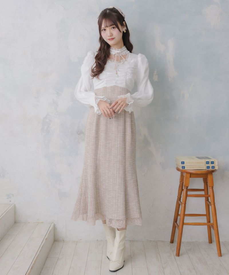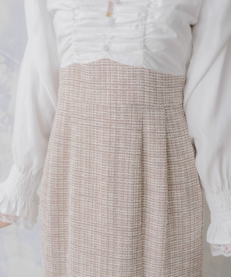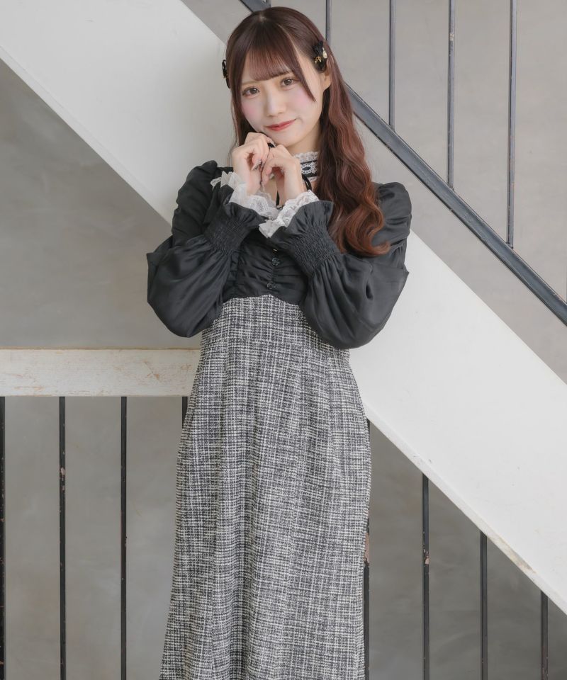 首元のフリルチョーカーには、はしごレーステープをあしらい、繊細で上品なアクセントをプラス♡前身頃にはたっぷりとギャザーを寄せ、柔らかな表情と立体感を演出します。ハイウエストで切り替えたマーメイドシルエットが、女性らしいラインを美しく際立たせるデザイン。スカート部分はツイード調素材を使用し、上品で季節感のある仕上がりに◎ ※照明の関係で実際のお色味と若干異なる場合がございます。 ※表示のサイズ感と実物は若干異なる場合がございますので、予めご了承ください。 モデル身長:165cm