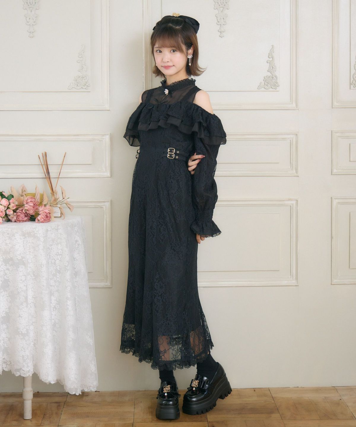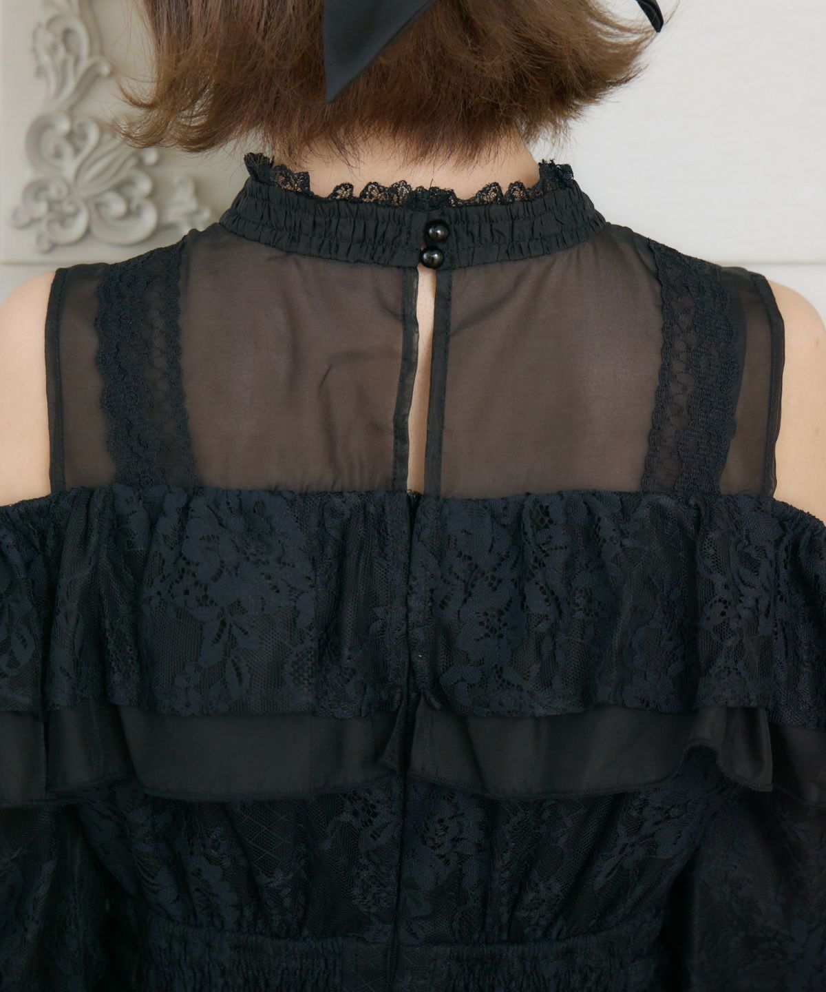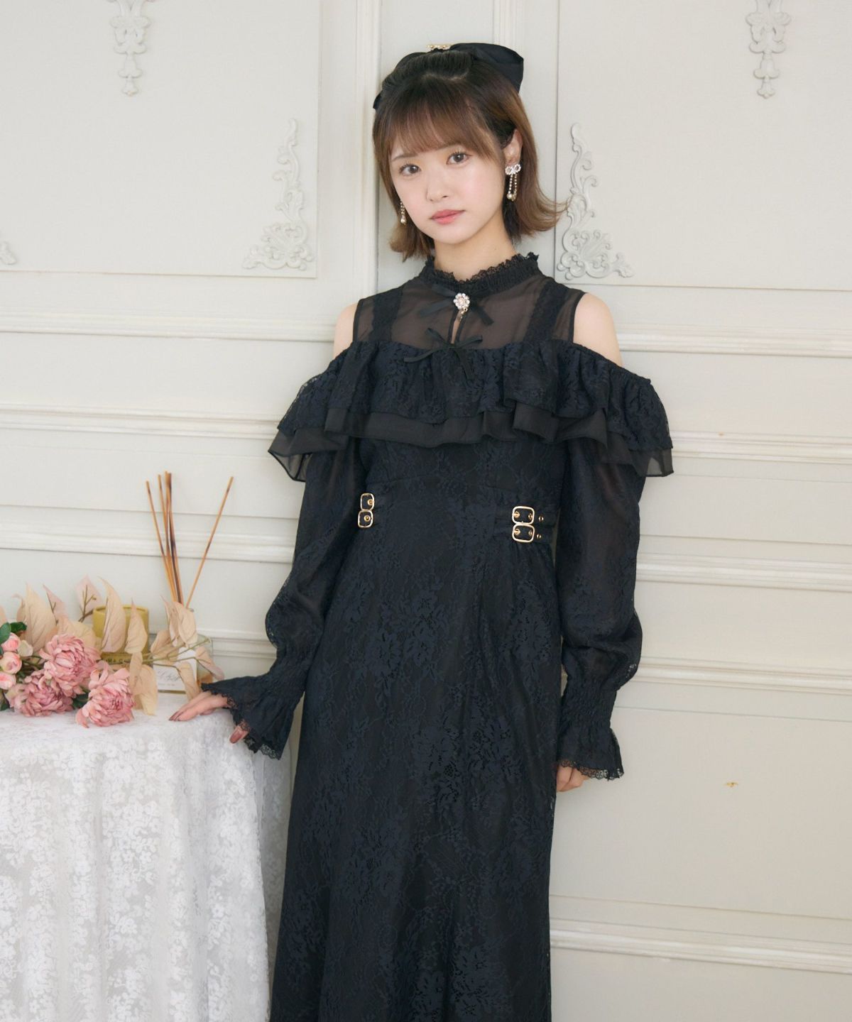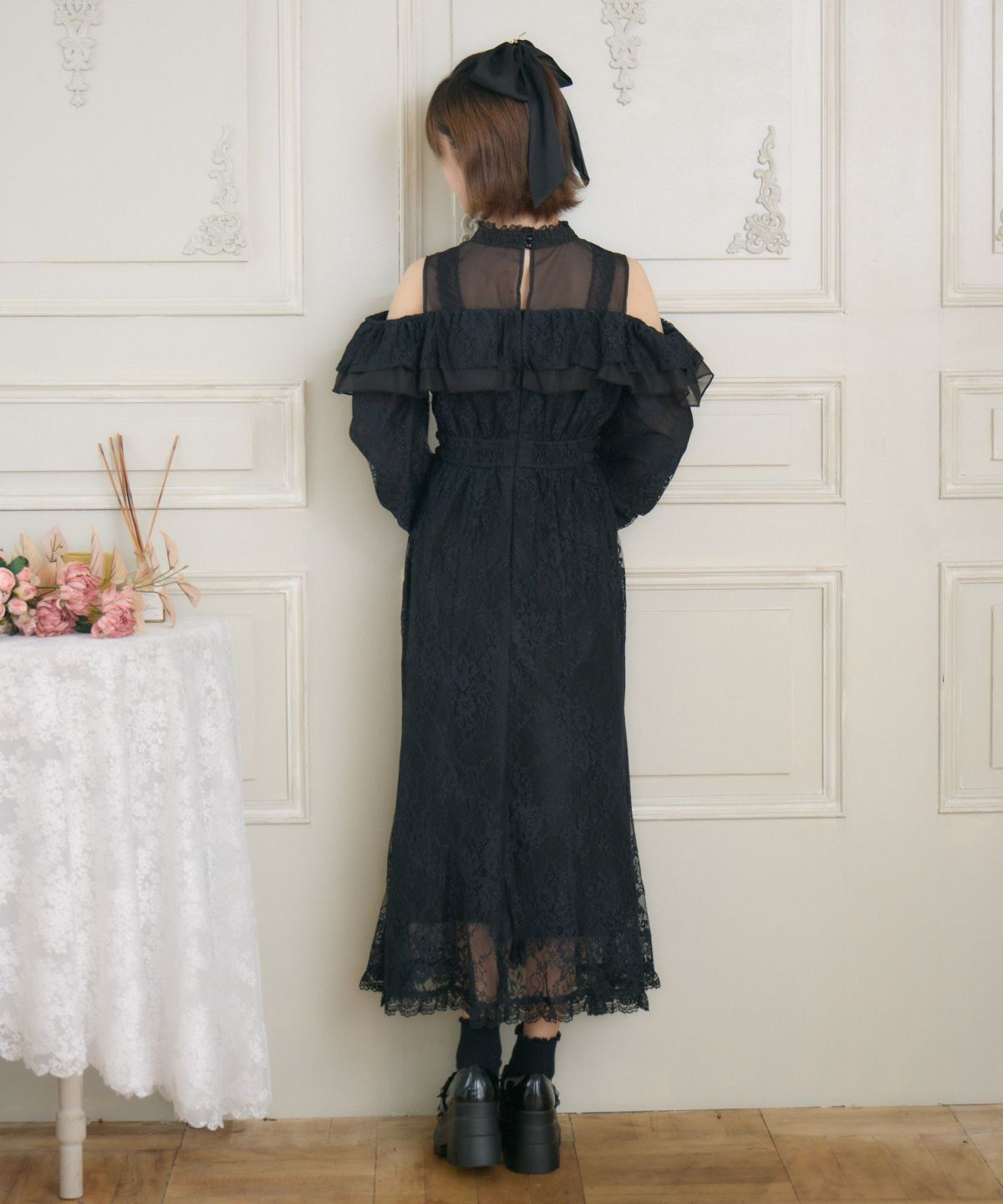 肩開き総レースワンピース