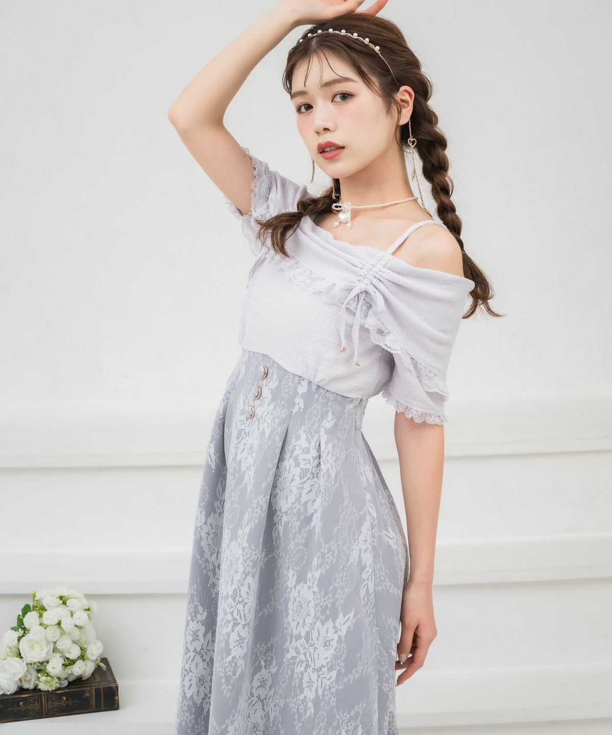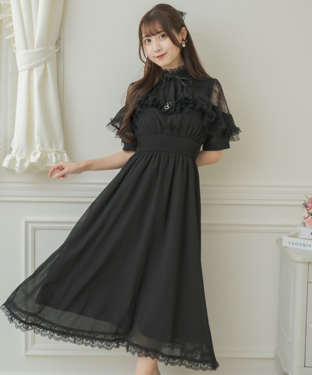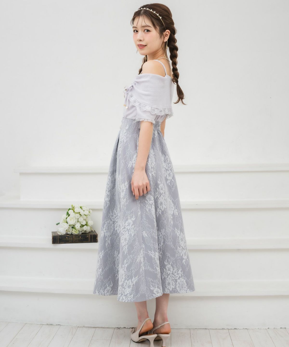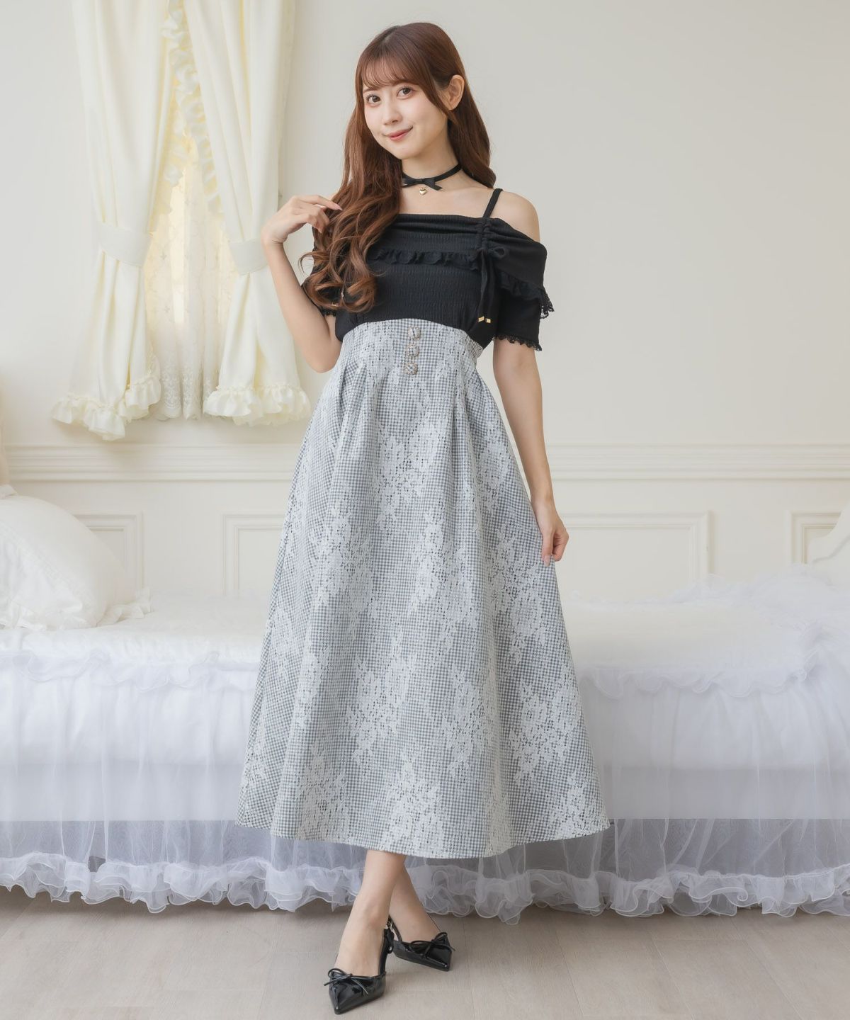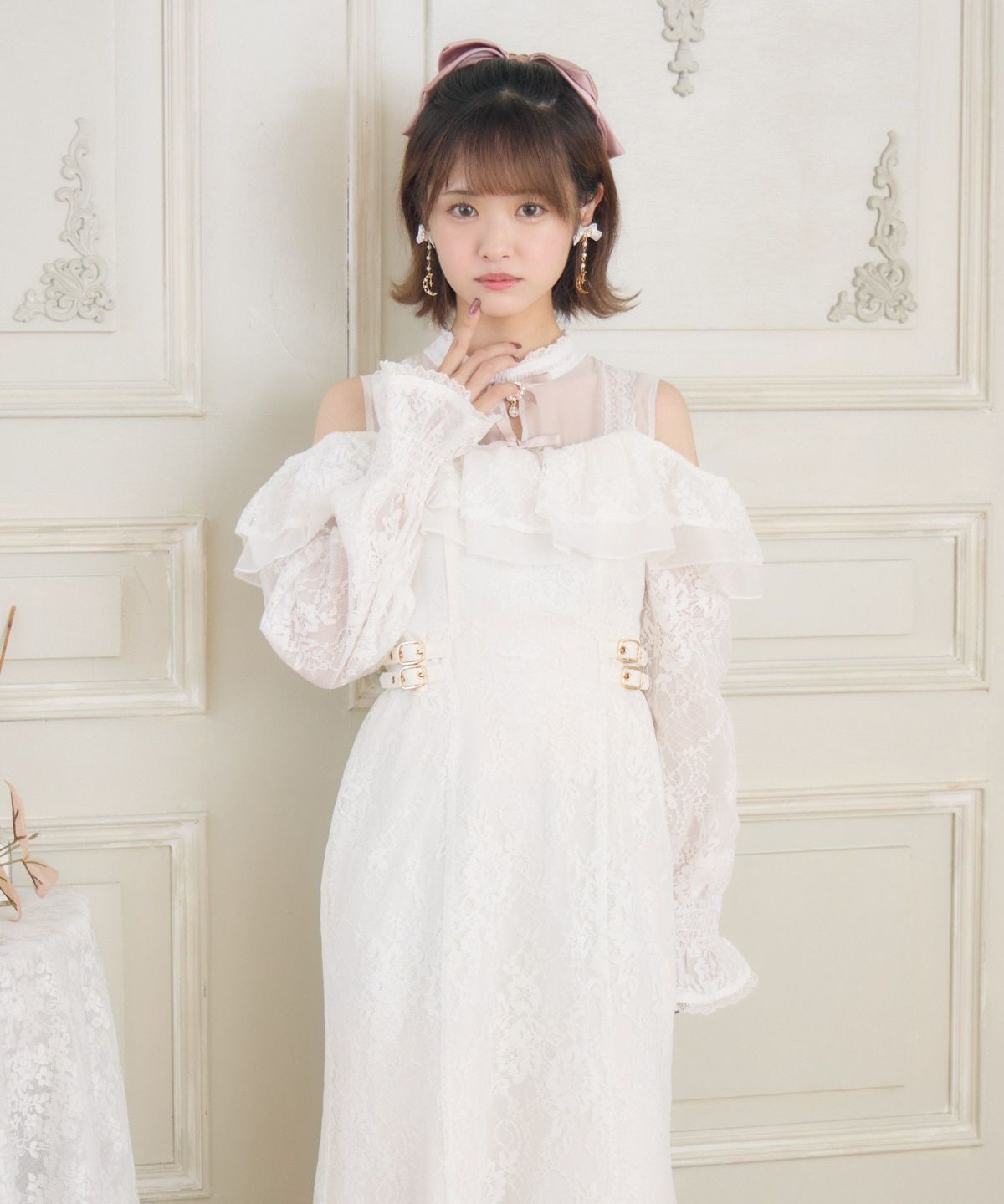 肩開き総レースワンピース