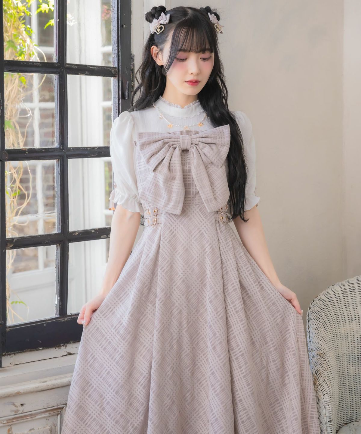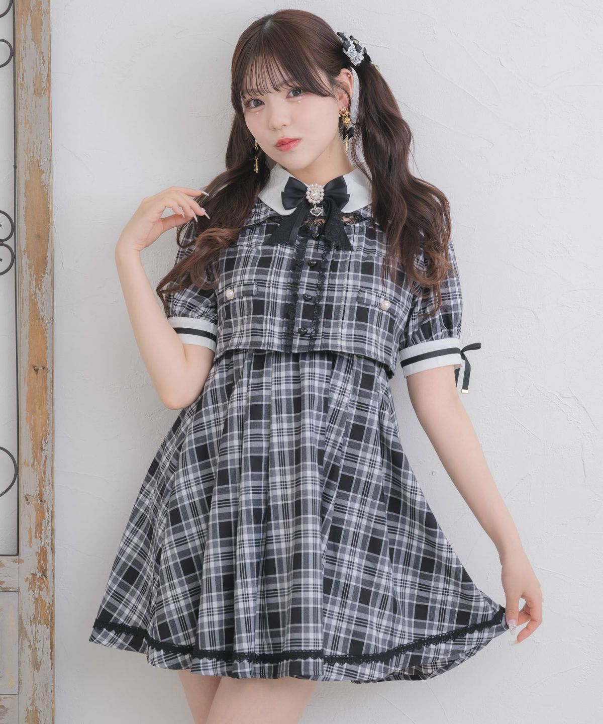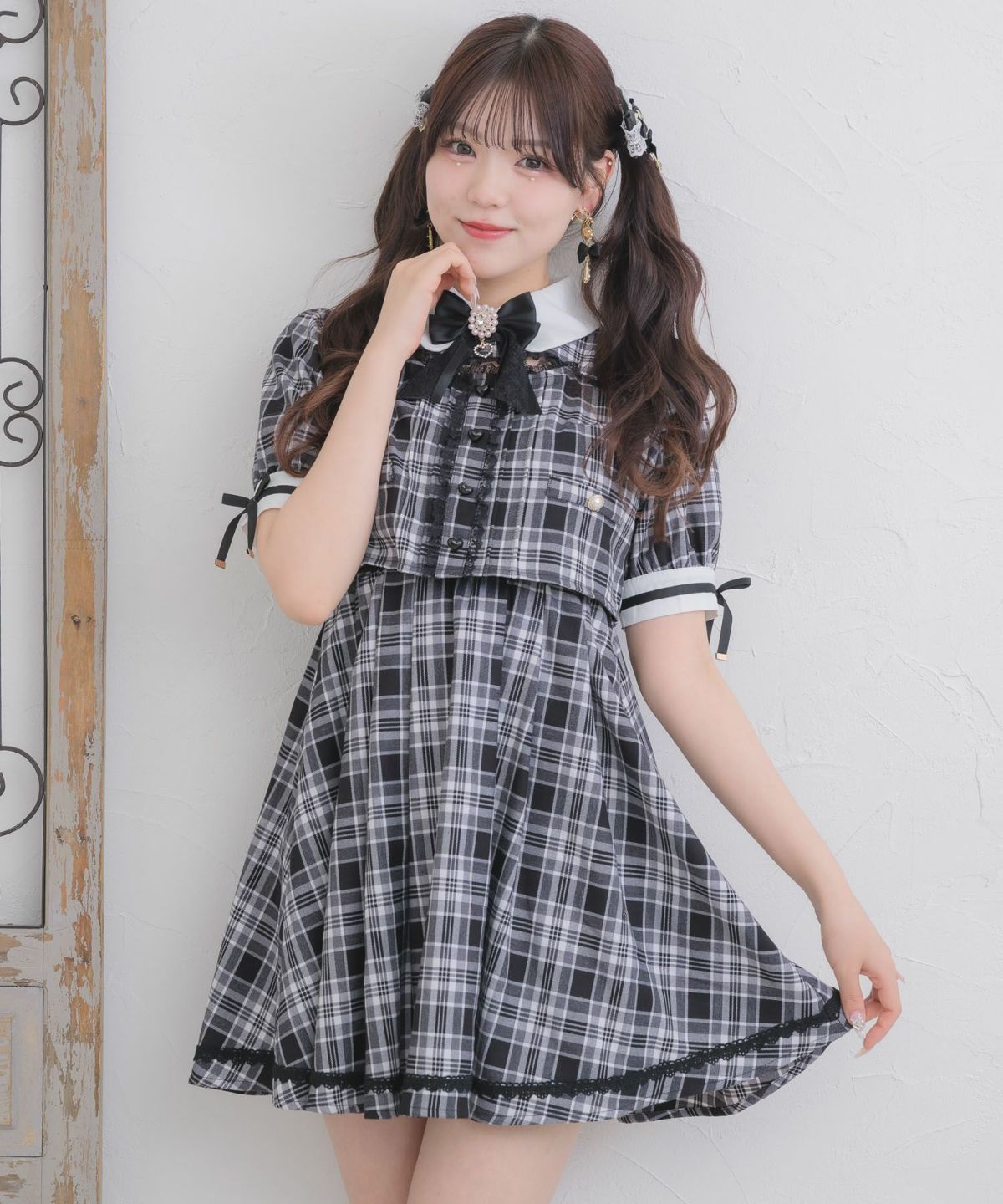 シアーチェックボウタイツイードワンピース