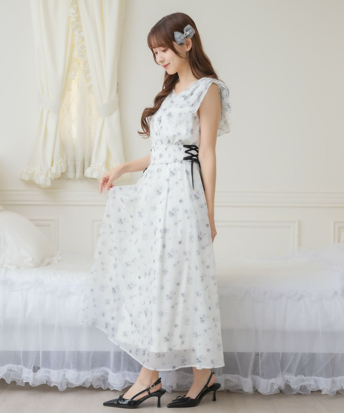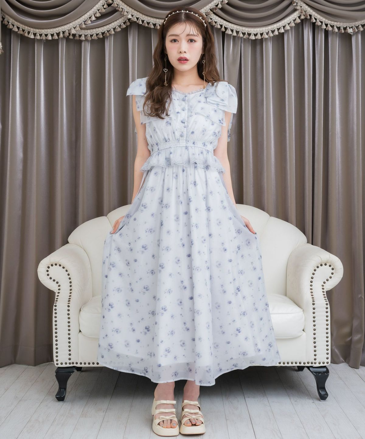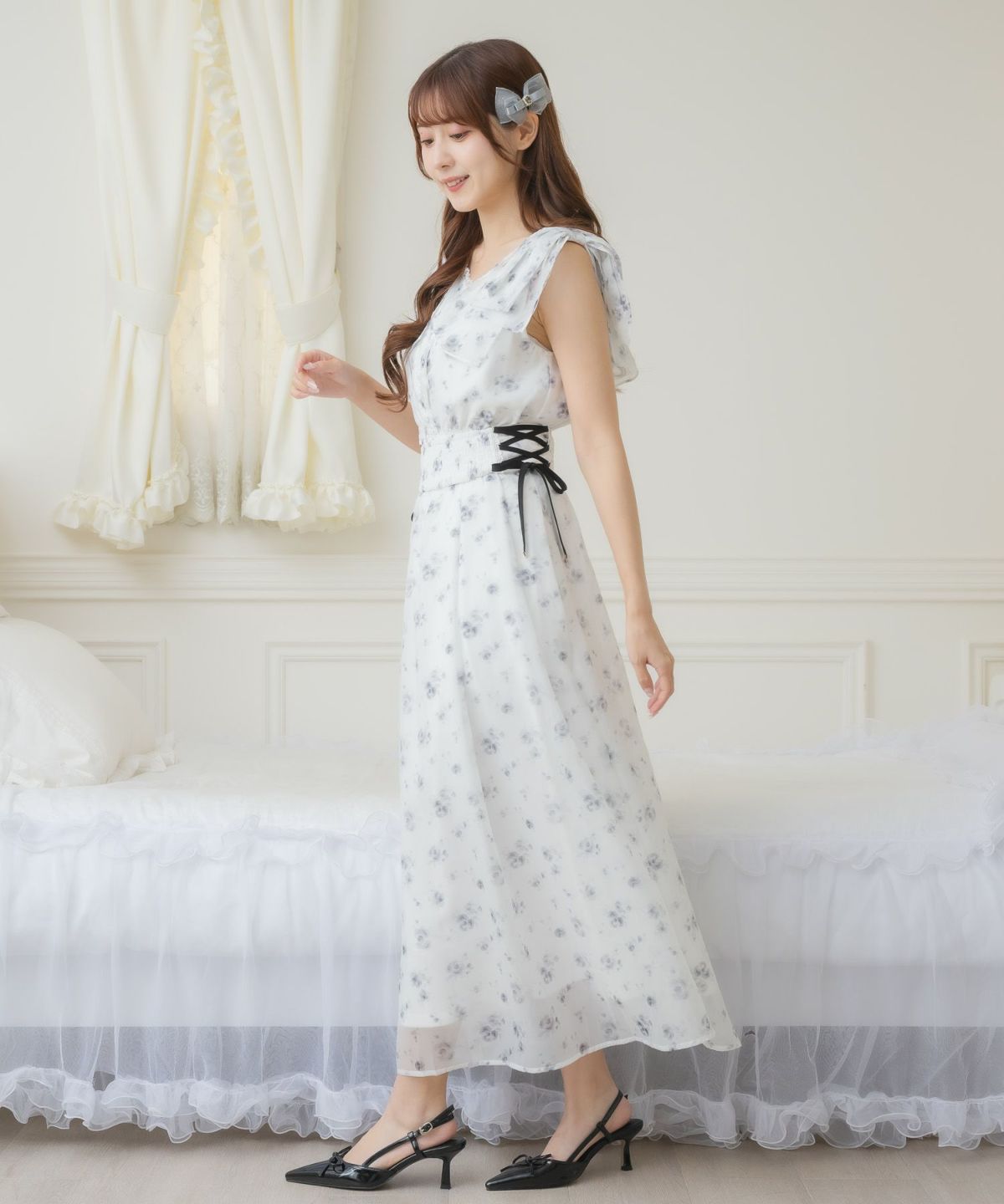 フリルスリーブ花柄ロングワンピース