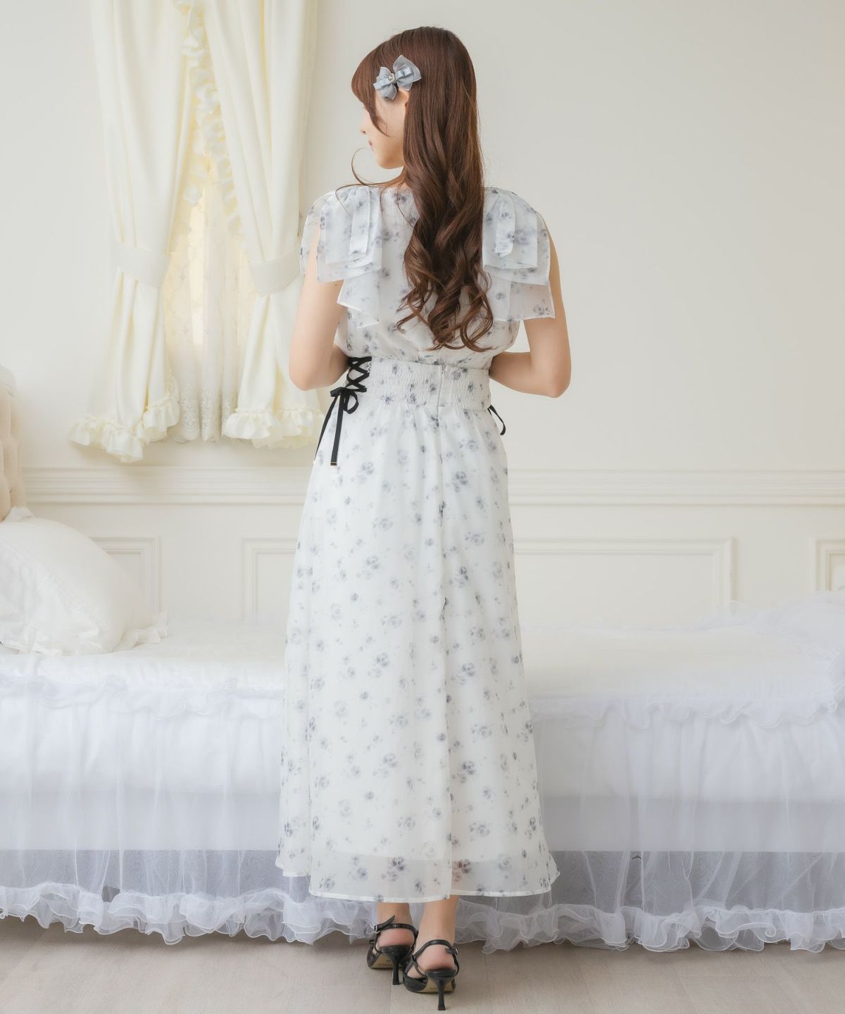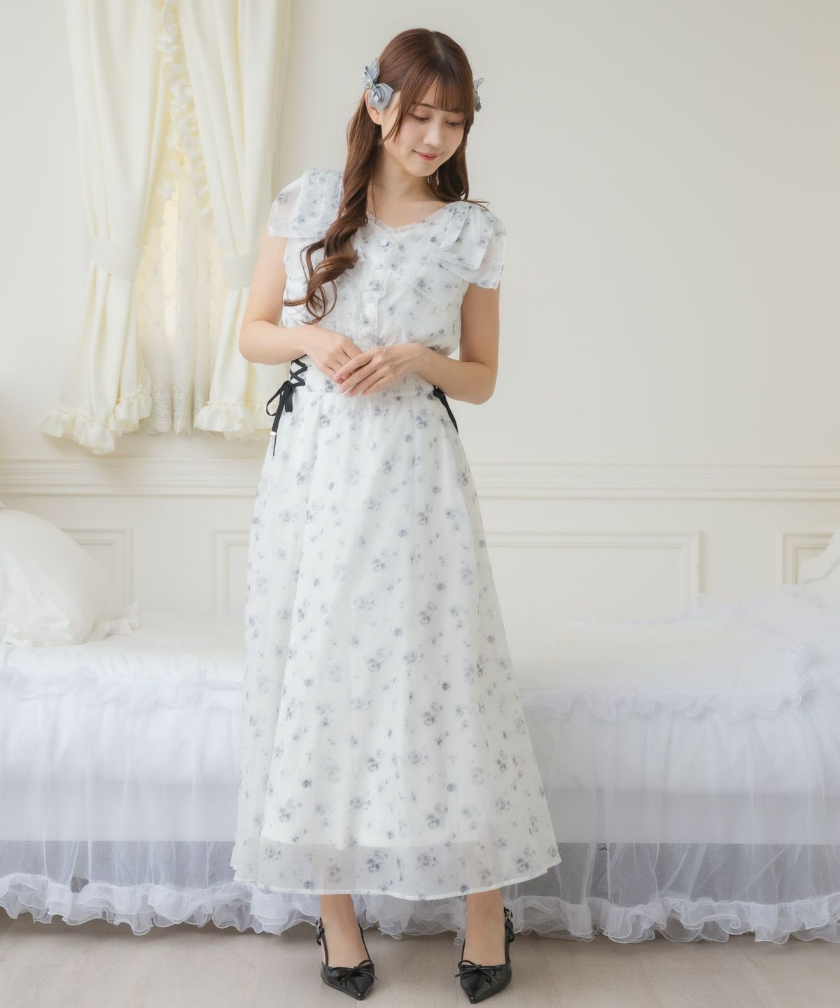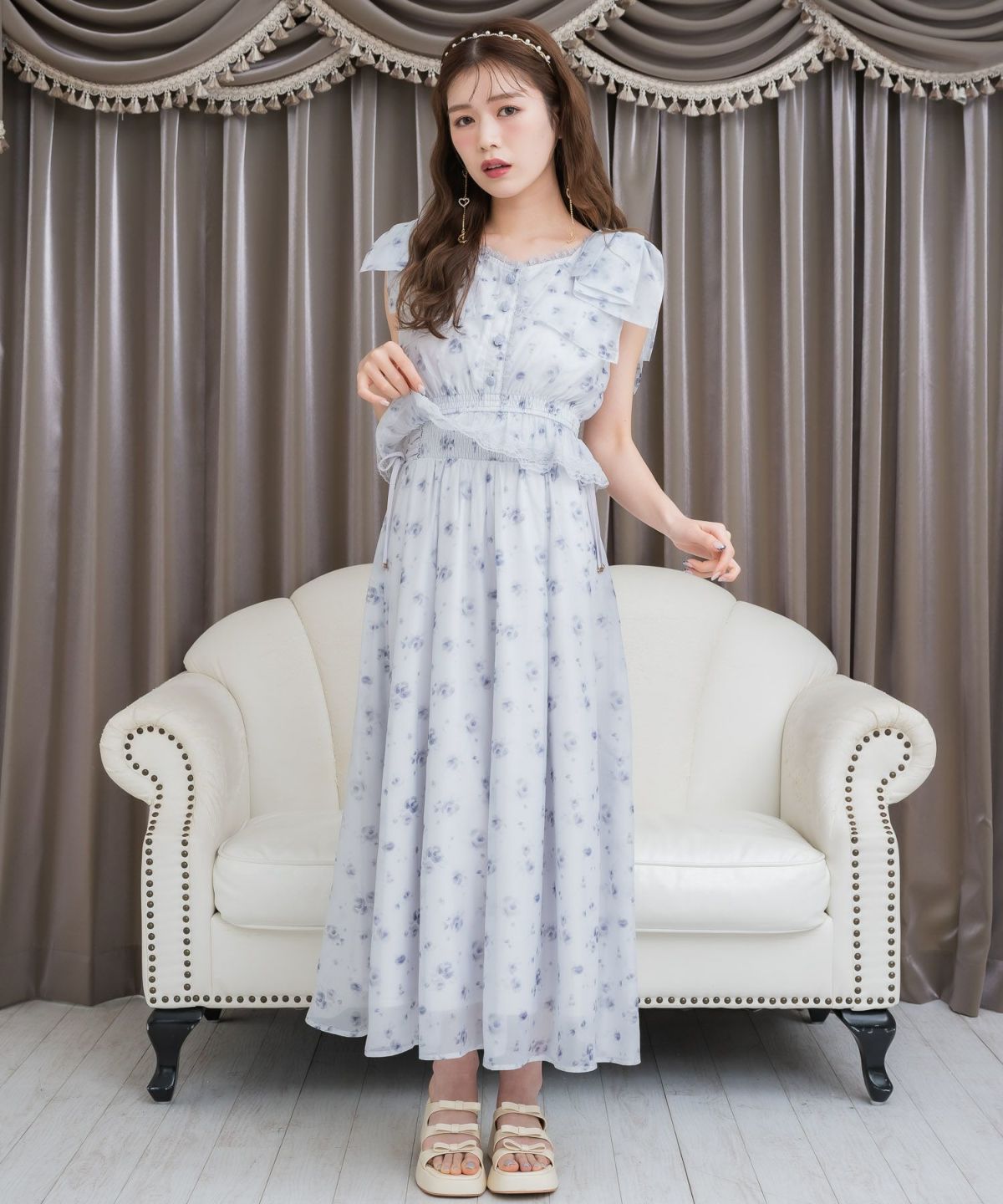 フリルスリーブ花柄ロングワンピース