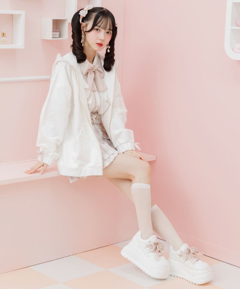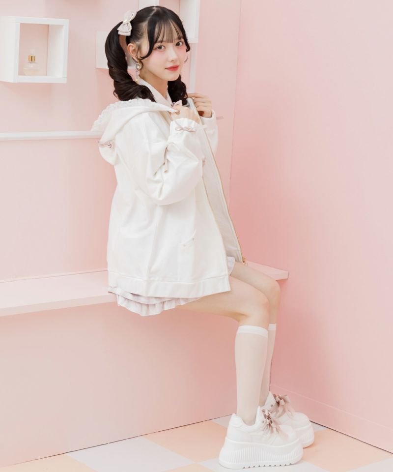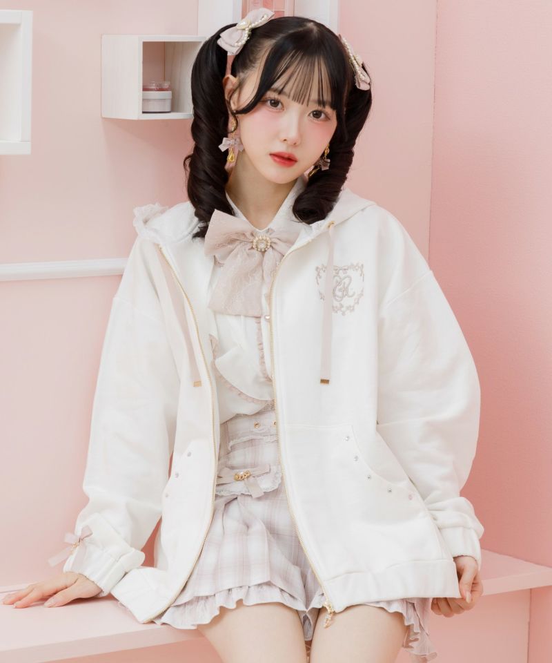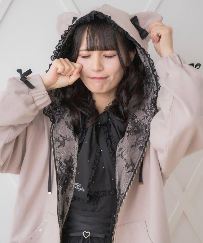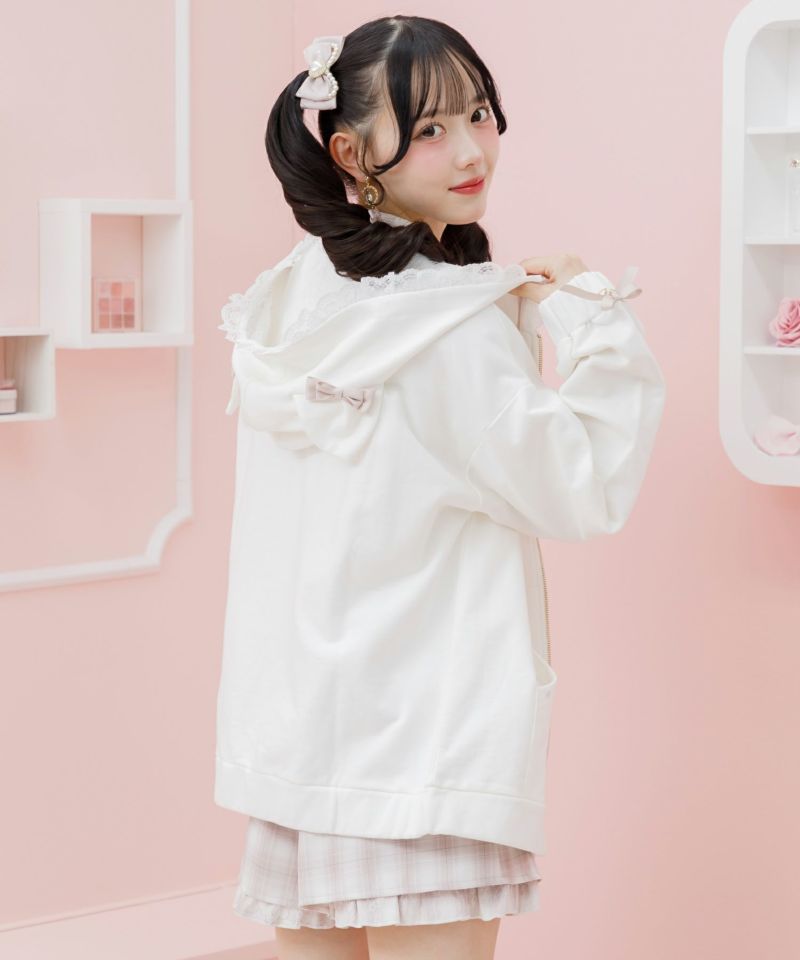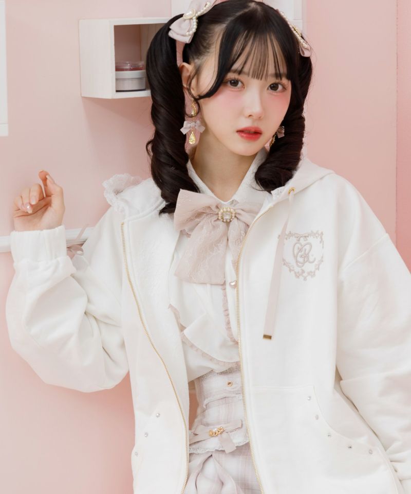 お耳についたリボンがcute♡羽織に便利なパーカーのお目見えです。フードと見返しにレースを重ね鮮度UP♡ちょっと大きめでヒップラインまでダボっと着られるのも嬉しいポイントです。ポケット口にはラインストーンを装飾、ロゴ刺繍も可愛い一押しアイテム。 ※照明の関係で実際のお色味と若干異なる場合がございます。 ※表示のサイズ感と実物は若干異なる場合がございますので、予めご了承ください。 モデル身長ホワイト159cm