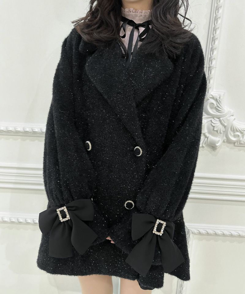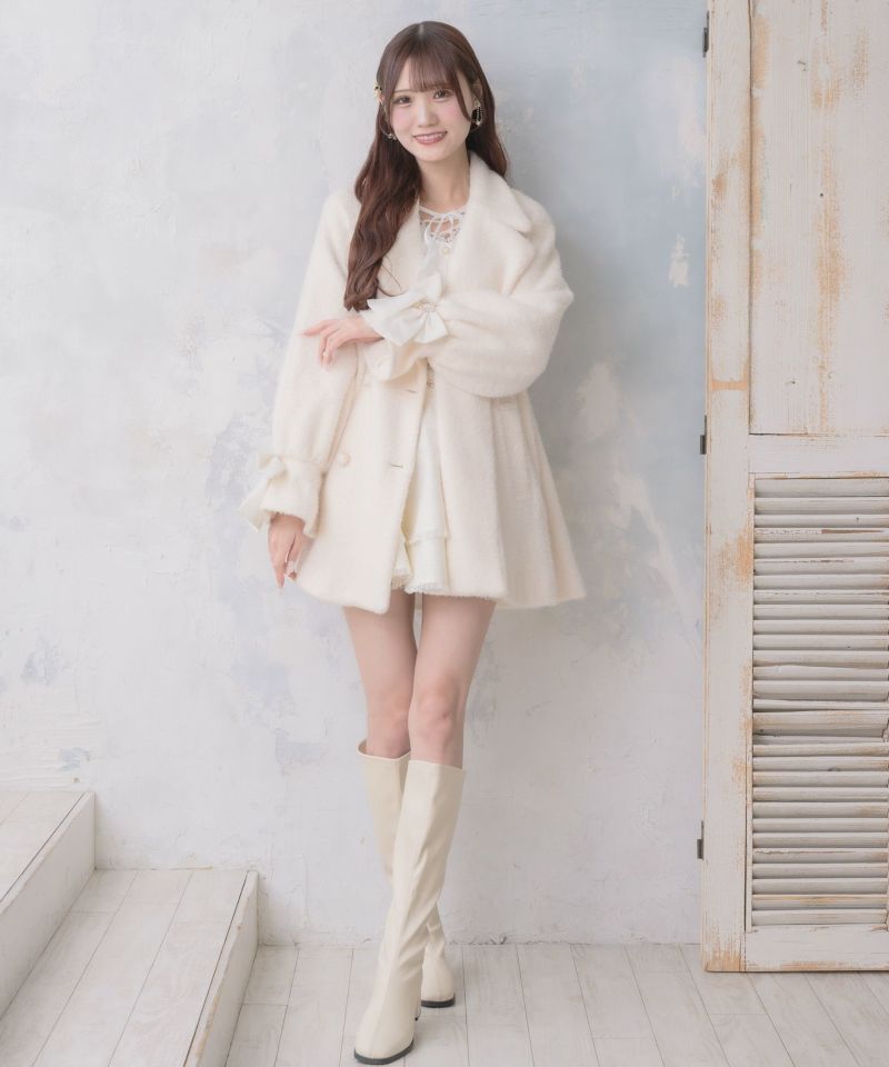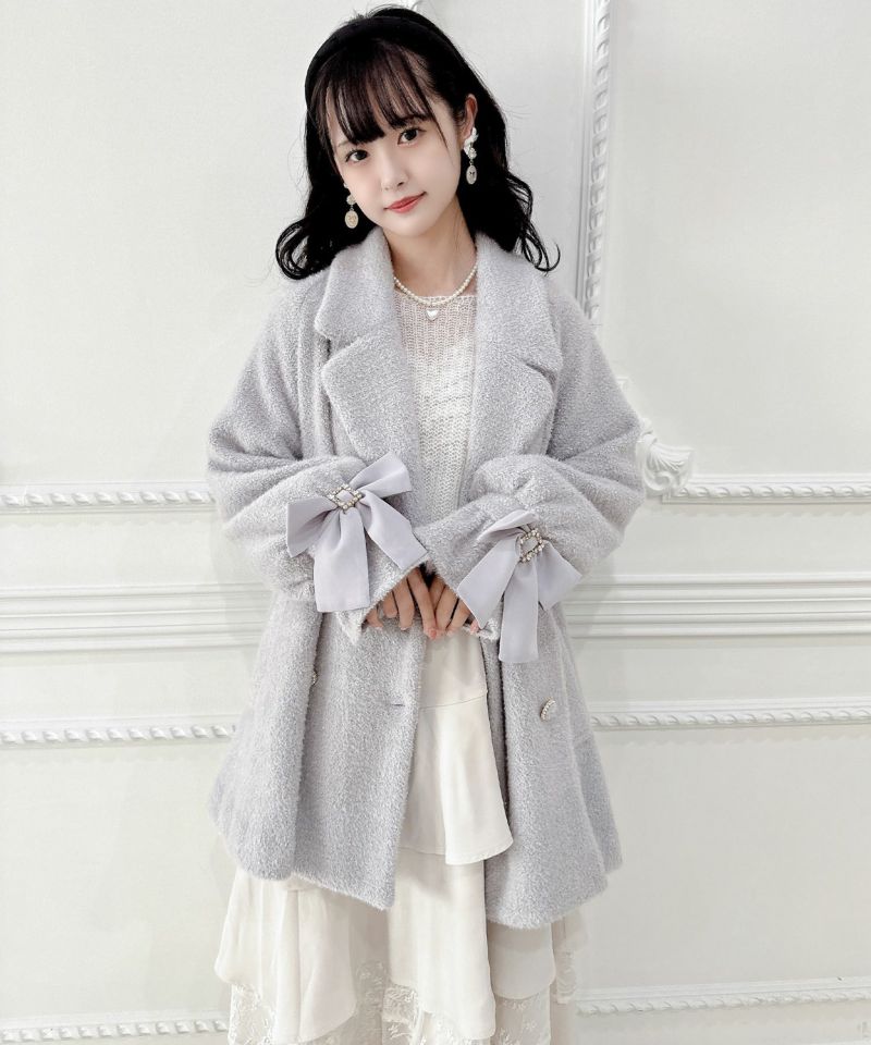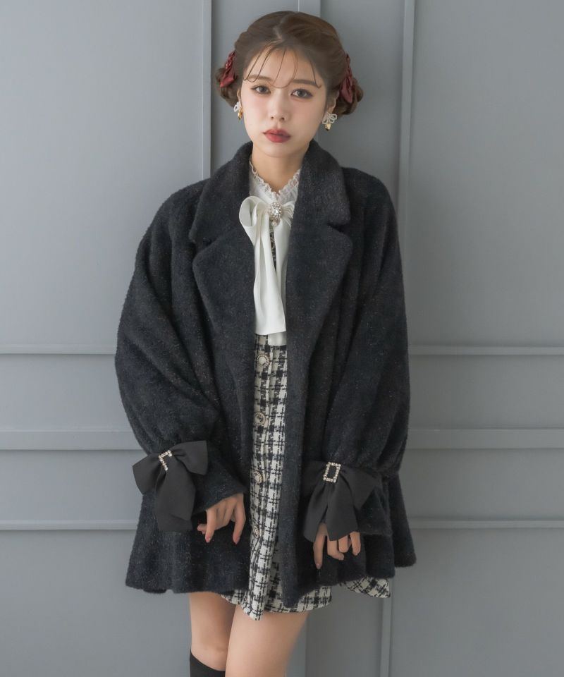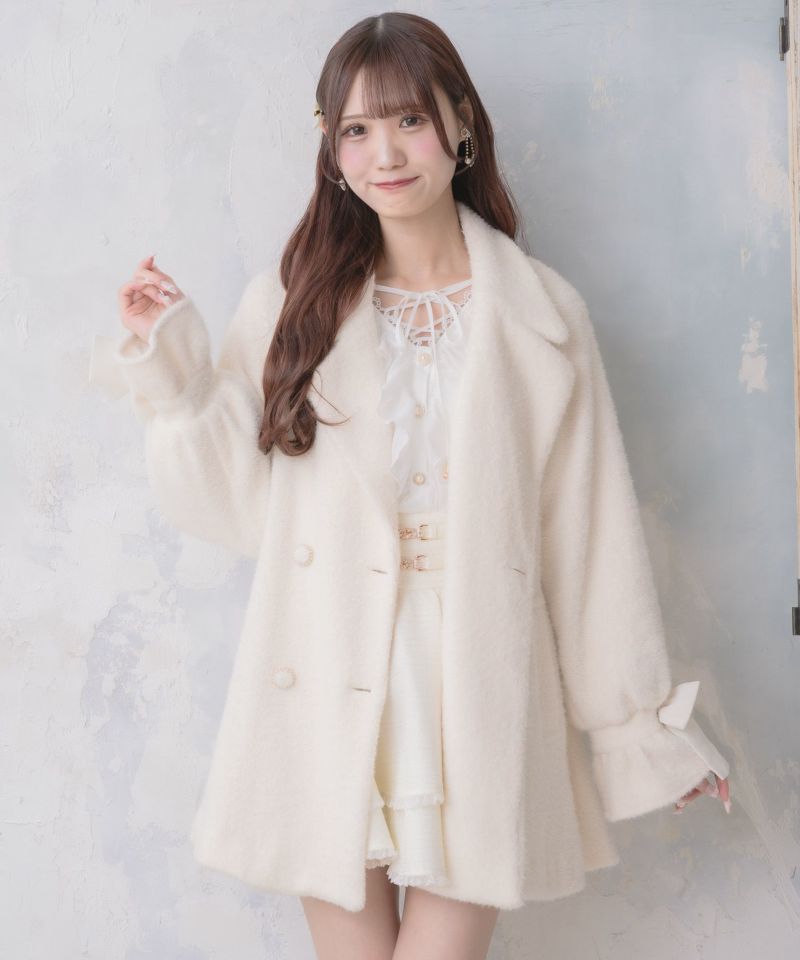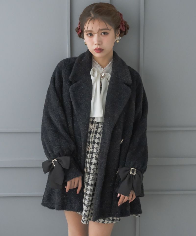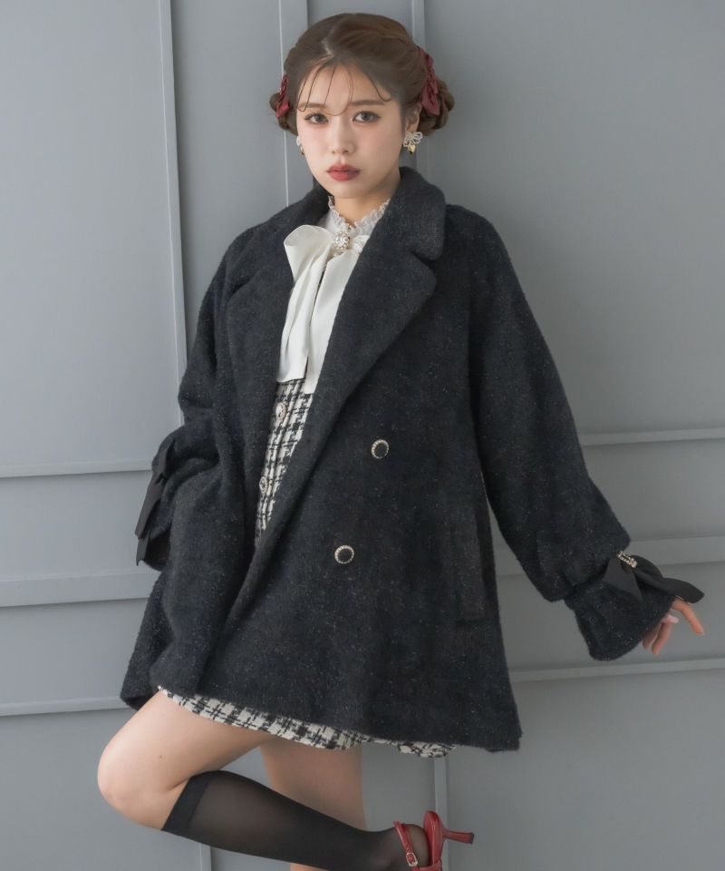 ふわっとしたシャギーでシーズンムードを高めてくれるコート。生地にラメが入っていて、インパクトのある手元のリボンが上品可愛い印象を作ります。Aラインにゆとりのあるシルエットで着込んでも目立ちにくい♪テーラードのWボタンが控えめなアクセントになったシンプなデザインで、様々なコーディネートを楽しめる一枚です。
