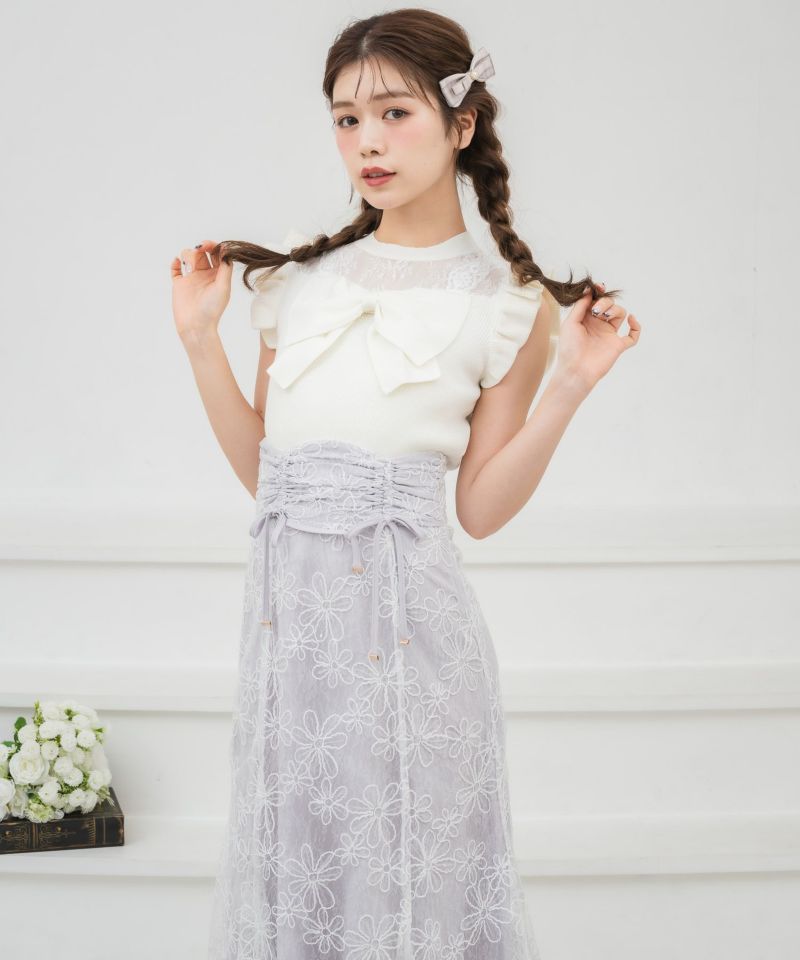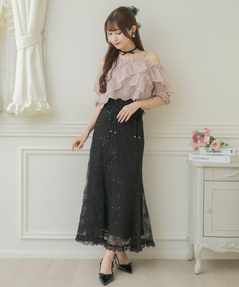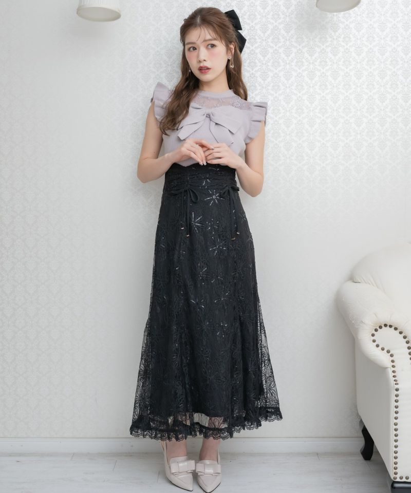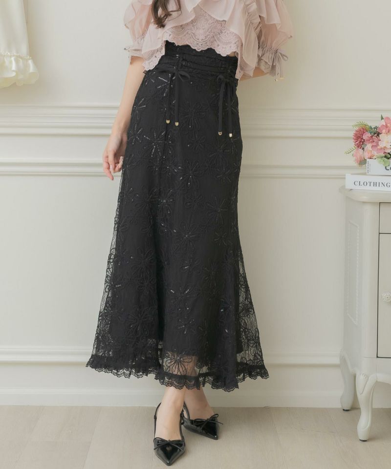 マーメイドラインで旬顔をメイク、ドロスト仕様のウエストベルトがポイントのロングスカート♡シアーに施したフラワー刺繍が重くなりすぎず、華やかなレディムードをONしてくれます。可憐な印象に映えてくれる優秀なアイテム◎ ※照明の関係で実際のお色味と若干異なる場合がございます。 ※表示のサイズ感と実物は若干異なる場合がございますので、予めご了承ください。 モデル身長ブラック・ミント160cm/パープル161cm