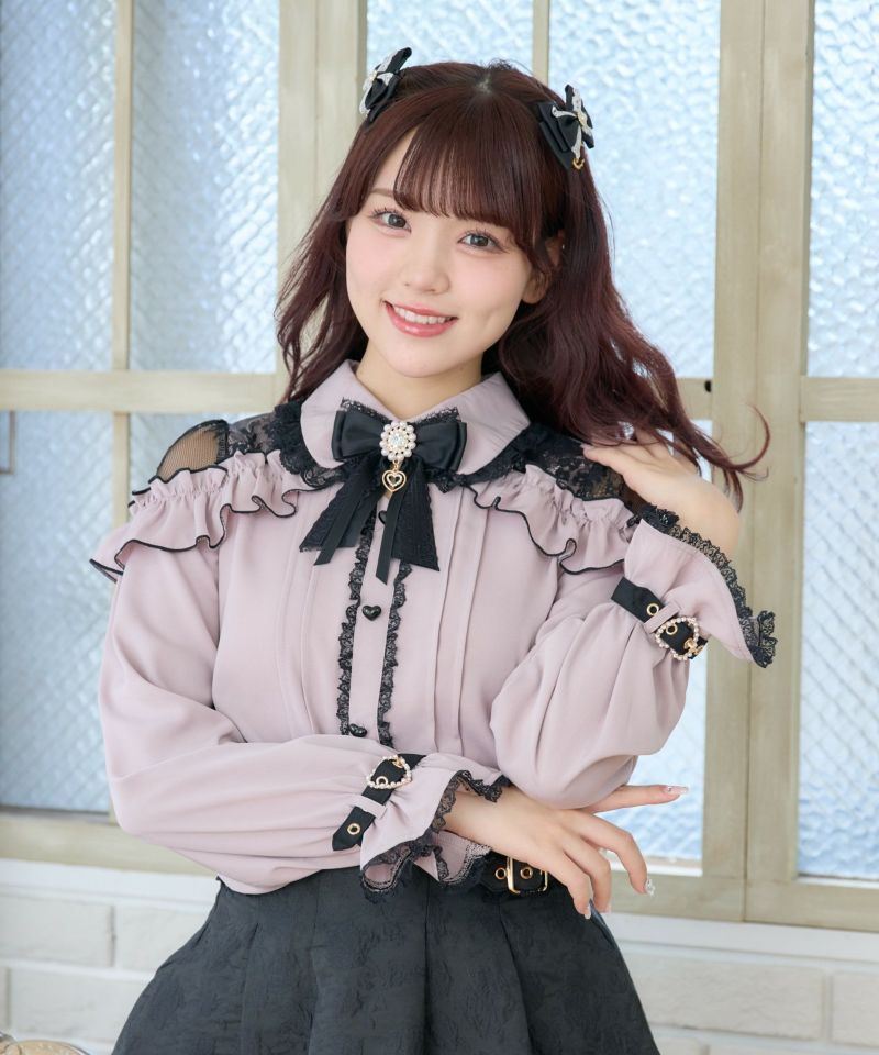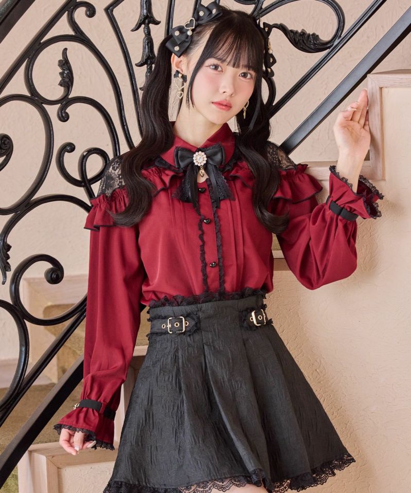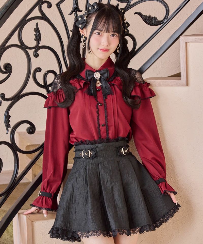 メローフリルがコーディネートを華やかに彩り、ショルダーに施されたレースが抜け感を演出するブラウス。ハート形の釦など、細部まで可愛さにこだわっているのもポイント◎袖口のベルトは地雷要素をプラスしてくれ、きゅっと絞った手元もお洒落映えすること間違いなし♪ ※照明の関係で実際のお色味と若干異なる場合がございます。 ※表示のサイズ感と実物は若干異なる場合がございますので、予めご了承ください。 モデル身長ボルドー159cm/ピンク・ホワイト163cm