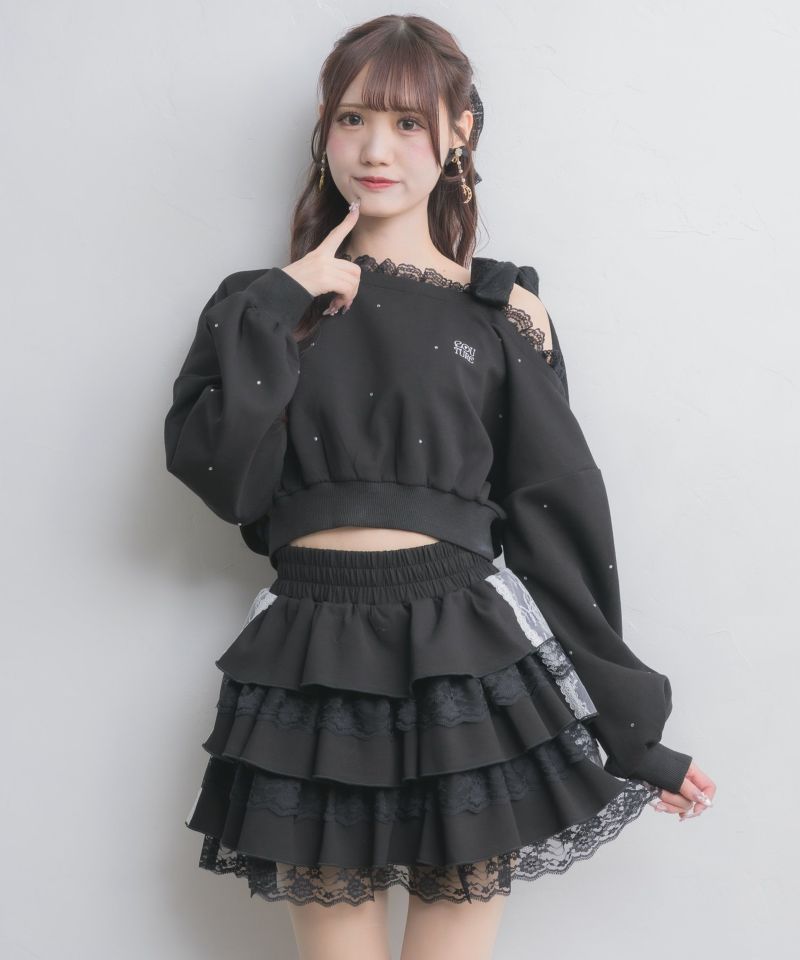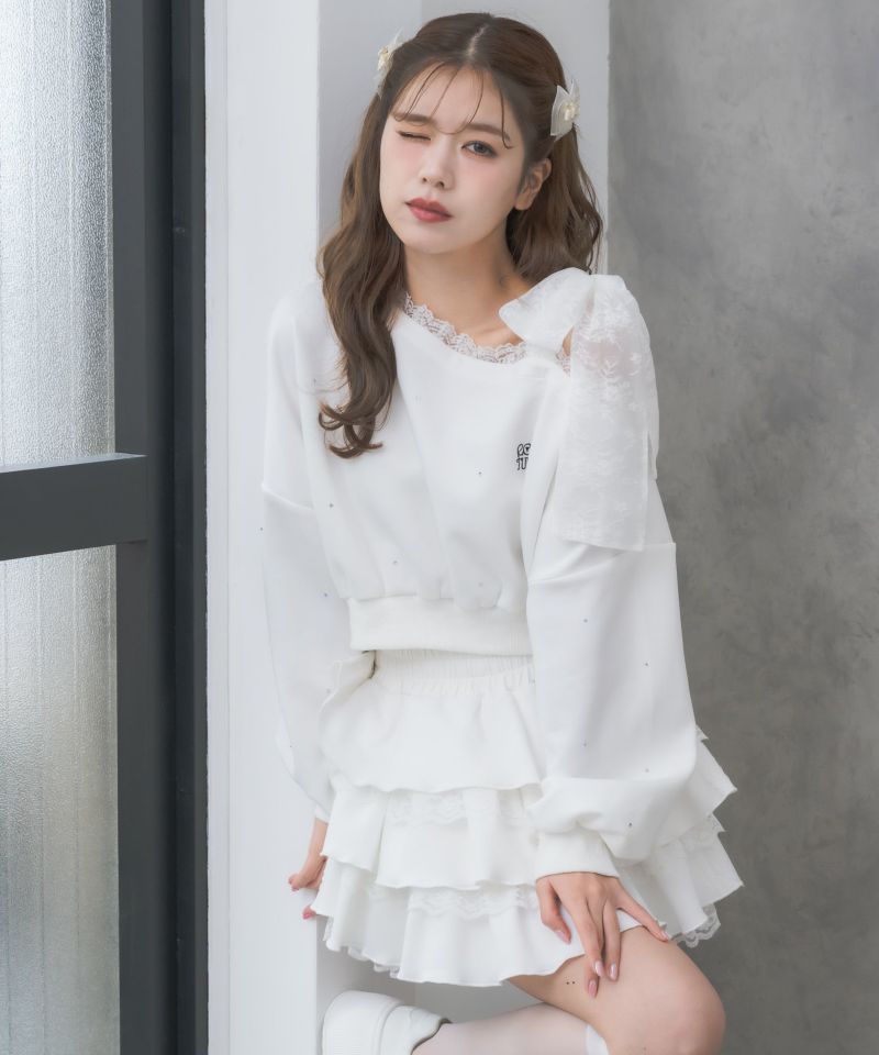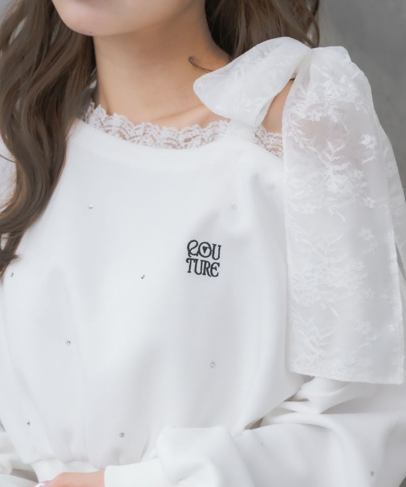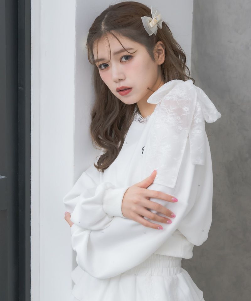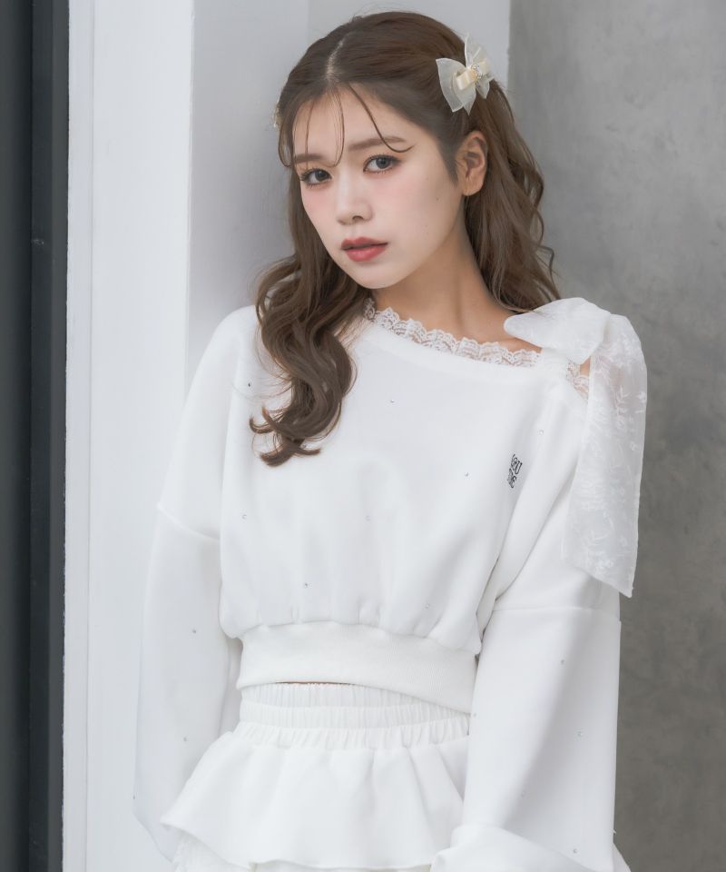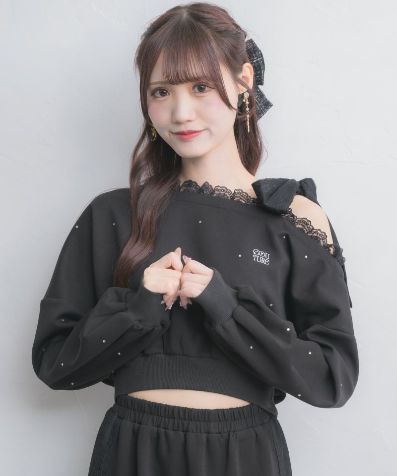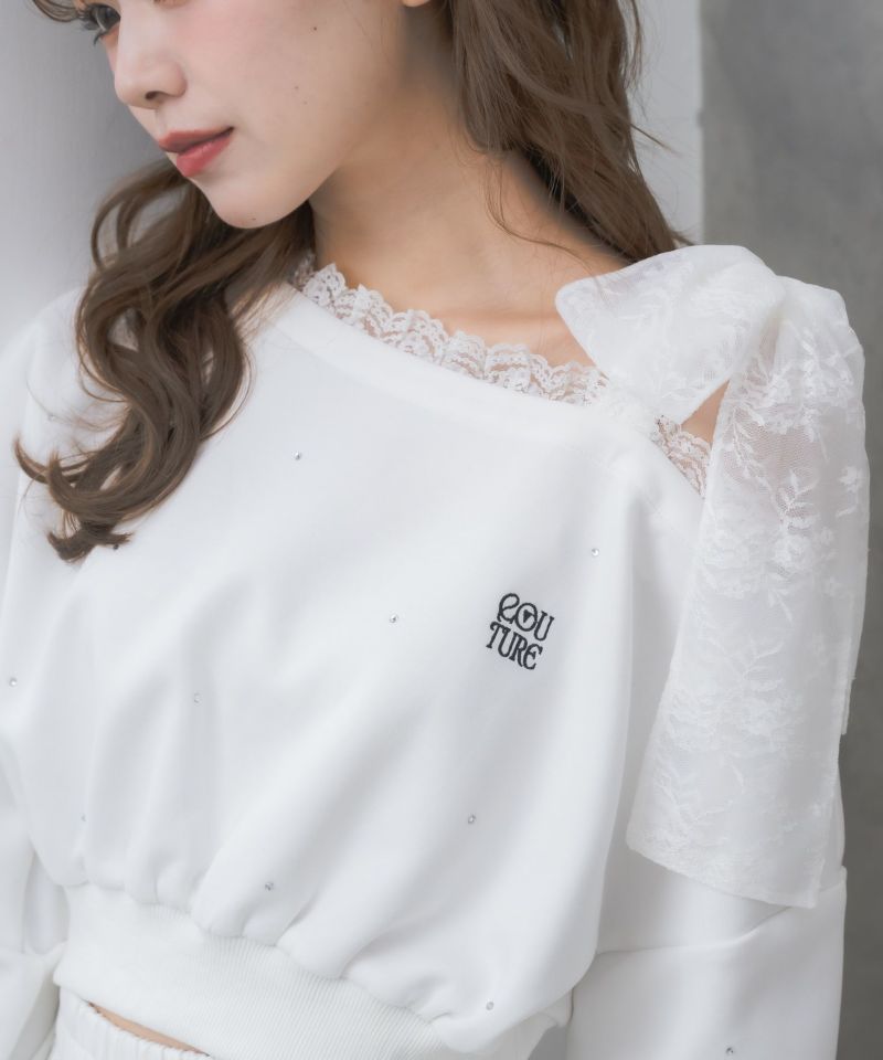 カジュアルだけどお洒落映えできるスウェットトップス。ランダムなストーンが全体的に施されていて光の具合でキラキラと表情をプラスします。ワンショルはインナーのストラップを隠しやすい幅感、レースリボンがお顔まわりの可愛いアクセントになってくれます。ボトムもスウェットアイテムと合わせるとセットアップ風に着用いただけます。