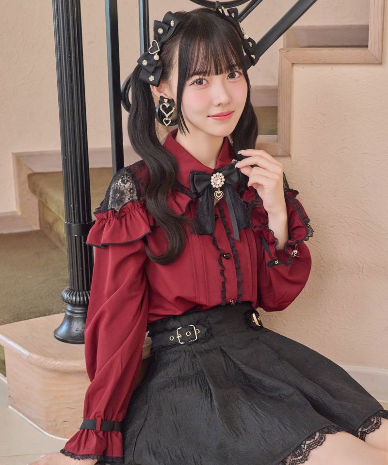 メローフリルがコーディネートを華やかに彩り、ショルダーに施されたレースが抜け感を演出するブラウス。ハート形の釦など、細部まで可愛さにこだわっているのもポイント◎袖口のベルトは地雷要素をプラスしてくれ、きゅっと絞った手元もお洒落映えすること間違いなし♪ ※照明の関係で実際のお色味と若干異なる場合がございます。 ※表示のサイズ感と実物は若干異なる場合がございますので、予めご了承ください。 モデル身長ボルドー159cm/ピンク・ホワイト163cm
