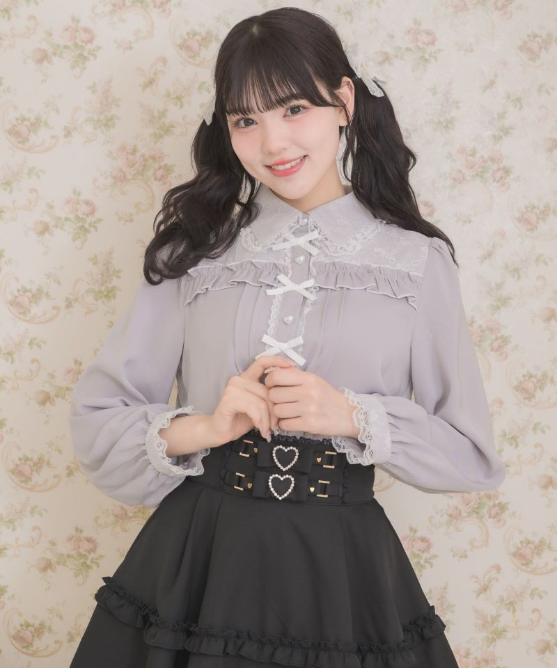 衿とヨークのレース使いが華やかに着飾るブラウスのお目見えです。ロマンティックなハート釦との間にリボンを並べ、ピンタックが縦のラインを強調しスタイルアップを促します♪レースとディテールの色味を揃えたことでスタイリングしやすく設計♡淡い色味のバランスが好印象なアイテムです。