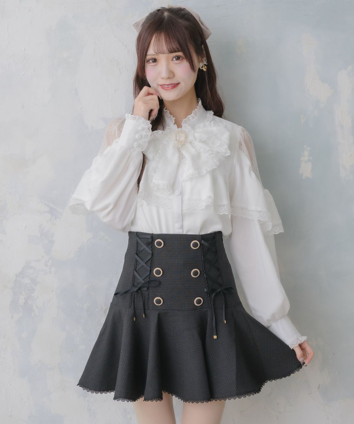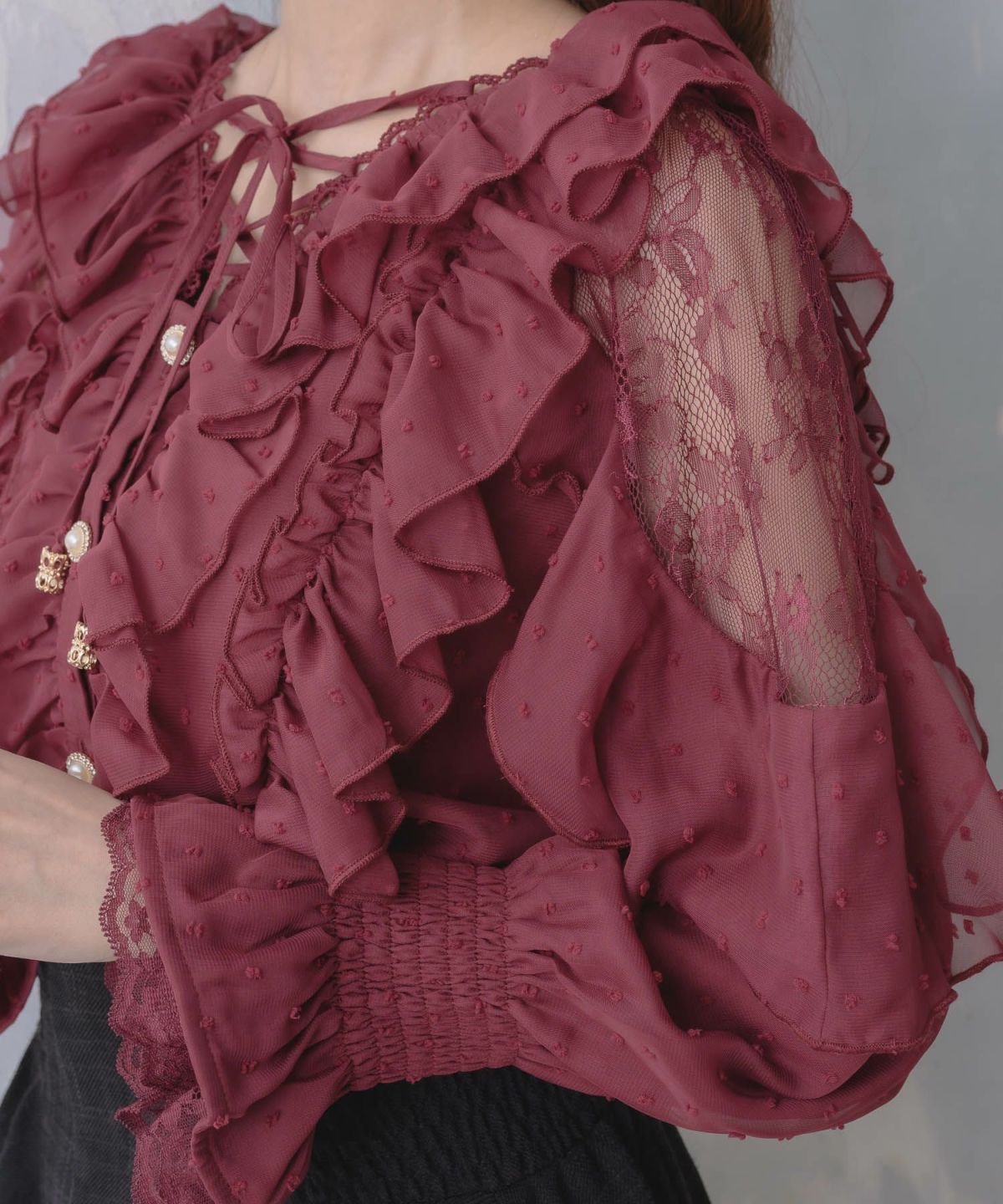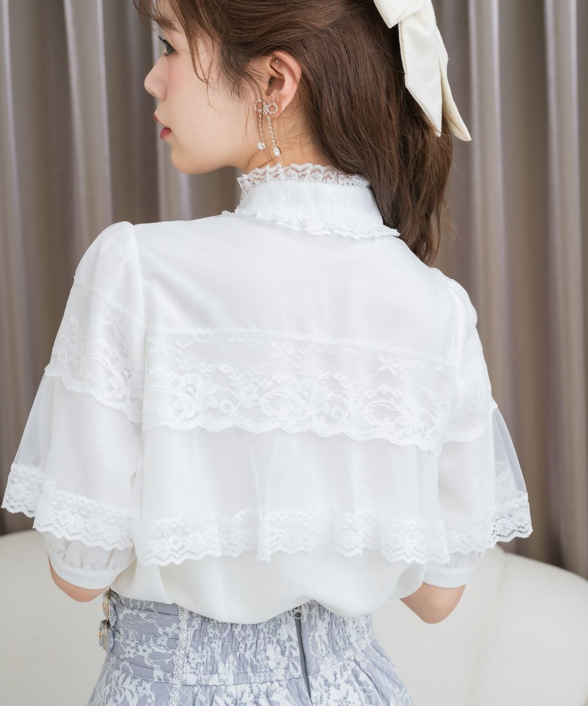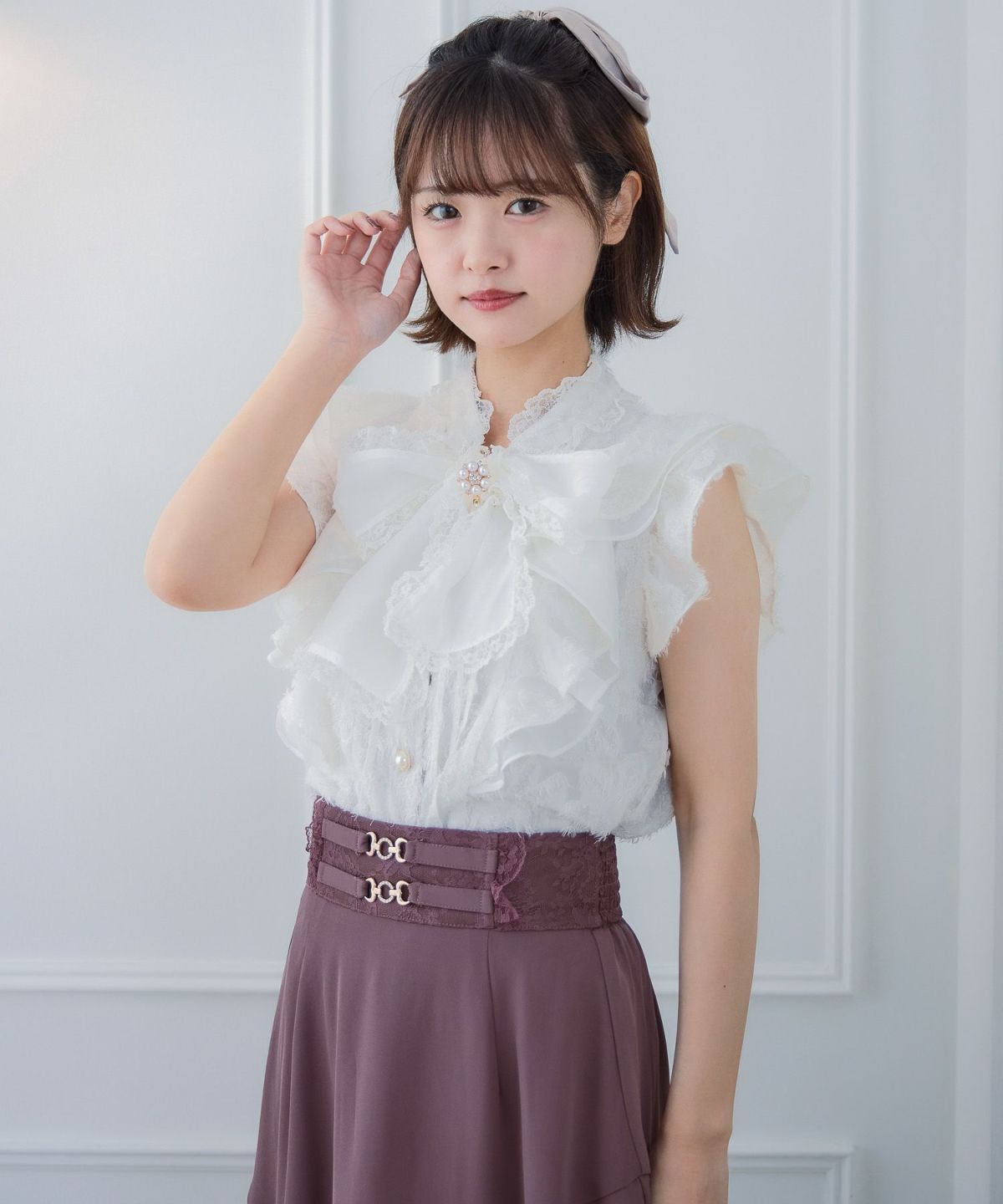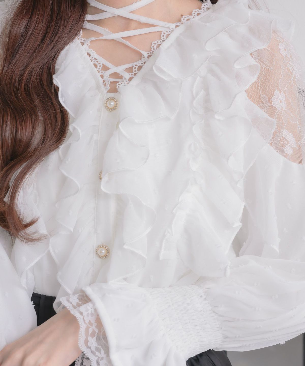 レース切替ボウタイラッフルブラウス